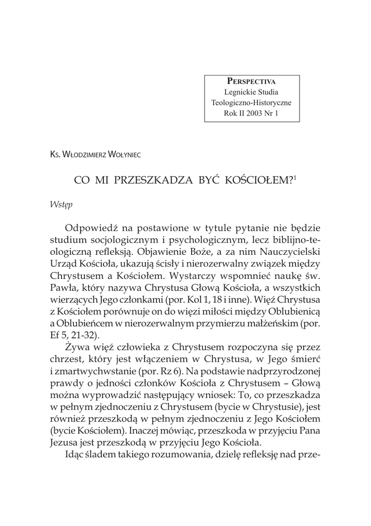 256 Ks. Włodzimierz Wołyniec Perspectiva Legnickie Studia Teologiczno-Historyczne Rok II 2003 Nr 1 Ks. Włodzimierz Wołyniec CO MI PRZESZKADZA BYĆ KOŚCIOŁEM?1 Wstęp Odpowiedź na postawione w tytule pytanie nie będzie studium socjologicznym i psychologicznym, lecz biblijno-teologiczną refleksją. Objawienie Boże, a za nim Nauczycielski Urząd Kościoła, ukazują ścisły i nierozerwalny związek między Chrystusem a Kościołem. Wystarczy wspomnieć naukę św. Pawła, który nazywa Chrystusa Głową Kościoła, a wszystkich wierzących Jego członkami (por. Kol 1, 18 i inne). Więź Chrystusa z Kościołem porównuje on do więzi miłości między Oblubienicą a Oblubieńcem w nierozerwalnym przymierzu małżeńskim (por. Ef 5, 21-32). Żywa więź człowieka z Chrystusem rozpoczyna się przez chrzest, który jest włączeniem w Chrystusa, w Jego śmierć i zmartwychwstanie (por. Rz 6). Na podstawie nadprzyrodzonej prawdy o jedności członków Kościoła z Chrystusem – Głową można wyprowadzić następujący wniosek: To, co przeszkadza w pełnym zjednoczeniu z Chrystusem (bycie w Chrystusie), jest również przeszkodą w pełnym zjednoczeniu z Jego Kościołem (bycie Kościołem). Inaczej mówiąc, przeszkoda w przyjęciu Pana Jezusa jest przeszkodą w przyjęciu Jego Kościoła. Idąc śladem takiego rozumowania, dzielę refleksję nad prze- Co mi przeszkadza być Kościołem? 257 szkodami w byciu Kościołem na dwie części. Pierwsza omawia przeszkody w przyjęciu Osoby Jezusa Chrystusa na podstawie Świętej Ewangelii. Druga podejmuje próbę omówienia przeszkód i trudności w byciu Kościołem dzisiaj. 1. Przeszkody w przyjęciu Osoby Chrystusa. Na podstawie Ewangelii można wyróżnić dwa kręgi osób, którym trudno jest przyjąć Osobę Chrystusa. Pierwszy krąg stanowią osoby bliskie Jezusa, Jego krewni i uczniowie, a drugi krąg stanowią przedstawiciele władzy religijnej i p olitycznej. a) Osoby bliskie Jezusa. Jeśli chodzi o pierwszy krąg, to należy zauważyć, że są to ludzie, którzy pozornie znają Jezusa, idą za Nim, słuchają Jego słów i widzą Jego czyny. Nie przyjmują oni wrogiej postawy wobec Zbawiciela. A jednak mają trudności w przyjęciu Jego Boskiej Osoby. Dlaczego? Pierwszą przyczyną jest niezrozumienie tego, Kim On jest i jaka jest Jego misja? W ewangelii św. Jana czytamy o krewnych Jezusa: „Rzekli więc bracia do Niego: «Wyjdź stąd i idź do Judei, aby i uczniowie Twoi ujrzeli czyny, których dokonujesz. Nikt bowiem nie dokonuje niczego w ukryciu, jeżeli chce się publicznie ujawnić. Skoro takich rzeczy dokonujesz, to okaż się światu»” (J 7, 1-9). Krewni myślą o misji Chrystusa zgodnie z ówczesnymi wyobrażeniami mesjańskimi. Widzą w Nim teokratyczno-nacjonalistycznego przywódcę. Chcą, aby do takiej Jego misji przekonali się przywódcy narodu w Jerozolimie, w centrum życia politycznego i religijnego2. Myślenie krewnych Jezusa wskazuje na brak wiary w prawdziwą Jego misję. Ewangelista pisze: „Bo nawet Jego bracia nie 1 Wykład wygłoszony w Bolesławcu dnia 27 października 2002 roku w ramach Dni Kultury Chrześcijańskiej. 2 L. Stachowiak. Ewangelia według św. Jana (Pismo Święte Nowego Testamentu w 12 tomach. Wstęp – Przekład z oryginału – Komentarz. Red. E. 258 Ks. Włodzimierz Wołyniec wierzyli w Niego” (J 7, 5). Tymczasem Jezus, w odpowiedzi na niezrozumienie i niewiarę krewnych, objawia prawdę o sobie i swojej misji: „Dla Mnie stosowny czas jeszcze nie nadszedł” (J 7, 6) oraz „Ja jeszcze nie idę na to święto, bo czas mój jeszcze się nie wypełnił” (J 7, 8). Słowa te mają głębsze, teologiczne znaczenie. Zbawcza misja Jezusa dokona się przez mękę, śmierć i zmartwychwstanie. Jezus „nie idzie” teraz na to święto, to znaczy nie idzie teraz do Ojca, ponieważ czas jeszcze nie dojrzał i nie wypełnił się Boży plan zbawienia3. Warto zauważyć, że niezrozumienie prawdziwej misji Chrystusa przez Jego krewnych prowadzi w konsekwencji do próby powstrzymania Jego działalności. Wspomina o tym św. Marek: „Potem przyszedł do domu, a tłum znów się zbierał, tak że nawet posilić się nie mogli. Gdy to usłyszeli Jego bliscy, wybrali się, żeby Go powstrzymać. Mówiono bowiem: Odszedł od zmysłów” (Mk 3, 20-21). Osąd działalności Jezusa jest bardzo surowy i poważny. Reakcja krewnych Jezusa świadczy o tym, że część Jego rodziny podziela ten osąd4. Drugą przyczyną trudności w przyjęciu Osoby Chrystusa przez Jego krewnych jest zgorszenie. Czytamy o tym w opisie wydarzeń w Nazarecie, kiedy Jezus w synagodze czyta i wyjaśnia fragment Księgi Izajasza. Zgorszenie mieszkańców Nazaretu wywołuje fakt, że jest On jednym z nich, prostym, zwyczajnym synem cieśli. Ewangelista pisze, że wielu pyta ze zdziwieniem: „Skąd On to ma? I co za mądrość, która jest Mu dana? I takie cuda dzieją się przez Jego ręce! Czyż nie jest to cieśla, syn Maryi, a brat Jakuba, Józefa, Judy i Szymona? (...). I powątpiewali [gorszyli się] o Nim” (por. Mk 6, 1-6). Św. Łukasz umieszcza opis tego wydarzenia zaraz na początku działalności Jezusa. Reakcja mieszkańców Nazaretu jest gwałtowna: „Porwali Go z miejsca, wyrzucili Go z miasta i wyprowadzili na stok góry, na której ich miasto było zbudowane, aby Go strącić” (Łk Dąbrowski, F. Gryglewicz). Poznań – Warszawa 1975 s. 225. 3 R. E. Brown. Giovanni. Commento al Vangelo spirituale. (Tłum. włoskie A. Sorsaja, M. T. Petrozzi). Assisi 1986 s. 398-399. Co mi przeszkadza być Kościołem? 259 4, 29-30). W ten sposób św. Łukasz ukazuje Jezusa jako głosiciela Ewangelii, któremu się nie powiodło, człowieka bez sukcesu, który zaraz na początku ponosi porażkę5. Uczniowie Jezusa mają podobne trudności w przyjęciu Jego Osoby jak krewni. Pierwszy rodzaj tych trudności to niezrozumienie istoty misji zbawczej Chrystusa, która ma się dokonać przez Jego mękę, śmierć 