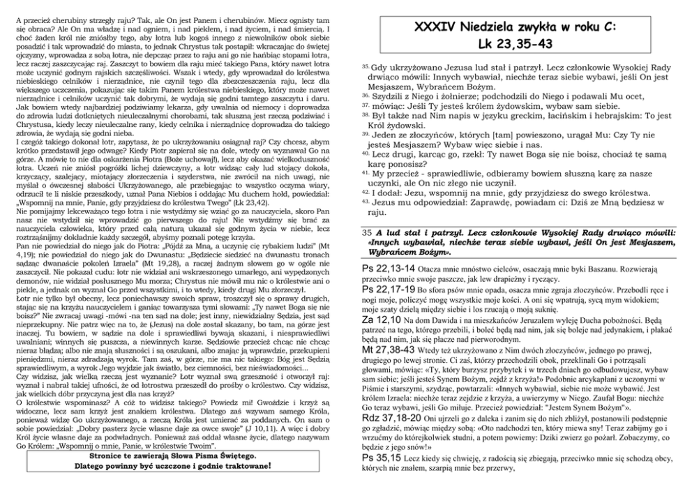 A przecieŜ cherubiny strzegły raju? Tak, ale On jest Panem i cherubinów. Miecz ognisty tam się obraca? Ale On ma władzę i nad ogniem, i nad piekłem, i nad Ŝyciem, i nad śmiercią. I choć Ŝaden król nie zniósłby tego, aby łotra lub kogoś innego z niewolników obok siebie posadzić i tak wprowadzić do miasta, to jednak Chrystus tak postąpił: wkraczając do świętej ojczyzny, wprowadza z sobą łotra, nie depcząc przez to raju ani go nie hańbiąc stopami łotra, lecz raczej zaszczycając raj. Zaszczyt to bowiem dla raju mieć takiego Pana, który nawet łotra moŜe uczynić godnym rajskich szczęśliwości. Wszak i wtedy, gdy wprowadzał do królestwa niebieskiego celników i nierządnice, nie czynił tego dla zbezczeszczenia raju, lecz dla większego uczczenia, pokazując się takim Panem królestwa niebieskiego, który moŜe nawet nierządnice i celników uczynić tak dobrymi, Ŝe wydają się godni tamtego zaszczytu i daru. Jak bowiem wtedy najbardziej podziwiamy lekarza, gdy uwalnia od niemocy i doprowadza do zdrowia ludzi dotkniętych nieuleczalnymi chorobami, tak słuszną jest rzeczą podziwiać i Chrystusa, kiedy leczy nieuleczalne rany, kiedy celnika i nierządnicę doprowadza do takiego zdrowia, Ŝe wydają się godni nieba. I czegóŜ takiego dokonał łotr, zapytasz, Ŝe po ukrzyŜowaniu osiągnął raj? Czy chcesz, abym krótko przedstawił jego odwagę? Kiedy Piotr zapierał się na dole, wtedy on wyznawał Go na górze. A mówię to nie dla oskarŜenia Piotra (BoŜe uchowaj!), lecz aby okazać wielkoduszność łotra. Uczeń nie zniósł pogróŜki lichej dziewczyny, a łotr widząc cały lud stojący dokoła, krzyczący, szalejący, miotający złorzeczenia i szyderstwa, nie zwrócił na nich uwagi, nie myślał o ówczesnej słabości UkrzyŜowanego, ale przebiegając to wszystko oczyma wiary, odrzucił te li niskie przeszkody, uznał Pana Niebios i oddając Mu duchem hołd, powiedział: „Wspomnij na mnie, Panie, gdy przyjdziesz do królestwa Twego” (Łk 23,42). Nie pomijajmy lekcewaŜąco tego łotra i nie wstydźmy się wziąć go za nauczyciela, skoro Pan nasz nie wstydził się wprowadzić go pierwszego do raju! Nie wstydźmy się brać za nauczyciela człowieka, który przed całą naturą ukazał się godnym Ŝycia w niebie, lecz roztrząśnijmy dokładnie kaŜdy szczegół, abyśmy poznali potęgę krzyŜa. Pan nie powiedział do niego jak do Piotra: „Pójdź za Mną, a uczynię cię rybakiem ludzi” (Mt 4,19); nie powiedział do niego jak do Dwunastu: „Będziecie siedzieć na dwunastu tronach sądząc dwanaście pokoleń Izraela” (Mt 19,28), a raczej Ŝadnym słowem go w ogóle nie zaszczycił. Nie pokazał cudu: łotr nie widział ani wskrzeszonego umarłego, ani wypędzonych demonów, nie widział posłusznego Mu morza; Chrystus nie mówił mu nic o królestwie ani o piekle, a jednak on wyznał Go przed wszystkimi, i to wtedy, kiedy drugi Mu złorzeczył. Łotr nie tylko był obecny, lecz poniechawszy swoich spraw, troszczył się o sprawy drugich, stając się na krzyŜu nauczycielem i ganiąc towarzysza tymi słowami: „Ty nawet Boga się nie boisz?” Nie zwracaj uwagi -mówi -na ten sąd na dole; jest inny, niewidzialny Sędzia, jest sąd nieprzekupny. Nie patrz więc na to, Ŝe (Jezus) na dole został skazany, bo tam, na górze jest inaczej. Tu bowiem, w sądzie na dole i sprawiedliwi bywają skazani, i niesprawiedliwi uwalniani; winnych się puszcza, a niewinnych karze. Sędziowie przecieŜ chcąc nie chcąc nieraz błądzą; albo nie znają słuszności i są oszukani, albo znając ją wprawdzie, przekupieni pieniędzmi, nieraz zdradzają wyrok. Tam zaś, w górze, nie ma nic takiego: Bóg jest Sędzią sprawiedliwym, a wyrok Jego wyjdzie jak światło, bez ciemności, bez nieświadomości... Czy widzisz, jak wielką rzeczą jest wyznanie? Łotr wyznał swą grzeszność i otworzył raj: wyznał i nabrał takiej ufności, Ŝe od łotrostwa przeszedł do prośby o królestwo. Czy widzisz, jak wielkich dóbr przyczyną jest dla nas krzyŜ? O królestwie wspominasz? A cóŜ to widzisz takiego? Powiedz mi! Gwoździe i krzyŜ są widoczne, lecz sam krzyŜ jest znakiem królestwa. Dlatego zaś wzywam samego Króla, poniewaŜ widzę Go ukrzyŜowanego, a rzeczą Króla jest umierać za poddanych. On sam o sobie powiedział: „Dobry pasterz Ŝycie własne daje za owce swoje” (J 10,11). A więc i dobry Król Ŝycie własne daje za podwładnych. PoniewaŜ zaś oddał własne Ŝycie, dlatego nazywam Go Królem: „Wspomnij o mnie, Panie, w królestwie Twoim”. Stronice te zawierają Słowa Pisma Świętego. Dlatego powinny być uczczone i godnie traktowane! XXXIV Niedziela zwykła w roku C: Lk 23,35-43 35. Gdy ukrzyŜowano Jezusa lud stał i patrzył. Lecz członkowie Wysokiej Rady drwiąco mówili: Innych wybawiał, niechŜe teraz siebie wybawi, jeśli On jest Mesjaszem, Wybrańcem BoŜym. 36. Szydzili z Niego i Ŝołnierze; podchodzili do Niego i podawali Mu ocet, 37. mówiąc: Jeśli Ty jesteś królem Ŝydowskim, wybaw sam siebie. 38. Był takŜe nad Nim napis w języku greckim, łacińskim i hebrajskim: To jest Król Ŝydowski. 39. Jeden ze złoczyńców, których [tam] powieszono, urągał Mu: Czy Ty nie jesteś Mesjaszem? Wybaw więc siebie i nas. 40. Lecz drugi, karcąc go, rzekł: Ty nawet Boga się nie boisz, chociaŜ tę samą karę ponosisz? 41. My przecieŜ - sprawiedliwie, odbieramy bowiem słuszną karę za nasze uczynki, ale On nic złego nie uczynił. 42. I dodał: Jezu, wspomnij na mnie, gdy przyjdziesz do swego królestwa. 43. Jezus mu odpowiedział: Zaprawdę, powiadam ci: Dziś ze Mną będziesz w raju. 35 A lud stał i patrzył. Lecz członkowie Wysokiej Rady drwiąco mówili: «Innych wybawiał, niechŜe teraz siebie wybawi, jeśli On jest Mesjaszem, Wybrańcem BoŜym». Ps 22,13-14 Otacza mnie mnóstwo cielców, osaczają mnie byki Baszanu. Rozwierają przeciwko mnie swoje paszcze, jak lew drapieŜny i rycz