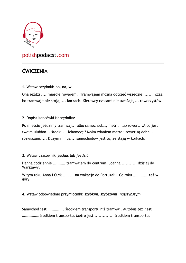 polishpodacst.com ĆWICZENIA 1. Wstaw przyimki: po, na, w Ona jeździ .... mieście rowerem. Tramwajem można dotrzeć wszędzie ...... czas, bo tramwaje nie stoją .... korkach. Kierowcy czasami nie uważają ... rowerzystów. 2. Dopisz koncówki Narzędnika: Po mieście jeździmy tramwaj... albo samochod…., metr… lub rower....A co jest twoim ulubion... środki.... lokomocji? Moim zdaniem metro i rower są dobr... rozwiązani..... Dużym minus... samochodów jest to, że stają w korkach. 3. Wstaw czasownik jechać lub jeździć Hanna codziennie …………. tramwajem do centrum. Joanna ........... dzisiaj do Warszawy. W tym roku Anna i Olek ……….. na wakacje do Portugalii. Co roku …………… też w góry. 4. Wstaw odpowiednie przymiotniki: szybkim, szybszymi, najszybszym Samochód jest …………….. środkiem transportu niż tramwaj. Autobus też jest ……………… środkiem transportu. Metro jest ............. środkiem transportu. polishpodacst.com ODPOWIEDZI 1. Wstaw przyimki: po, na, w Ona jeździ po mieście rowerem. Tramwajem można dotrzeć wszędzie na czas, bo tramwaje nie stoją w korkach. Kierowcy czasami nie uważają na rowerzystów. 2. Dopisz koncówki Narzędnika: Po mieście jeździmy tramwajem albo samochodem, metrem lub rowerem. A co jest twoim ulubionym środkiem lokomocji? Moim zdaniem metro i rower są dobrym rozwiązaniem. Dużym minusem samochodów jest to, że stają w korkach. NARZĘDNIK RZECZOWNIK rodzaj męski - em, rodzaj żeński -ą, rodzaj nijaki -em PRZYMIOTNIK rodzaj męski -ym / -im, rodzaj żeński -ą, rodzaj nijaki -ym / -im 3. Wstaw czasownik jechać lub jeździć Hanna codziennie jeździ tramwajem do centrum. Joanna jedzie dzisiaj do Warszawy. W tym roku Anna i Olek jadą na wakacje do Portugalii. Co roku jeżdżą też w góry. jechać - dzisiaj, 1 raz jeździć - regularnie, często 4. Wstaw odpowiednie przymiotniki: szybkim, szybszymi, najszybszym Samochód jest szybszym środkiem transportu niż tramwaj. Autobus też jest szybkim środkiem transportu. Metro jest najszybszym środkiem transportu. Przymiotniki w stopniu równym, wyższym i najwyższym: szybki, szybszy, najszybszy + końcówka przymiotnika w Narzędniku: -im /-ym: szybkim, szybszym, najszybszym.