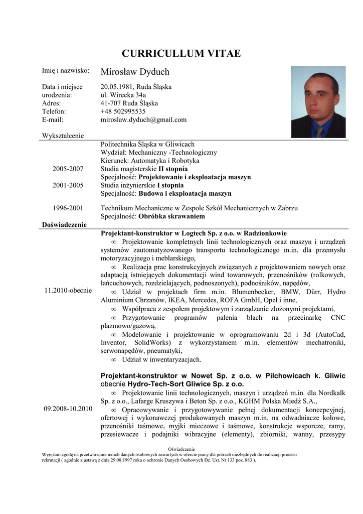 CURRICULLUM VITAE Imię i nazwisko: Mirosław Dyduch Data i miejsce urodzenia: Adres: Telefon: E-mail: 20.05.1981, Ruda Śląska ul. Wirecka 34a 41-707 Ruda Śląska +48 502995535 [email protected] Wykształcenie 2005-2007 2001-2005 1996-2001 Politechnika Śląska w Gliwicach Wydział: Mechaniczny -Technologiczny Kierunek: Automatyka i Robotyka Studia magisterskie II stopnia Specjalność: Projektowanie i eksploatacja maszyn Studia inżynierskie I stopnia Specjalność: Budowa i eksploatacja maszyn Technikum Mechaniczne w Zespole Szkół Mechanicznych w Zabrzu Specjalność: Obróbka skrawaniem Doświadczenie 11.2010-obecnie 09.2008-10.2010 Projektant-konstruktor w Logtech Sp. z o.o. w Radzionkowie • Projektowanie kompletnych linii technologicznych oraz maszyn i urządzeń systemów zautomatyzowanego transportu technologicznego m.in. dla przemysłu motoryzacyjnego i meblarskiego, • Realizacja prac konstrukcyjnych związanych z projektowaniem nowych oraz adaptacją istniejących dokumentacji wind towarowych, przenośników (rolkowych, łańcuchowych, rozdzielających, podnoszonych), podnośników, napędów, • Udział w projektach firm m.in. Blumenbecker, BMW, Dürr, Hydro Aluminium Chrzanów, IKEA, Mercedes, ROFA GmbH, Opel i inne, • Współpraca z zespołem projektowym i zarządzanie złożonymi projektami, • Przygotowanie programów palenia blach na przecinarkę CNC plazmowo/gazową, • Modelowanie i projektowanie w oprogramowaniu 2d i 3d (AutoCad, Inventor, SolidWorks) z wykorzystaniem m.in. elementów mechatroniki, serwonapędów, pneumatyki, • Udział w inwentaryzacjach. Projektant-konstruktor w Nowet Sp. z o.o. w Pilchowicach k. Gliwic obecnie Hydro-Tech-Sort Gliwice Sp. z o.o. • Projektowanie linii technologicznych, maszyn i urządzeń m.in. dla Nordkalk Sp. z o.o., Lafarge Kruszywa i Beton Sp. z o.o., KGHM Polska Miedź S.A., • Opracowywanie i przygotowywanie pełnej dokumentacji koncepcyjnej, ofertowej i wykonawczej produkowanych maszyn m.in. na odwadniacze kołowe, przenośniki taśmowe, myjki mieczowe i taśmowe, konstrukcje wsporcze, ramy, przesiewacze i podajniki wibracyjne (elementy), zbiorniki, wanny, przesypy Oświadczenie Wyrażam zgodę na przetwarzanie moich danych osobowych zawartych w ofercie pracy dla potrzeb niezbędnych do realizacji procesu rekrutacji ( zgodnie z ustawą z dnia 29.08.1997 roku o ochronie Danych Osobowych Dz. Ust. Nr 133 poz. 883 ). (zsuwnie), zasuwy, rurociągi, • Bezpośredni kontakt z produkcją i kooperacją – przygotowanie dokumentacji m. in. obróbki skrawaniem , spawalniczej, rozkroi („wypałek”) z blach i rur, • Wspieranie działu handlowego, inwentaryzacje. 11.2007-07.2008 Umiejętności Języki Angielski Technolog w Dziale Głównego Technologa w EKK Wagon Ostrów Wielkopolski • Opracowywanie technologii wykonania detali i podzespołów konstrukcji wagonów towarowych, • Opracowanie technologii wykonania oprzyrządowania i pomocy warsztatowych, • Wspieranie działu handlowego, przygotowywanie kalkulacji. • Inventor Autodesk (v2006-2012) – zaawansowana znajomość i bogate doświadczenie 2d i 3d – 6000h m.in. duże złożenia maszyn i urządzeń, modelowanie szkieletowe i adaptacyjne (automatyczne generowanie dokumentacji płaskiej z wykazami części i kształtowników), parametryzacja, praca zespołowa (Vault), konstrukcje ramowe i blachowe, generatory (m.in. ram, przekładni), symulacje i MES (statyczna i modalna – samokształcenie), przygotowanie bazy CC nowych części, programowanie (pisanie funkcji skracających projektowanie – VBA, C# i iLogic - samokształcenie), • Autocad Mechanical Autodesk 2d - 3000h (projektowanie, modyfikacja, rozrysowywanie), • Solid Works – projektowanie maszyn i urządzeń 2d i 3d, • Catia v5 - (m.in. Shape, Mechanical Design, Knowledge, symulacje obróbki skrawaniem, skanowanie 3d - 4sem zajęć z CAD/CAM), • Visual Studio - C# , VBA, C++/CLI, .NET 2.0-4.0 (hobby), • Matlab - ~1000h m.in. sztuczne sieci neuronowe i przetwarzanie obrazów , równania różniczkowe, symulacje, • Administracja sieciami osiedlowymi (LAN) - ~200 użytkownikówLinux/Unix- PLD, Red Hat, FreeBSD, • Podstawowa znajomość: Microstation (szkolenie), Unigraphics NX, WARICAM, Solid Edge, 3DS Max, • Znajomość - CAD/CAM Lantek Expert, MS Windows, MS Office, OpenOffice, Infor ERP XA, • Prawo jazdy kategorii A i B (jazda bezwypadkowa), • Znajomość obróbki skrawaniem. • Średnio zaawansowany (intermediate), • Gotowość do podjęcia nauki języków obcych. Kursy 01.2012 01.2010 Technopark-Gliwice Sp. z o.o. • „Programowanie i obsługa obrabiarki sterowanej numerycznie (CNC)” • „Nowoczesne metody obróbki ze szczególnym uwzględnieniem metody cięcia strumieniem wody”. Oświadczenie Wyrażam zgodę na przetwarzanie moich danych osobowych zawartych w ofercie pracy dla potrzeb niezbędnych do realizacji procesu rekrutacji ( zgodnie z ustawą z dnia 29.08.1997 roku o ochronie Danych Osobowych Dz. Ust. Nr 133 poz. 883 ).