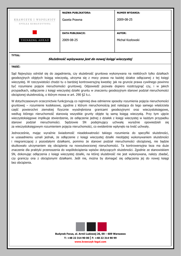 NAZWA PUBLIKATORA: NUMER WYDANIA: Gazeta Prawna 2009-08-25 DATA PUBLIKACJI: AUTOR: 2009-08-25 Michał Kozłowski TYTUŁ: Służebność wpisywana jest do nowej księgi wieczystej TREŚĆ: Sąd Najwyższy odniósł się do zagadnienia, czy służebność gruntowa wykonywana na niektórych tylko działkach geodezyjnych objętych księgą wieczystą, utrzyma się z mocy prawa na każdej działce odłączanej z tej księgi wieczystej. W rzeczywistości chodzi tu o bardziej kontrowersyjną kwestię: jak na gruncie prawa cywilnego powinno być rozumiane pojęcie nieruchomości gruntowej. Odpowiedź pozwala dopiero rozstrzygnąć czy, i w jakich przypadkach, odłączenie z księgi wieczystej działki gruntu w znaczeniu geodezyjnym stanowi podział nieruchomości obciążonej służebnością, o którym mowa w art. 290 §2 k.c. W dotychczasowym orzecznictwie funkcjonują co najmniej dwa odmienne sposoby rozumienia pojęcia nieruchomości gruntowej – rozumienie kodeksowe, zgodnie z którym nieruchomością jest należąca do tego samego właściciela część powierzchni ziemskiej fizycznie wyodrębniona granicami geodezyjnymi oraz wieczystoksięgowe, według którego nieruchomość stanowią wszystkie grunty objęte tą samą księgą wieczystą. Przy tym ujęcie wieczystoksięgowe implikuje stwierdzenie, że odłączenie jednej z działek z księgi wieczystej w każdym przypadku stanowi podział nieruchomości. Sędziowie SN podejmujący uchwałę wyraźnie opowiedzieli się za wieczystoksięgowym rozumieniem pojęcia nieruchomości, co ewidentnie wpłynęło na treść uchwały. Jednocześnie, mając wyraźnie świadomość nieadekwatności takiego rozumienia do specyfiki służebności, w uzasadnieniu uznali jednak, że odłączenie z księgi wieczystej działki nieobjętej wykonywaniem służebności i niegraniczącej z pozostałymi działkami, pomimo że stanowi podział nieruchomości obciążonej, nie będzie skutkowało utrzymaniem się obciążenia na nowoutworzonej nieruchomości. Ta kontrowersyjna teza ma duże znaczenie dla praktyki przenoszenia do współobciążenia wpisów dotyczących służebności. Zgodnie ze stanowiskiem SN, dokonując odłączenia z księgi wieczystej działki, na której służebność nie jest wykonywana, należy zbadać, czy graniczy ona z obciążonymi działkami. Jeśli nie, można by domagać się odłączenia jej do nowej księgi bez obciążenia. Budynek Focus, al. Armii Ludowej 26, 00 – 609 Warszawa T: +48 22 314 90 00 | F: +48 22 314 90 99 www.krawczyk-legal.com