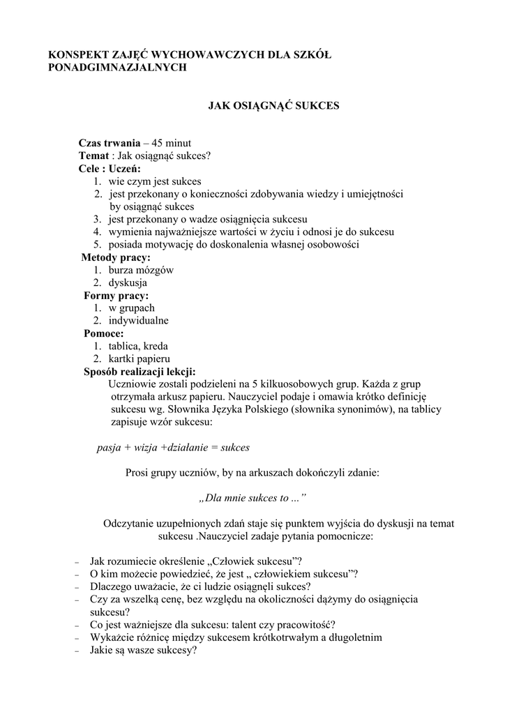 KONSPEKT ZAJĘĆ WYCHOWAWCZYCH DLA SZKÓŁ PONADGIMNAZJALNYCH JAK OSIĄGNĄĆ SUKCES Czas trwania – 45 minut Temat : Jak osiągnąć sukces? Cele : Uczeń: 1. wie czym jest sukces 2. jest przekonany o konieczności zdobywania wiedzy i umiejętności by osiągnąć sukces 3. jest przekonany o wadze osiągnięcia sukcesu 4. wymienia najważniejsze wartości w życiu i odnosi je do sukcesu 5. posiada motywację do doskonalenia własnej osobowości Metody pracy: 1. burza mózgów 2. dyskusja Formy pracy: 1. w grupach 2. indywidualne Pomoce: 1. tablica, kreda 2. kartki papieru Sposób realizacji lekcji: Uczniowie zostali podzieleni na 5 kilkuosobowych grup. Każda z grup otrzymała arkusz papieru. Nauczyciel podaje i omawia krótko definicję sukcesu wg. Słownika Języka Polskiego (słownika synonimów), na tablicy zapisuje wzór sukcesu: pasja + wizja +działanie = sukces Prosi grupy uczniów, by na arkuszach dokończyli zdanie: „Dla mnie sukces to ...” Odczytanie uzupełnionych zdań staje się punktem wyjścia do dyskusji na temat sukcesu .Nauczyciel zadaje pytania pomocnicze: − − − − − − − Jak rozumiecie określenie „Człowiek sukcesu”? O kim możecie powiedzieć, że jest „ człowiekiem sukcesu”? Dlaczego uważacie, że ci ludzie osiągnęli sukces? Czy za wszelką cenę, bez względu na okoliczności dążymy do osiągnięcia sukcesu? Co jest ważniejsze dla sukcesu: talent czy pracowitość? Wykażcie różnicę między sukcesem krótkotrwałym a długoletnim Jakie są wasze sukcesy? − Co będzie sukcesem dla nauczyciela w szkole? , itd. Następnie nauczyciel rozdaje na kartkach cechy i umiejętności, które stanowią słownik człowieka sukcesu. Uczniowie układają własny „przepis na sukces”. Leaderzy grup przedstawiają je pozostałym uczniom, ci wybierają najbardziej odpowiedni. Gdy żaden im nie odpowiada układają na ich podstawie nowy, .klasowy. Podsumowanie: MOTTO DLA UCZNIÓW: „ Ludzie sukcesu popełniają najwięcej błędów – to jest ich naturalna droga rozwoju, uczenia się i podróży do celu – smaku walki, jaką jest realizacja ideałów i progresywne osiąganie wartościowych celów” lub „ Ważne jest odnaleźć w sobie siłę, siłę duchową – wolę walki i zwyciężania oraz właściwą, dobrą motywację i intencje tego co robimy” Opracował Jerzy Strzeszewski − nauczyciel historii i WOS VII LO im. M. Konopnickiej w Lublinie Sponsor programu „Szkoła dobrze wychowana”