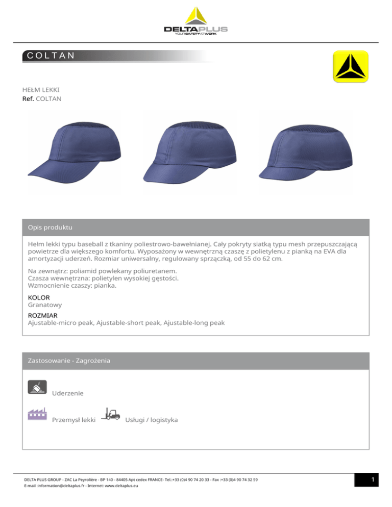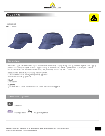 COLTAN HEŁM LEKKI Ref. COLTAN Opis produktu Hełm lekki typu baseball z tkaniny poliestrowo-bawełnianej. Cały pokryty siatką typu mesh przepuszczającą powietrze dla większego komfortu. Wyposażony w wewnętrzną czaszę z polietylenu z pianką na EVA dla amortyzacji uderzeń. Rozmiar uniwersalny, regulowany sprzączką, od 55 do 62 cm. Na zewnątrz: poliamid powlekany poliuretanem. Czasza wewnętrzna: polietylen wysokiej gęstości. Wzmocnienie czaszy: pianka. KOLOR Granatowy ROZMIAR Ajustable-micro peak, Ajustable-short peak, Ajustable-long peak Zastosowanie - Zagrożenia Uderzenie Przemysł lekki Usługi / logistyka DELTA PLUS GROUP - ZAC La Peyrolière - BP 140 - 84405 Apt cedex FRANCE- Tel.:+33 (0)4 90 74 20 33 - Fax :+33 (0)4 90 74 32 59 E-mail :[email protected] - Internet: www.deltaplus.eu 1 Zalety produktu + Korzyści dla użytkownika COLTABMMI - 3 cm COLTABMSH - 5 cm COLTABL - 7 cm Certyfikaty - Normy DYREKTYWA ŚOI 89/686/EWG EN812 Kaski chroniące przed uderzeniami Referencje + Ceny przy zakupie pełnego kartonu Referencje + Ceny przy zakupie pełnego kartonu Kod kreskowy KOLOR ROZMIAR COLTABL 3295249103071 Granatowy Ajustablelong peak 20 - COLTABMMI 3295249195236 Granatowy Ajustablemicro peak 20 - COLTABMSH 3295249195243 Granatowy Ajustableshort peak 20 - DELTA PLUS GROUP - ZAC La Peyrolière - BP 140 - 84405 Apt cedex FRANCE- Tel.:+33 (0)4 90 74 20 33 - Fax :+33 (0)4 90 74 32 59 E-mail :[email protected] - Internet: www.deltaplus.eu 2