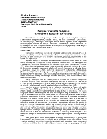 Mirosław Grusiewicz [email protected] Zakład Dydaktyki Muzycznej Wydział Artystyczny Uniwersytet Marii Curie-Skłodowskiej Lublin Komputer w edukacji muzycznej – konieczność, zagrożenie czy nadzieja? Wprowadzanie do edukacji nowych mediów, w tym przede wszystkim komputera z odpowiednim oprogramowaniem, wzbudza emocje, ma wielu zwolenników i przeciwników. W specjalistycznych, naukowych publikacjach można znaleźć ogromną liczbę argumentów przemawiających zarówno na korzyść stosowania nowoczesnych technik nauczania, jak i przestrzegających przed ich wprowadzaniem, a także opisujących negatywne tego skutki. Poglądy te układają się w triadę zawartą w tytule artykułu. Konieczność Liczne grono osób traktuje nowoczesne technologie w edukacji jako coś nieuchronnego, co prędzej czy później nastanie. Uważają oni, że szkoła powinna zająć jakieś stanowisko wobec problemu, ale sami nie chcą być w tej dziedzinie prekursorami, przyjmując, że problem ten w jakiś sposób sam się rozwiąże. Tego typu poglądy są dominujące wśród polskich nauczycieli. Po części wynika to z braku wiedzy informatycznej i umiejętności obsługi programów komputerowych. Jak pokazują badania z tego zakresu, nauczyciele charakteryzują się niskim poziomem kultury informatycznej [Wąsiński, 2001]. Wielu nie potrafi wykonywać nawet prostych czynności związanych z obsługą komputera, jak kopiowanie, usuwanie, zapisywanie określonych danych, korzystanie z edytorów tekstu, a nauczyciele muzyki nie potrafią obsługiwać nowoczesnych instrumentów elektronicznych [Grusiewicz, 1999]. Osoby te źle czują się w stechnologizowanym świecie i wcale nie pragną czerpać ze zdobyczy nowych technologii. Trudno oczekiwać przychylnego stanowiska wobec wprowadzania nowych mediów do edukacji od obecnego pokolenia nauczycieli, które odbiera wirtualny świat komputerów jako „obcy”. Niezbyt przychylny, czy też nieentuzjastyczny stosunek do stosowania komputerów w edukacji przyjmują nawet nauczyciele dość dobrze obeznani w problematyce. Uważają oni – i chyba słusznie – że na tym polu nie są w stanie dorównać młodemu pokoleniu i trochę obawiają się sytuacji, w której uczniowie będą ich uczyć obsługi komputera [Goban–Klas, 2002]. Przeciwni zmianom kształcenia nie są wyłącznie nauczyciele z Polski. Jak podaje M. M. Sysło [Sysło, 2002], podobna sytuacja istnieje w innych krajach Unii Europejskiej. Mimo znacznie lepszej bazy materiałowej szkół, znacznie lepszego dostępu do komputerów, a tym samym mniejszych trudności organizacyjnych, nie chcą oni wzbogacać lekcji multimediami. M. M. Sysło sugeruje, że podstawowym powodem takich postaw jest niski poziom dydaktyczny multimedialnych programów adresowanych do szkół. Osobiście uważam, że są one w nadmiarze multimedialne (posiadają dużo obrazów, filmów, rysunków, dźwięków, a mało treści, rzadko są adresowane do konkretnego poziomu nauczania, w znacznej części nie zawierają konkretnych pytań, poleceń, ćwiczeń dla uczniów, nie są powiązane z programami i podręcznikami szkolnymi, jak również nie zawierają porządku dydaktycznego, rządząc się wyłącznie własną logiką). Myślę również, że sceptycyzm ten wiąże się z naszymi przyzwyczajeniami traktowania komputera przede wszystkim jako narzędzia rozrywki, ewentualnie pozyskiwania informacji, ale nie jako narzędzia nauki, która wymaga znacznie większego zaangażowania intelektualnego. Inny powód braku zainteresowania nowymi mediami to fakt, że przygotowanie materiałów i prezentacji multimedialnych w dniu dzisiejszym wymaga od nauczyciela dodatkowych zabiegów organizacyjnych i znacznego nakładu czasu. Wiele osób, które uważa wprowadzanie technologii komputerowych za konieczność i nieuchronność, sądzi jednocześnie, że nie jest to w dniu dzisiejszym sprawa najistotniejsza. Bardzo wyraziście przedstawił ten problem K. Antosiewicz: „Biedni ludzie potrzebują wiedzy umieszczonej w lokalnym kontekście (...). W najbiedniejszych krajach szkoły nie przyciągają młodzieży nieograniczonym dostępem do Internetu. Czynnikiem decydującym o podjęciu nauki bywa częściej ciepły posiłek. (...) E–mail nie zastąpi szczepionek, a satelity nie zapewnią czystej wody.” [Antosiewicz, 2002, s. 33]. Wprawdzie autor artykułu ma na myśli przede wszystkim kraje Trzeciego Świata, ale sądzę, że zdania te mają szersze odniesienie. Osoby, sceptycznie podchodzące do problemu komputeryzacji oświaty, które uważają, że jest to konieczność, ale nie są jednocześnie do końca przekonane, że przyniesie to pożądane efekty, stanowią zdecydowaną większość. Można stwierdzić, że dominują osoby dostrzegające zarówno wady, jak i zalety nowoczesnych technologii. Niżej podany podział na „przeciwników” i „zwolenników” komputeryzacji jest umowny, dotyczy poglądów na szczegółowe problemy i tylko tak należy go postrzegać. Zagrożenie Przeciwnicy nowoczesnych mediów najczęściej wysuwają argumenty o szkodliwości zdrowotnej kontaktu z migającym ekranem komputera, który mimo coraz doskonalszej technologii nie przedstawia stabilnego obrazu, lecz polega na rozbłyskiwaniu milionów światełek. Nie ulega wątpliwości, że emitowane fale elektromagnetyczne osłabiają nie tylko wzrok, ale i niekorzystnie wpływają na cały układ nerwowy człowieka. Bardzo często podkreśla się negatywne wpływy nowych mediów na rozwój osobowy człowieka. T. Miczka [Miczka, 1999] stwierdza, że częsty kontakt z nowymi mediami, które charakteryzuje „nietrwałość”, „śmiertelność”, a przede wszystkim „przygodność”, osłabia kontakty interpersonalne, zachowania komunikacyjne, relacje społeczne oraz strategie porozumiewania się za pomocą języka, nadwartościowuje natomiast repertuar strategii synestezyjnego widzenia, które – jak stwierdza – jest spontaniczne