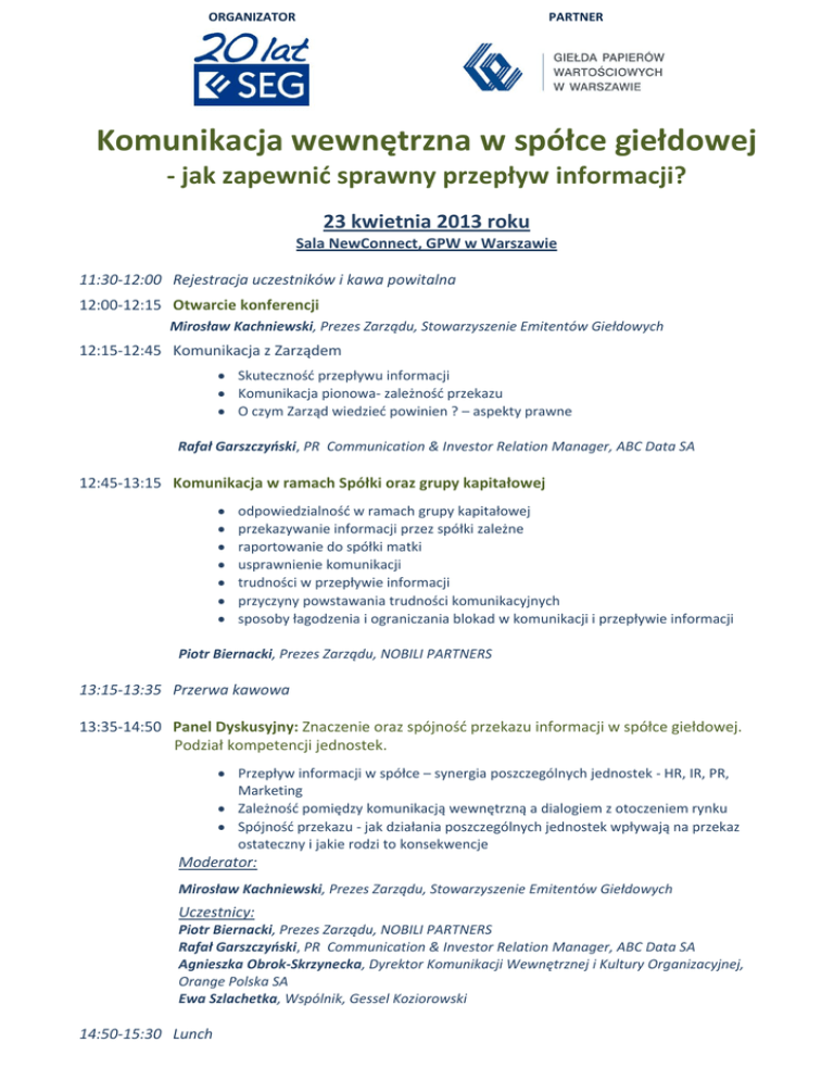 ORGANIZATOR PARTNER Komunikacja wewnętrzna w spółce giełdowej - jak zapewnić sprawny przepływ informacji? 23 kwietnia 2013 roku Sala NewConnect, GPW w Warszawie 11:30-12:00 Rejestracja uczestników i kawa powitalna 12:00-12:15 Otwarcie konferencji Mirosław Kachniewski, Prezes Zarządu, Stowarzyszenie Emitentów Giełdowych 12:15-12:45 Komunikacja z Zarządem Skuteczność przepływu informacji Komunikacja pionowa- zależność przekazu O czym Zarząd wiedzieć powinien ? – aspekty prawne Rafał Garszczyński, PR Communication & Investor Relation Manager, ABC Data SA 12:45-13:15 Komunikacja w ramach Spółki oraz grupy kapitałowej odpowiedzialność w ramach grupy kapitałowej przekazywanie informacji przez spółki zależne raportowanie do spółki matki usprawnienie komunikacji trudności w przepływie informacji przyczyny powstawania trudności komunikacyjnych sposoby łagodzenia i ograniczania blokad w komunikacji i przepływie informacji Piotr Biernacki, Prezes Zarządu, NOBILI PARTNERS 13:15-13:35 Przerwa kawowa 13:35-14:50 Panel Dyskusyjny: Znaczenie oraz spójność przekazu informacji w spółce giełdowej. Podział kompetencji jednostek. Przepływ informacji w spółce – synergia poszczególnych jednostek - HR, IR, PR, Marketing Zależność pomiędzy komunikacją wewnętrzną a dialogiem z otoczeniem rynku Spójność przekazu - jak działania poszczególnych jednostek wpływają na przekaz ostateczny i jakie rodzi to konsekwencje Moderator: Mirosław Kachniewski, Prezes Zarządu, Stowarzyszenie Emitentów Giełdowych Uczestnicy: Piotr Biernacki, Prezes Zarządu, NOBILI PARTNERS Rafał Garszczyński, PR Communication & Investor Relation Manager, ABC Data SA Agnieszka Obrok-Skrzynecka, Dyrektor Komunikacji Wewnętrznej i Kultury Organizacyjnej, Orange Polska SA Ewa Szlachetka, Wspólnik, Gessel Koziorowski 14:50-15:30 Lunch PRELEGENCI SEMINARIUM: Piotr Biernacki, Prezes Zarządu, NOBILI PARTNERS Posiada kilkunastoletnie doświadczenie w komunikacji na rynku kapitałowym. Specjalizuje się w tworzeniu i zarządzaniu strategiami komunikacji spółek giełdowych. Zarządzał komunikacją oraz doradzał kilkudziesięciu spółkom notowanym na GPW, Euronext i OMX. Jest prezesem zarządu firmy doradczej NOBILI PARTNERS. Wykładowca i trener, przeprowadził kilkadziesiąt szkoleń dla zarządów i kadry menedżerskiej w zakresie relacji inwestorskich, komunikowania wyników finansowych, wystąpień publicznych oraz kontaktów z mediami. Juror w konkursie Złota Strona Emitenta organizowanym przez Stowarzyszenie Emitentów Giełdowych. Wieloletni przewodniczący Rady Nadzorczej Polskiego Stowarzyszenia Public Relations, wcześniej członek Zarządu PSPR, członek Polskiego Instytutu Relacji Inwestorskich. Prowadzi bloga drivingtrust.com, gdzie pisze o sprawach związanych z relacjami inwestorskimi, presentation design i komunikacją korporacyjną. Publikuje także cykliczne artykuły na łamach kwartalnika „Akcjonariusz”. Aktywny komentator polskiego rynku kapitałowego na Twitterze: @piotrbiernacki. Mirosław Kachniewski, Prezes Zarządu, Stowarzyszenie Emitentów Giełdowych Przed dołączeniem do SEG pracował w Komisji Papierów Wartościowych i Giełd jako rzecznik prasowy i dyrektor sekretariatu. Był odpowiedzialny m.in. za kwestie współpracy międzynarodowej, polityki edukacyjnej oraz badań i analiz. Wcześniej był pracownikiem Ministerstwa Przekształceń Własnościowych i Katedry Finansów Międzynarodowych SGH. Posiada stopień naukowy doktora. Jest autorem wielu publikacji o tematyce ekonomicznej. Zasiada we władzach Europejskiego Stowarzyszenia Spółek Giełdowych (EuropeanIssuers). Agnieszka Obrok-Skrzynecka, Orange Polska SA Dyrektor Komunikacji Wewnętrznej i Kultury Organizacyjnej, Od 5 lat kieruje zespołem Komunikacji Wewnętrznej i Kultury Korporacyjnej w Orange Polska. Odpowiada za zarządzanie zmianą na kluczowych dla Orange Polska projektach, doradza także w procesach zmian organizacyjnych wspierając menedżerów w tym procesie. Z wykształcenie ekonomista, posiada kilkunastoletnie doświadczenie w prowadzeniu projektów dla międzynarodowych korporacji. Jest także certyfikowanym coachem ICC. Zespół, którym kieruje oprócz komunikacji wewnętrznej odpowiada także za realizację badań satysfakcji pracowników, oraz realizuje programy budujące identyfikację z firmą: Orange Passion i Orange Community, promujące pasje pracowników i ich zaangażowanie społeczne. Ewa Szlachetka, Wspólnik, Adwokat, LL.M., Gessel Koziorowski Specjalizuje się w prawie spółek, prawie handlowym, obsłudze prawnej transakcji fuzji i przejęć (M&A) oraz w zakresie prawa papierów wartościowych w związku z przygotowywaniem prospektów emisyjnych dla celów oferty publicznej. Odpowiada za rozwój praktyki equity capital markets (ECM) oraz wzmocnienie kluczowych praktyk Kancelarii: M&A oraz rynków kapitałowych w Polsce i w regionie Europy ŚrodkowoWschodniej. Posiada kilkunastoletnie doświadczenie w pracy na rzecz renomowanych międzynarodowych kancelarii prawnych. Brała udział m.in. w projektach nabywania i restrukturyzacji spółek, w tym zwłaszcza w przejęciach spółek publicznych i prywatnych. tel.: +48 22 318 69 82 e-mail: [email protected]
