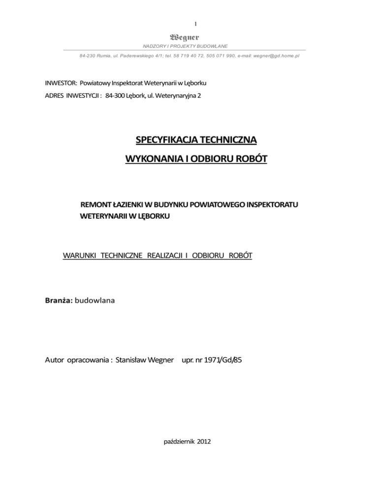 1 Wegner NADZORY I PROJEKTY BUDOWLANE 84-230 Rumia, ul. Paderewskiego 4/1; tel. 58 719 40 72, 505 071 990, e-mail: [email protected] INWESTOR: Powiatowy Inspektorat Weterynarii w Lęborku ADRES INWESTYCJI : 84-300 Lębork, ul. Weterynaryjna 2 SPECYFIKACJA TECHNICZNA WYKONANIA I ODBIORU ROBÓT REMONT ŁAZIENKI W BUDYNKU POWIATOWEGO INSPEKTORATU WETERYNARII W LĘBORKU WARUNKI TECHNICZNE REALIZACJI I ODBIORU ROBÓT Branża: budowlana Autor opracowania : Stanisław Wegner upr. nr 1971/Gd/85 październik 2012 2 Spis treści: 0. SST -00 WYMAGANIA OGÓLNE CPV 45000000-7 Roboty budowlane 0.1. Obowiązki Inwestor 0.2. Obowiązki Wykonawcy 0.3. Materiały i sprzęt 0.4. Transport 0.5. Wykonywanie robót 0.6. Dokumenty budowy 0.7. Kontrola jakości robót 0.8. Obmiar robót 0.9. Odbiór robót 0.10. Dokumenty do odbioru robót 0.11. Tok postępowania przy odbiorze 1. SST – 01 Roboty w zakresie burzenia CPV 45111000-8 1.1. Przedmiot 1.2. Zakres robót 1.3. Materiały 1.4. Sprzęt 1.5. Transport 1.6. Ogólne warunki techniczne wykonania robót 1.7. Kontrola jakości 1.8. Jednostka obmiaru 1.9. Odbiór robót 1.10. Podstawa płatności 1.11. Przepisy związane 2. SST- 02 Roboty murarskie i murowe CPV- 45262500-6 2.1. Przedmiot 2.2. Zakres robót 2.3. Materiały 2.4. Sprzęt 2.5. Transport 2.6. Opis przyjętych rozwiązań 2.7. Zasady ogólne wykonania robót murowych -Kategorie produkcji elementów murowych wg PN-B-03002:1999: -Kategorie wykonania robot murarskich wg PN-B-03002:1999: -Połączenia ścian wzajemne i ze stropami -Połączenia ścian wzajemne i ze stropami -Przerwy dylatacyjne 2.8.Warunki techniczne wykonania robót murowych zadania 2.9. Kontrola jakości 2.10. Jednostka obmiaru i odbiór 2.11. Podstawa płatności 2.12. Przepisy związane 3 . SST – 03 Kładzenie i wykładanie podłóg CPV - 45432100-5 3.1. Przedmiot 3.2. Zakres 3.3. Materiały 3.4. Sprzęt 3.5. Transport 3.6. Warunki techniczne wykonania robót 3 -Podstawowe wymagania techniczne -Gładkość powierzchni. -Niezmienność kształtu. -Szczelność ułożenia posadzki i prostoliniowość spoin. -Światłoczułość barwy. Wygląd zewnętrzny. -Właściwości wytrzymałościowe -Wytrzymałość na ściskanie i zginanie. -Odporność na wgniecenia. -Odporność na ścieranie. -Elastyczność powierzchni -Posadzki z wykładzin PCW bez warstwy izolacyjnej -Posadzki z wykładzin dywanowych -Posadzki z płytek ceramicznych (gresowych). 3.7. Kontrola jakości 3.8. Jednostka obmiaru 3.9. Odbiór 3.10. Podstawa płatności 3.11. Przepisy związane 4. SST- 04 Tynkowanie CPV - 45410000-4 4.1. Przedmiot 4.2. Zakres 4.3. Materiały 4.4. Sprzęt 4.5. Transport 4.6. Warunki techniczne realizacji i wykonanie robót -Wykonywanie tynków zwykłych - Wykonywanie tynków gipsowych - Okładziny z płyt gipsowo-kartonowych 4.7 Warunki techniczne odbioru tynków -Badania kontrolne tynków - Warunki techniczne wykonania i odbioru tynków wykonywanych z mieszanek tynkarskich zawierających gips -Warunki techniczne odbioru tynków wykonanych z fabrycznie gotowych mieszanek tynkarskich zawierających gips 4.8. Kontrola jakości 4.9. Jednostka obmiaru 4.10. Odbiór 4.11. Podstawa płatności 4.12. Przepisy związane 5. SST – 05 Kładzenie glazury CPV- 45431200-9 5.1. Przedmiot 5.2. Zakres. 5.3. Materiały 5.4. Sprzęt 5.5. Transport 5.6. . Warunki techniczne realizacji i wykonanie robót 5.7. Kontrola jakości robót 5.8. Jednostka obmiaru 5.9. Odbiór 5.10. Podstawa płatności 6. SST – 06 Roboty w zakresie stolarki budowlanej CPV- 45421000-4 6.1. Przedmiot 4 6.2. Zakres. 6.3. Materiały 6.4. Sprzęt 6.5. Transport 6.6. . Warunki techniczne realizacji i wykonanie robót 6.7. Kontrola jakości robót 6.8. Jednostka obmiaru 6.9. Odbiór 6.10. Podstawa płatności 7. SST – 07 Roboty malarskie CPV - 45442100-8 7.1. Przedmiot 7.2. Zakres. 7.3. Materiały 7.4. Sprzęt 7.5. Transport 7.6. . Warunki techniczne realizacji i wykonanie robót 7.7. Kontrola jakości robót 7.8. Jednostka obmiaru 7.9. Odbiór 7.10. Podstawa płatności 7.11. Przepisy związane 8. SST – 08 Meble CPV - 39100000-3, Instalowanie zabudowanych mebli CPV - 45421153-1 8.1. Przedmiot 8.2. Zakres. 8.3. Materiały 8.4. Sprzęt 8.5. Transport 8.6. . Warunki techniczne realizacji i wykonanie robót 8.7. Kontrola jakości robót 8.8. Jednostka obmiaru 8.9. Odbiór 8.10. Podstawa płatności 8.11. Przepisy związane 9. SST - 09 S Roboty instalacyjne wodne i kanalizacyjne- CPV 45332000-3 9.1. Przedmiot 9.2. Zakres. 9.3. Materiały 9.4. Sprzęt 9.5. Transport 9.6. Warunki techniczne realizacji i wykonanie robót 9.7. Kontrola jakości robót 9.8. Jednostka obmiaru 9.9. Odbiór 9.10. Podstawa płatności 10. SST - 10 Instalowanie centralnego ogrzewania- CPV 45331100-7 10.1. Przedmiot 10.2. Zakres. 10.3. Materiały 10.4. Sprzęt 10.5. Transport 5 10.6. Warunki techniczne realizacji i wykonanie robót 10.7. Kontrola jakości robót 10.8. Jednostka obmiaru 10.9. Odbiór 10.10. Podstawa płatności 11. SST-11 Roboty w zakresie okablowania oraz instalacji elektrycznych - CPV 45311000-0 11.1. Przedmiot 11.2. Zakres. 11.3. Materiały 11.4. Sprzęt 11.5. Transport 11.6. Warunki techniczne realizacji i wykonanie robót 11.7. Kontrola jakości robót 11.8. Jednostka obmiaru 11.9. Odbiór 11.10. Podstawa płatności 6 SZCZEGÓŁOWA SPECYFIKACJA TECHNICZNA I. SST – 00 WYMAGANIA OGÓLNE CPV 45000000-7 Roboty budowlane 1.1. Obowiązki Inwestora -Przekazanie dokumentacji – Inwestor przekazuje wykonawcy 1 egzemplarz dokumentacji projektowej. -Przekazanie pomieszczeń przeznaczonych do adaptacji – Inwestor przekaże pomieszczenia niezwłocznie po podpisaniu umowy. -Ustanowienie Inspektora Nadzoru Inwestorskiego. -Zawiadomienie właściwych organów - Inwestor co najmniej na 7 dni przed rozpoczęciem robót, dołączając oświadczenie kierownika budowy i Inspektora Nadzoru o przejęciu obowiązków. 1.2. Obowiązki Wykonawcy - Przejęcie pomieszczeń oraz ich zabezpieczenie zgodnie z wymogami pra