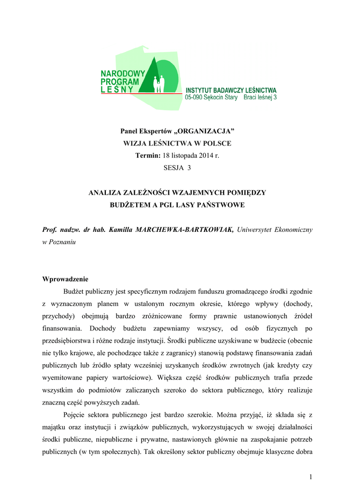 Panel Ekspertów „ORGANIZACJA” WIZJA LEŚNICTWA W POLSCE Termin: 18 listopada 2014 r. SESJA 3 ANALIZA ZALEŻNOŚCI WZAJEMNYCH POMIĘDZY BUDŻETEM A PGL LASY PAŃSTWOWE Prof. nadzw. dr hab. Kamilla MARCHEWKA-BARTKOWIAK, Uniwersytet Ekonomiczny w Poznaniu Wprowadzenie Budżet publiczny jest specyficznym rodzajem funduszu gromadzącego środki zgodnie z wyznaczonym planem w ustalonym rocznym okresie, którego wpływy (dochody, przychody) obejmują finansowania. bardzo zróżnicowane formy prawnie ustanowionych źródeł Dochody budżetu zapewniamy wszyscy, od osób fizycznych po przedsiębiorstwa i różne rodzaje instytucji. Środki publiczne uzyskiwane w budżecie (obecnie nie tylko krajowe, ale pochodzące także z zagranicy) stanowią podstawę finansowania zadań publicznych lub źródło spłaty wcześniej uzyskanych środków zwrotnych (jak kredyty czy wyemitowane papiery wartościowe). Większa część środków publicznych trafia przede wszystkim do podmiotów zaliczanych szeroko do sektora publicznego, który realizuje znaczną część powyższych zadań. Pojęcie sektora publicznego jest bardzo szerokie. Można przyjąć, iż składa się z majątku oraz instytucji i związków publicznych, wykorzystujących w swojej działalności środki publiczne, niepubliczne i prywatne, nastawionych głównie na zaspokajanie potrzeb publicznych (w tym społecznych). Tak określony sektor publiczny obejmuje klasyczne dobra 1 publiczne, np. lasy państwowe, rzeki, morza, bogactwa naturalne, jak również budynki użyteczności publicznej, infrastrukturę publiczną, przedsiębiorstwa państwowe oraz inne instytucje publiczne wraz z majątkiem1. Z punktu widzenia prawno-statystycznego podział powyższy nie jest jednak tak jednoznaczny, gdyż w ramach sektora publicznego wyodrębniono zamknięty katalog jednostek, tworzących tzw. sektor finansów publicznych2, których formy prawne, zasady gospodarki finansowej i nadzoru zostały bardzo szczegółowo ustanowione przede wszystkim w ustawie o finansach publicznych3 (dalej jako ufp). W art. 9 ufp znalazły się zatem dokładnie wyznaczone grupy jednostek (np. jednostki budżetowe, samorządowe zakłady budżetowe, instytucje gospodarki budżetowej), jak i pojedyncze jednostki (np. Narodowy Fundusz Zdrowia, Polska Akademia Nauk), których powiązanie finansowe z budżetem zostało dokładnie określone. Należy także dodać, iż katalog ten ulegał zmianom na przestrzeni lat, zarówno pod względem ilościowym, jak i rodzajowym. Wśród powyższych jednostek nie ma przedsiębiorstw państwowych (oraz spółek komunalnych) czy Narodowego Banku Polskiego, których zależności finansowe z budżetem są często równie ściśle określone w odrębnych ustawach, jak w przypadku jednostek omawianego ustawowego sektora. W sektorze finansów publicznych obowiązują generalnie dwie metody powiązania jednostek z budżetem, czyli tzw. metoda budżetowania brutto i netto. Pierwsza dotyczy jednostek budżetowych, w ramach których całość ich kosztów finansowana jest z budżetu, a dopuszczone prawnie i osiągnięte wpływy przekazywane bezpośrednio do budżetu. Oznacza to, iż działalność tych jednostek nie jest powiązana z osiągnięciem wyniku finansowego. Drugi rodzaj budżetowania o charakterze netto dotyczy takich jednostek jak instytucje gospodarki budżetowej, agencje wykonawcze, czy samorządowe zakłady budżetowe, które charakteryzują się generalnie zasadą samofinansowania. Jednostki te realizują konkretnie wyznaczone zadania publiczne, jednak ich rozliczenie z budżetem następuje tylko wynikiem finansowym. Jednostki te wprawdzie otrzymują dotacje z budżetu, jednak ich głównym źródłem finansowania są uzyskane z prowadzonej działalności przychody. Jeżeli spojrzymy szerzej na sektor finansów publicznych i dalej sektor publiczny to okazuje się, że rodzajów wzajemnych zależności finansowych jednostek (podmiotów, 1 Ustawa o finansach publicznych. Komentarz prawno-finansowy, pod red. H. Dzwonkowski, G. Gołębiowski, Wyd. Sejmowe, Warszawa 2014, s. 174 2 Autorka nie podejmuje się w tym miejscu prezentacji kontrowersji dotyczących również różnic metodologicznych pomiędzy polską metodologią klasyfikacji jednostek sektora finansów publicznych a metodologią unijną definiująca tzw. sektor instytucji rządowych i samorządowych (general government sector). Więcej na ten temat w: K. Marchewka-Bartkowiak, Konsekwencje zróżnicowania metodologii pomiaru długu publicznego w Polsce, Analizy BAS nr 11(100)/2013, Biuro Analiz Sejmowych 3 Obecnie obowiązuje ustawa z dnia 29 sierpnia 2009 r. o finansach publicznych (Dz. U. 2014 r. poz. 379, 911) 2 instytucji) z budżetem jest bardzo wiele. Poza wyżej wskazanymi, przedsiębiorstwa państwowe i inne instytucje publiczne zasilają bezpośrednio budżet podatkami (w tym podatkami specjalnymi), środkami z dywidend, czy wpłatami z zysku (najwyższe indywidualne wpłaty w tym zakresie przekazuje Narodowy Bank Polski). Jest też wiele jednostek, których zasady powiązania finansowego z budżetem ustanowiono odrębnymi ustawami. Reasumując powyższe, należy zatem już na wstępie podkreślić, iż obowiązujące obecnie zasady prawno-organizacyjne i finansowe dotyczące podmiotów, które można by zaliczyć do sektora publicznego są bardzo zróżnicowane. Określone standardy obowiązują wprawdzie sektor finansów publicznych, ale także w tym przypadku rodzajów wzajemnych zależności można znaleźć wiele. Niewątpliwe jednak należy stwierdzić, iż taka wielorakość rozwiązań, z punktu widzenia przejrzystości finansów publicznych nie jest korzystna i często kwestionowana jest przez naukowców i praktyków zajmujących się problematyką budżetową. 1. Budżet a PGL Lasy Państwowe 1.1. Struktura wzajemnych zależności finansowych Zgodnie z obowiązującymi regulacjami, Państwowe Gospodarstwo Leśne Lasy Państwowe (dalej PGL Lasy Państwowe) są je