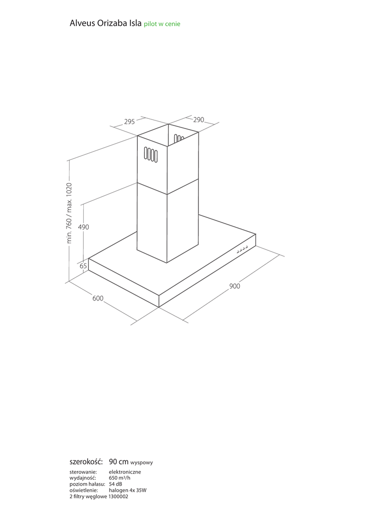 Alveus Orizaba Isla pilot w cenie szerokość: 90 cm wyspowy sterowanie: elektroniczne wydajność: 650 m3/h poziom hałasu: 54 dB oświetlenie: halogen 4x 35W 2 filtry węglowe 1300002
