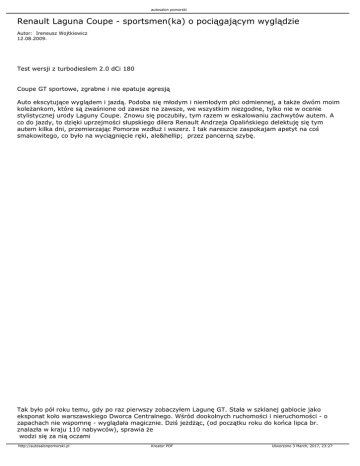 autosalon pomorski Renault Laguna Coupe - sportsmen(ka) o pociągającym wyglądzie Autor: Ireneusz Wojtkiewicz 12.08.2009. Test wersji z turbodieslem 2.0 dCi 180 Coupe GT sportowe, zgrabne i nie epatuje agresją Auto ekscytujące wyglądem i jazdą. Podoba się młodym i niemłodym płci odmiennej, a także dwóm moim koleżankom, które są zwaśnione od zawsze na zawsze, we wszystkim niezgodne, tylko nie w ocenie stylistycznej urody Laguny Coupe. Znowu się poczubiły, tym razem w eskalowaniu zachwytów autem. A co do jazdy, to dzięki uprzejmości słupskiego dilera Renault Andrzeja Opalińskiego delektuję się tym autem kilka dni, przemierzając Pomorze wzdłuż i wszerz. I tak nareszcie zaspokajam apetyt na coś smakowitego, co było na wyciągnięcie ręki, ale… przez pancerną szybę. Tak było pół roku temu, gdy po raz pierwszy zobaczyłem Lagunę GT. Stała w szklanej gablocie jako eksponat koło warszawskiego Dworca Centralnego. Wśród dookolnych ruchomości i nieruchomości - o zapachach nie wspomnę - wyglądała magicznie. Dziś jeżdżąc, (od początku roku do końca lipca br. znalazła w kraju 110 nabywców), sprawia że wodzi się za nią oczami http://autosalonpomorski.pl Kreator PDF Utworzono 3 March, 2017, 23:27 autosalon pomorski Fakt, że ładne, dwudrzwiowe coupe klasy średniej na naszych drogach to rzadkość. Ale na dodatek ta „renówka” przyciąga uwagę swą zgrabną, sportową linią nadwozia, która nie epatuje agresywnością. A jak mocno przyciąga, widzę w lusterku i czuję na „ogonie”. Za mną motocyklista, chyba szalony. Kładzie ten swój „przecinak” to na lewo to na prawo, staje na podnóżkach, wyciąga ręce do góry jak na wiwat. Za nim Chrysler Grand Voyager, którego kierowcę zachowanie motocyklisty pewnie dziwi i wkurza tak samo jak mnie. Wszystko dzieje się przy przepisowej mniej więcej prędkości szosowej. Jak coś pójdzie nie tak, to ja motor będę miał w bagażniku, a Chrysler motocyklistę pod kołami. Albo na odwrót, zresztą mniejsza z tym, i tak warzywo czy piach. Więc urywam się temu przecinakowi, co dla Laguny Coupe jest niezbyt wielkim wyzwaniem. Zaraz jednak zwalniam, po diabła te zawody. Jednośladowiec rośnie w lusterku, niech sobie wyprzedza. Teraz z przodu popisuje się tak samo, jak przed chwilą z tyłu. Podpuszcza? Niech sam pędzi na złamanie karku, jak nie chce dożyć przesiadki do auta w rodzaju Laguny Coupe. Co jeszcze może takie auto sprawdzam już na pasie startowym. Napędza je wprawdzie nie najmocniejszy z oferowanych silników, (do wyboru pozostają turbobenzynowce 2.0 204 KM i nowo wprowadzony do oferty 2.0 170 KM z automatem oraz dwie „fałszóstki”: benzynowa 3.5 238 KM i turbodiesel 3.0 235 KM), ale ma dość energii, by poruszać żwawo takim sportowym coupe. Sprint na setkę wprawdzie wolniejszy o niecałą sekundę, ale żal żyłować auto o zaledwie śladowym przebiegu. Poza tym przyspieszanie ciut opóźnia skrzynia biegów – działa płynnie, precyzyjnie zmienia przełożenia, ale ma przydługi skok dźwigi. Pewnie to też kwestia tzw. ułożenia auta, na co trzeba trochę większego przebiegu. Natomiast elastyczność napędu taka, że przy wyprzedaniu można bezpiecznie śmigać, zwłaszcza na „czwórce” od 60 do 100 km/h i „piątce” w zakresie 80 -120 km/h. Co ważne, cisnąc energicznie pedał gazu nie trzeba się obawiać żadnej turbodziury, czy innego zawahania napędu. W sytuacjach wymagających „kopa” najlepiej gdy obroty są w graniach 2.000. Wtedy dysponujemy już maksymalnym momentem 400 Nm, który da się utrzymać do prawie 3.000 obr./min. Lekki przepał – 0,6 l/100 km więcej niż deklaruje producent – do przyjęcia. Tylko w wersji GT, jak testowane auto, występuje system 4Control, czyli są tu cztery koła skrętne. Przednimi kręci kierowca, tylnymi elektronika. Kręcę więc bączka obserwując w bocznym lusterku co się dzieje z tylnymi kołami. Kierują się na zewnątrz, czyli w odwrotną stronę niż koła przednie. Dzięki temu zmniejsza się średnica zawracania. Odnoszę wrażenie, po pozostawionych wcześniej śladach, że wystarczy okrągłe poletko o średnicy niewiele ponad 10 m - jak dla mieszczucha. „Renówka” zacieśnia promień skrętu niczym wąż duszący swą zdobycz. Po za tym Laguną Coupe GT parkuje się łatwiej niż np. kompaktowym hatchbackiem. Pomiędzy równolegle zaparkowane auta wjeżdżam mniejszym łukiem, a i tak wychodzi to całkiem zgrabnie – obywa się bez poprawek w stylu trochę do tyłu, trochę w prawo lub lewo i do przodu. Opisane manewrowanie jest możliwe przy prędkościach do 60 km/h. Można więc jeszcze liczyć na lepszą zwrotność auta na krętych drogach. Natomiast powyżej 60 km/h tylne koła toczą się śladem przednich, czyli skręcają w tym samym kierunku. Czuje się lepszą zwrotność na szybkich zakrętach, natomiast nie czuje bocznych przechyłów. Nad- czy podsterowność – takie zachowania raczej obce temu autu. Po symulowanej próbie nagłego omijania przeszkody śmiem twierdzić, że test łosia to auto może sobie zaliczyć jako ekstern. Nie powiem, że kieruje się nim inaczej niż z klasycznym układem jezdnym i że to wymaga przyzwyczajenia. Moim zdaniem kieruje się łatwiej i pewniej, a to już nie wymaga oswojenia, samo przychodzi od razu. http://autosalonpomorski.pl Kreator PDF Utworzono 3 March, 2017, 23:27 autosalon pomorski Tyłkiem przy asfalcie nie trzeba się wozić, jak w sportowych autach o obniżonym zawieszeniu i nisko osadzonych fotelach. W Lagunie Coupe można dość wysoko podnieść oba przednie fotele, co z pasażerką cenimy sobie, bo lubimy widzieć przód auta. Ci na tylnych siedzeniach już nie mają tak rozległego pola widzenia. Skóra z czerwonymi obszyciami, aluminiowe nakładki na pedały, grube spłaszczone u dołu koło kierownicy i na sportowo wyprofilowane fotele, to odpowiednie dopełnienie zewnętrznego wyglądu. Na gustując