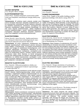 ŚWE Nr 4’2013 (109) ŚWE No 4’2013 (109) SŁOWO WSTĘPNE Jerzy Barglik: Słowo wstępne FOREWORD Jerzy Barglik: Foreword ELEKTROENERGETYKA Julian Wiatr: Zasilanie budynków użyteczności publicznej oraz budynków mieszkalnych energią elektryczną (cz. VII): POWER ENGINEERING Julian Wiatr: Supply of the public buildings and the apartment buildings with electric energy (Part 7th) Streszczenie: W siódmej części artykułu została omówiona tematyka dotycząca zespołów prądotwórczych, jako powszechnie stosowanych źródeł zasilania awaryjnego obiektów budowlanych. Omówiono: wymagania podstawowe, przykładowe układy zasilania awaryjnego, dobór mocy zespołu prądotwórczego, układy współpracy zespołu prądotwórczego z siecią elektroenergetyczną i wymagania dotyczące lokalizacji zespołów prądotwórczych pod względem ochrony przeciwpożarowej. Summary: The seventh part of the article discusses the ELEKTROTERMIA Antoni Sawicki, Aneta Zarzycka: Analiza porównawcza wybranych właściwości technologicznych i energetycznych stalowniczych pieców łukowych ELECTROTHERMICS Aneta Zarzycka, Antoni Sawicki: Comparative Analysis of Selected Technological and Energetic Properties of Steelmaking Arc Furnaces Streszczenie: W pracy rozpatrzono podstawowe konstrukcje współczesnych stalowniczych pieców łukowych prądu stałego i przemiennego. W analizie porównawczej wzięto pod uwagę ich właściwości technologiczne, energetyczne, regulacyjne i ekologiczne. Wskazano na najbardziej perspektywiczne rozwiązania, szczególnie przydatne do modernizacji starych i budowy nowych pieców. Porównano także różne hipotezy na temat dyssypacji energii łuku elektrycznego do obszaru roboczego pieców. Wskazano na niektóre sprzeczności, wynikające z przebiegu procesów cieplnych i technologicznych oraz wymagań wydajności i oszczędności energii. Summary: Basic designs of contemporary AC and DC MASZYNY ELEKTRYCZNE Piotr Dukalski: Obliczenia projektowe silnika synchronicznego z magnesami trwałymi wyposażonego w wirnik typu IPM "V" ELECTRIC MACHINES Piotr Dukalski: Design calculations of synchronous motor with permanent magnets equiped with IPM "V" rotor Streszczenie: Artykuł przedstawia wyniki obliczeń projektowych obwodu elektromagnetycznego silnika synchronicznego z magnesami trwałymi przeznaczonego do zastosowań górniczych. Opisywany silnik będzie wyposażony w wirnik typu IPM z magnesami "V". W artykule zostały przedstawione obliczony rozkładu indukcji pola magnetycznego pochodzącego od magnesów trwałych, przy zasilaniu znamionowym silnika oraz przy kilkudziesięciosekundowym przeciążeniu. Autor zamieścił również obliczone charakterystyki momentu mechanicznego, mocy wyjściowej oraz sprawności silnika. Summary: This paper presents the results of the design matter of emergency diesel generator, as the generally applied sources of emergency supply for buildings. The article discusses: the basic requirements, the exemplifying emergency feed systems, selection of power rating of emergency diesel generator, the systems of collaboration the emergency diesel generator with electric power network and requirements concerning to location the diesel generator on respects of fire protection. steelmaking arc furnaces have been considered. Comparative analysis take their technological, energetic, control and ecological properties into account. Most promising solutions have been indicated, especially those useful in modernization of old furnaces and building new ones. Different hypotheses about energy dissipation of electric arc into furnace working area have also been compared. Some contradictions have been shown, resulting from heat and technological processes, as well as performance and energy saving requirements. calculations, electromagnetic circuit synchronous motor with permanent magnets designed for mining applications. Described engine will be equipped with a rotor magnet IPM "V". The article presents the calculated distribution of magnetic field-derived from permanent magnets, with a rated power of the engine and the several seconds overload. Author also posted calculated torque characteristics of mechanical power output and efficiency of the engine. Piotr Dukalski, Leszek Brymora: Koncepcja rozwiąza-nia Piotr Dukalski, Leszek Brymora: The design concept of kadłuba silnika górniczego, wzbudzanego magnethe mine motor block with permanent magnets sami trwałymi Streszczenie: Artykuł przedstawia rozwiązanie konstrukcyjne silnika górniczego synchronicznego, wzbudzanego magnesami trwałymi. Silnik jest przeznaczony do pracy w strefach zagrożonych wybuchem pyłu węglowego i metanu. Rozwiązanie umożliwia montaż silnika zarówno poprzez kołnierz jak i łapy mocujące. Kadłub jest wyposażony w dodatkową komorę en kodera. Summary: The paper presents the design solution mining synchronous motor with permanent magnets. The engine is designed to operate in hazardous areas of coal dust and methane. The solution enables engine assembly, both through the flange and mounting lugs. The hull is equipped with an additional chamber encoder that allows for the easy disassembly and provides the thermal protection. Paweł Pistelok: Agregat prądotwórczy z wysokosprawnym generatorem synchronicznym wzbudzanym magnesami trwałymi – wyniki badań Paweł Pistelok: Power unit with highly efficient permanent magnet synchronous generator – tests results Streszczenie: W artykule zaprezentowano koncepcję agregatu spalinowo-elektrycznego współpracującego z generatorem synchronicznym wzbudzanym magnesami trwałymi. Zaprezentowano model obliczeniowy generatora oraz rozkład przestrzenny indukcji magnetycznej w szczelinie generatora jak również zobrazowano poziomy nasyceń poszczególnych części obwodu magnetycznego na przekroju poprzecznym maszyny. W rezultacie przeprowadzonych obliczeń polowo-obwodowych zaprezentowano obliczeniowy przebieg momentu zaczepowego. Przep