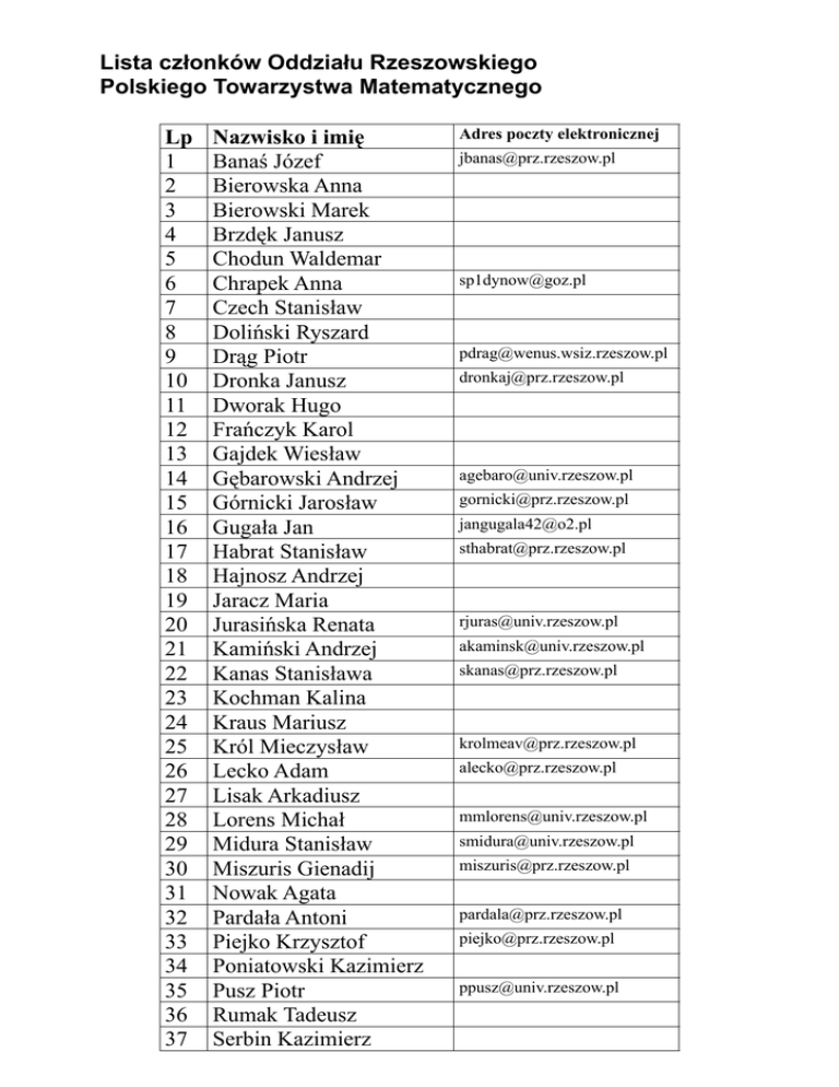 Lista Członków Oddziału Rzeszowskiego Polskiego Towarzystwa Mat