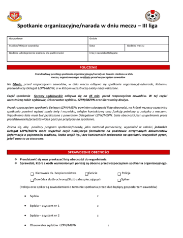 Spotkanie organizacyjne/narada w dniu meczu – III liga Gospodarze Goście Stadion/Miejsce zawodów Data Godzina udostępnienia stadionu dla publiczności Imię i nazwisko Delegata: Godzina meczu POUCZENIE Standardowy przebieg spotkania organizacyjnego/narady na terenie stadionu w dniu meczu, organizowanego na 60min przed rozpoczęciem zawodów Na 60min. przed rozpoczęciem zawodów, w dniu meczu odbywa się spotkanie organizacyjne/narada, któremu przewodniczy Delegat ŁZPN/MZPN, a w którym uczestniczą osoby niżej wskazane. Część spotkania Sprawy sędziowskie odbywa się na 45 min. przed rozpoczęciem zawodów. W tej części uczestniczą także sędziowie, Obserwator sędziów, ŁZPN/MZPN oraz kierownicy drużyn. Przed rozpoczęciem spotkania Delegat ŁZPN/MZPN powinien udostępnić listę obecności, na której wszyscy uczestnicy spotkania powinni wpisać swoje imię i nazwisko, telefon kontaktowy oraz funkcję pełnioną w związku z meczem. Wypełniona lista musi być przekazana z powrotem Delegatowi ŁZPN/MZPN. Lista obecności jest uzupełniania przez przedstawiciela/przedstawicieli gości po przybyciu na spotkanie. Zaleca się, aby poniższy program spotkania/narady, jako materiał pomocniczy, wypełniać w całości, jednakże Delegat ŁZPN/MZPN może wypełnić część niniejszego formularza na podstawie otrzymanych dokumentów (informacja o pojemności stadionu, liczba wejść itp.) bez konieczności zadawania na spotkaniu wszystkich pytań, jeżeli uzna to za stosowne. SPRAWDZENIE OBECNOŚCI Przedstawić się oraz przekazać listę obecności do wypełnienia. Sprawdzić, które z osób wymienionych poniżej są obecne przed rozpoczęciem spotkania organizacyjnego. Kierownik ds. bezpieczeństwa Goście Policja Dowódca służb ochrony/Służb zabezpieczających Spiker (Policja oraz spiker są zawiadamiani o terminie spotkania przez klub będący gospodarzem zawodów) Sędzia z Sędzia – asystent nr 1 z Sędzia – asystent nr 2 z Obserwator sędziów ŁZPN/MZPN z 1. SPRAWY ORGANIZACJI I BEZPIECZEŃSTWA – 60 MINUT PRZED MECZEM a) Czy jest zezwolenie na przeprowadzenie imprezy masowej? Tak Nie b) Potwierdzić godzinę rozpoczęcia meczu c) Pojemność stadionu Miejsca udostępnione: Miejsca zadaszone: Miejsca niezadaszone: d) Liczba regulaminów meczu piłki nożnej niebędącego imprezą masową i miejsce udostępnienia (dla imprezy niemasowej): _____________________________________________________________________________ e) Spodziewana liczba widzów: f) Kibice przyjezdni 1* Spodziewana liczba: 2* Spodziewany czas przyjazdu: 3* Spodziewany czas odjazdu: 4* Czy znane są środki transportu? Tak Nie Kolej Tak Nie Autobusy Tak Nie Samochody Tak Nie Czy kibice drużyny gości muszą czekać po meczu w swoim sektorze zanim będą mogli opuścić stadion? Tak Nie Na chwilę obecną trudno powiedzieć Jeżeli tak, to jak długo? (w minutach) Czy kibice drużyny gości mogą skorzystać z bufetów i sanitariatów oczekując na opuszczenie stadionu? Tak Nie f) Rasistowskie zachowanie – komunikat Delegata (komunikat należy odczytać podczas Spotkania Organizacyjnego/narady w obecności przedstawicieli obydwu drużyn) Proszę zwrócić uwagę, iż nie toleruje się zachowań rasistowskich czy ksenofobicznych i że właściwe organy dyscyplinarne mogą nałożyć stosowne sankcje na klub/zawodników/ osoby funkcyjne, pod postacią dyskwalifikacji, zamknięcia stadionu, kary finansowej, zakazu wyjazdów zorganizowanej grupy kibiców itp. g) Liczba akredytowanych przedstawicieli mediów TV i radio Dziennikarze Fotoreporterzy h) Sprawy różne Liczba osób uczestniczących w zabezpieczeniu zawodów: Policja __________________________________ Członkowie służb porządkowych/zabezpieczających Członkowie służb informacyjnych/klubowych służb pomocniczych Czy kierownik ds. bezpieczeństwa oświadcza, że wszyscy członkowie służb informacyjnych i porządkowych posiadają stosowne uprawnienia? Tak Nie Ilu spośród obecnych na dzisiejszym meczu członków służb informacyjnych i porządkowych posiada dodatkowo Certyfikat Stewarda PZPN? Czy stadion jest wyposażony w: System monitoringu wizyjnego? Tablicę elektroniczną do wyświetlania wyniku? Sprawny system nagłośnienia? Czy furtki ewakuacyjne / bramy będą mogły zostać otwarte Tak Tak Nie Nie Tak Nie w każdym momencie? Tak Czy wszystkie te furtki / bramy są obsługiwane przez (członków służb informacyjnych i porządkowych/zabezpieczających)? Tak Tak Czy reklamy blokują otwarcie bram ewakuacyjnych? Tak Czy plansze reklamowe mogą stanowić zagrożenie dla zawodników? Tak Czy zostały zapewnione służby medyczne/punkt sanitarny ? Nie Nie Nie Nie Nie i) Kierownik ds. bezpieczeństwa: Imię i nazwisko Miejsce podczas meczu j) Końcowe pytania: Czy przewidywane warunki atmosferyczne mogą być przyczyną problemów w związku z meczem? (dotyczy zawodników, publiczności, członków różnych służb itp.) Tak Nie Jeżeli „tak”, jakie działania należy / można podjąć? Czy Policja lub inne obecne osoby mają uwagi dotyczące organizacji meczu? Tak Nie Jeżeli „tak”, to jakie? Czy jest coś, co klub lub kluby powinny uczynić, a co nie zostało do tej pory uczynione? Tak Nie Jeżeli „tak”, to jakie działania należy podjąć? Zaleca się, aby powyższe pytania zostały zadane, a odpowiedzi zanotowane Przedstawiciele Policji mogą opuścić spotkanie organizacyjne 2. SPRAWY ADMINISTRACYJNE a) Sprawy różne: Przypomnieć, iż na płycie boiska oraz za rzędem reklam mogą przebywać wyłącznie osoby do tego upoważnione i odpowiednio oznakowane. Obecność innych osób, w tym kibiców, działaczy klubu itp., jest niedopuszczalna i może podlegać karze dyscyplinarnej. Tak Nie Czy są przygotowane miejsca w sektorze VIP dla Delegata ŁZPN/MZPN, obserwatora (w razie potrzeby)? Tak Nie Czy są przygotowane miejsca w sektorze VIP dla przedstawicieli drużyny gości? Czy ustalona liczba akredytacji/