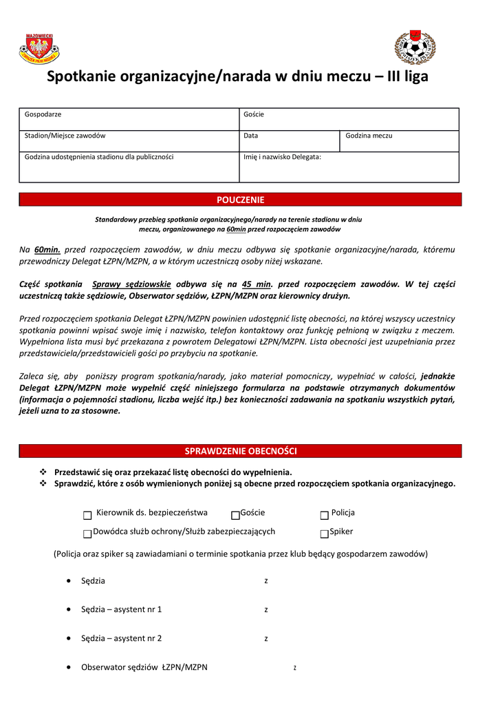 Spotkanie organizacyjne/narada w dniu meczu – III liga