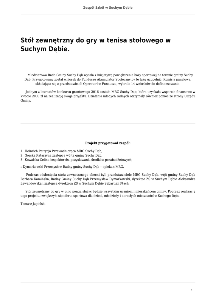 Zespół Szkół w Suchym Dębie Stół zewnętrzny do gry w tenisa stołowego w Suchym Dębie. Młodzieżowa Rada Gminy Suchy Dąb wyszła z inicjatywą powiększenia bazy sportowej na terenie gminy Suchy Dąb. Przygotowany został wniosek do Funduszu Akumulator Społeczny by tę lukę uzupełnić. Komisja panelowa, składająca się z przedstawicieli Operatorów Funduszu, wybrała 14 wniosków do dofinansowania. Jednym z laureatów konkursu grantowego 2016 została MRG Suchy Dąb, która uzyskała wsparcie finansowe w kwocie 2000 zł na realizację swoje projektu. Działania młodych radnych otrzymały również pomoc ze strony Urzędu Gminy. Projekt przygotował zespół: 1. Heinrich Patrycja Przewodnicząca MRG Suchy Dąb, 2. Górska Katarzyna zastępca wójta gminy Suchy Dąb, 3. Kowalska Celina inspektor ds. pozyskiwania środków pozabudżetowych, ● Dymarkowski Przemysław Radny gminy Suchy Dąb – opiekun MRG. Podczas odsłonięcia stołu zewnętrznego obecni byli przedstawiciele MRG Suchy Dąb, wójt gminy Suchy Dąb Barbara Kamińska, Radny Gminy Suchy Dąb Przemysław Dymarkowski, dyrektor ZS w Suchym Dębie Aleksandra Lewandowska i zastępca dyrektora ZS w Suchym Dębie Sebastian Ptach. Stół zewnętrzny do gry w ping ponga służyć będzie wszystkim uczniom i mieszkańcom gminy. Poprzez realizację tego projektu zwiększyła się oferta sportowa dla dzieci, młodzieży i dorosłych mieszkańców Suchego Dębu. Tomasz Jagielski 1