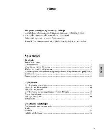 Polski Jak poruszać się po tej instrukcji obsługi 4 to małe kółeczko na początku zdania oznacza: co trzeba zrobić, 5 ta strzałka oznacza: jaki jest efekt tej czynności. Tekst pochyły oznacza: uwagę lub komentarz. Słownik (str.16) dostarcza więcej informacji gdy jest to niezbędne. Spis treści Strojenie Telewizor i pilot ............................................................................................2 Uruchomienie ...............................................................................................2 Wywołanie menu Strojenie .........................................................................3 Wybór języka i kraju z menu.......................................................................3 Automatyczne nastawianie i zapamiętywanie programów: aut. program 4 Sortowanie.....................................................................................................4 Zapis ręczny ..................................................................................................5 Użytkowanie Użytkowanie telewizora ..............................................................................6 Przyciski na telewizorze ...............................................................................6 Przyciski na pilocie .......................................................................................7 Użytkowanie menu: regulacja obrazu i dźwięku ......................................8 Opcje dodatkowe..........................................................................................9 Funkcje specjalne .......................................................................................10 Telegazeta....................................................................................................11 Urządzenia peryferyjne Podłączenie innych aparatów....................................................................13 Rady .............................................................................................................15 Słownik ........................................................................................................15 Indeks alfabetyczny ....................................................................................16 1 Strojenie telewizora 4 Ustawić telewizor na solidnej i stabilnej podstawie (upewnić się, że mebel służący za podstawę jest przystosowany do wagi telewizora). W celu właściwej wentylacji zachować co najmniej 5−o centymetrową odległość od ściany i innych sprzętów. Nie stawiać na telewizorze nic co mogłoby go uszkodzić: roślin (ryzyko zawilgocenia), serwetek / obrusów, lamp lub jakichkolwiek innych źródeł ciepła (ryzyko przegrzania). 4 Wprowadzić wtyczkę anteny do gniazdka M znajdującego się z tyłu obudowy. 4 Podłączyć przewód elektryczny do sieci (220−240 V / 50 Hz). Pilot 4 Otworzyć w pilocie schowek przeznaczony na baterie. 4 Włożyć 2 załączone baterie typu LR03, uważając aby leżały w odpowiednim kierunku − zgodnie z oznaczeniem w schowku. Baterie dostarczone z aparatem nie zawierają ani rtęci ani związków kadmu i niklu, co świadczy o naszej trosce o środowisko naturalne. Prosimy nie wyrzucać zużytych baterii lecz wykorzystać dostępne środki aby zostały one wykorzystane jako surowce wtórne (skontaktuj się za sprzedawcą nowych). Uruchomienie 4 Nacisnąć przycisk A znajdujący się na przodzie telewizora. 5 Zapala się zielona lampka kontrolna − ekran jest włączony Jeżeli światełko kontrolne jest czerwone, znaczy to, że telewizor jest w stanie gotowości (ekran wyłączony): 4 Nacisnąć przycisk na pilocie. 5 Ekran został włączony. Podczas użycia pilota lampka kontrolna świeci pomarańczowym migoczącym światłem. 2 Menu Strojenie Zestaw menu pozwala nastawić programy (kanały) telewizora. 4 Otworzyć pokrywkę pilota. Aby wywołać menu STROJENIE: 4 Nacisnąć jednocześnie przyciski i . 5 Menu STROJENIE pojawi się na ekranie. Jeżeli obraz menu nie jest stabilny, nacisnąć przycisk STROJENIE J¤ZYK KRAJ AUT. PROGRAM. ZAPIS R¤CZNY SORTOWANIE . xy PL PL Użycie menu 4 Użyć przycisku 4 Użyć przycisku aby wybrać żądaną opcję regulacji. aby wyregulować. Aby zamknąć menu STROJENIE: 4 Nacisnąć jednocześnie przyciski i . Wybór wersji językowej menu STROJENIE J¤ZYK KRAJ AUT. PROGRAM. ZAPIS R¤CZNY SORTOWANIE - PL PL PL + 4 5 4 5 Mają państwo wybór pomiędzy kilkoma wersjami językowymi menu. Po wywołaniu menu STROJENIE: Wybrać przełącznik J¤ZYK za pomocą przycisków . Na dole ekranu pojawia się strefa wyświetlania komunikatów. Wybrać pożądany język za pomocą przycisków . Wszystkie menu będą się pojawiały w wybranym języku. Przejść do kolejnych czynności. Wybór kraju STROJENIE J¤ZYK KRAJ AUT. PROGRAM. ZAPIS R¤CZNY SORTOWANIE - PL Należy teraz wybrać kraj, w którym odbierane będą programy. 4 Wybrać opcję KRAJ za pomocą przycisków . 4 Wybrać swój kraj za pomocą przycisków (PL dla Polski). 5 Dokonany wybór ukazuje się na dole ekranu. Przejść do następnych czynności. PL PL + Wybór kraju ma znaczenie dla wyszukiwania programów na poszczególnych kanałach. Kanały podlegają przemianie częstotliwości w zależności od wybranego kraju. 3 Strojenie i zapamiętywanie programów Istnieją 2 możliwości: strojenie automatyczne lub strojenie ręczne (regulacja programu po programie). Strojenie automatyczne STROJENIE J¤ZYK KRAJ AUT. PROGRAM. ZAPIS R¤CZNY SORTOWANIE PL PL - + AUT. PROGRAM. < > ZAKONCZENIE PRZESZUKIWANIE PROSZ¤ CZEKA¢ STACJI Wybrać menu STROJENIE (przyciski ). 4 Wybrać opcję AUT. PROGRAM. (przyciski ). 4 Nacisnąć na . 5 Menu AUT. PROGRAM. pojawia się. Wyszukiwanie rozpoczęlo się. Wyświetla się: PRZESZUKIWANIE, PROSZ¤ CZEKAĆ. Telewizor sprawdza częstotliwości i zapamiętuje wszystkie programy. Wyszukiwanie zajmuje kilka minut. Należy poczekać, aż poziomy wskaźnik dojdzie do końca linii. Gdy wyszukiwanie j