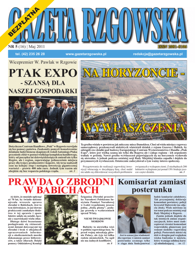 B E Z P ŁA T N A GAZETA RZGOWSKA NR 5 (16) | Maj 2011 tel. (42) 235 26 28 ISSN 2081-8106 www.gazetarzgowska.pl [email protected] Wicepremier W. Pawlak w Rzgowie Ptak Expo Na horyzoncie - szansą dla naszej gospodarki wywłaszczenia Dotychczas Centrum Handlowe „Ptak” w Rzgowie rozwijało się bez pomocy państwa. Znakomity pomysł i konsekwentne działanie ludzi biznesu skupionych wokół Antoniego Ptaka przyniosły efekt w postaci wielkiego kompleksu handlowego, który od początku lat dziewięćdziesiątych zmienił nie tylko Rzgów, ale i region, zapewniając jednocześnie miejsca pracy dla tysięcy producentów i kupców. Ale teraz nadszedł czas na kolejny etap i następną inwestycję gigantycznej wartości – prawie 400 mln euro. Jednak tym razem nie obejdzie się bez wsparcia polskiego rządu. str. 3 Ta groźba wisiała w powietrzu jak mityczny miecz Damoklesa. Choć od wielu miesięcy rzgowscy samorządowcy przekonywali niektórych właścicieli działek z rejonu Guzewa i Babich, by odstąpili swe działki pod budowę Europejskiego Centrum Wystawiennictwa i Handlu „Ptak Expo”, które jest wielką szansą nie tylko dla Rzgowa ale i całego regionu - ich argumenty trafiały w próżnię. Nawet groźba wywłaszczeń pojawiających się na horyzoncie wydawała się nierealna. A jednak podczas ostatniej sesji Rady Miejskiej klamka zapadła i dojdzie do przymusowych wywłaszczeń. Ostatecznie zadecydował o tym ważny interes społeczny. Przygotowania do realizacji rzgowskiej inwestycji wkraczają w decydującą fazę, choć nadal nie udało się zlikwidować wszystkich problemów Prawda o zbrodni w Babichach Aż dziw, że musiało upłynąć aż 70 lat, by światło dzienne ujrzała wreszcie sprawa zbrodni w Babichach. Jest to tym dziwniejsze, że już dawno praktycznie zamknięto śledztwo w tej sprawie i sporo faktów udało się ustalić, łącznie z nazwiskami wielu ofiar. Dlatego dziwi bezustanne posługiwanie się różnorodnymi datami dotyczącymi tej zbrodni i brak w oficjalnych opracowaniach informacji o okolicznościach mordu dokonanego przez hitlerowców, a także ofiarach. Dzięki pomocy Oddziałowej Komisji związanych z wykupem ziemi. Z niezbędnych 200 hektarów wykupiono już ponad 150 i brakuje jeszcze części działek. str. 3 Komisariat zamiast posterunku Ściganiaa Zbrodni przeciwko Narodowi Polskiemu Instytutu Pamięci Narodowej w Łodzi wypełniamy jeszcze jedną „białą plamę”, podając prawdę o wydarzeniach sprzed 70 laty. Niemi świadkowie mordów Babichy to niewielka wieś w pobliżu rzgowskiego lasu. Tu przed wojną mieszkają głównie Polacy, ale żyje też kilka rodzin niemieckich. Na ogół nie ma żadnych konfliktów. str. 8 Jest to sensacyjna wiadomość dla rzgowian: w mieście zamiast posterunku czynnego tylko w ciągu dnia funkcjonować będzie komisariat całodobowy. Tak przynajmniej deklaruje komendant powiatowy policji Krzysztof Dąbrowski (na zdjęciu obok). Wiele mówiono na ten temat podczas ostatniej sesji Rady Miejskiej w Rzgowie. Zanim jednak dojdzie do tak istotnych zmian organizacyjnych, które musi zaakceptować również komendant wojewódzki, planowany jest remont siedziby rzgowskiej policji. Posterunek mieści się dziś w drugim pod względem wieku budynku w mieście, który wymaga solidnej kuracji odmładzającej. str. 12 LOKALNIE str. 2 Pisane nad Nerem Zmiany w cenie Rzgowskie centrum zmienia się na lepsze z roku na rok. Na razie dzieje się tak głównie dzięki nowej siedzibie władz miejskich i sąsiedniemu parkowi. Ten ostatni powstał ponad sto lat temu, ale dopiero teraz nabiera kształtu ozdoby centrum miasta, a nie zbiorowiska drzew i krzewów, z nielicznymi ławkami i miejscowymi pijaczkami. Choć nowy park podoba się na ogół większości mieszkańców, niektórzy wybrzydzają, że za dużo w nim teraz granitowych płyt i kamiennej kostki i że wydane dotąd pieniądze można było przeznaczyć na inny cel, wszak potrzeb w Rzgowie jest sporo. To prawda – można było nie modernizować parku przez następne sto lat. I nie budować nowej siedziby władz miejskich. I żyć jak pół wieku temu. Z pewnością wielu przejezdnych z daleka omijałoby taki Rzgów i nie myślało o jakimkolwiek przystanku w tej miejscowości. Centrum miasta to wizytówka. Banał? Tak, ale celowo go przywołuję. A o wizytówkę trzeba dbać – czy to w tak dużym mieście jak Warszawa i Łódź, czy w znacznie mniejszym, jak choćby nasz Rzgów. Gospodarze miasta zapowiadają, że w kolejnym etapie zajmą się poszczególnymi pierzejami rynku i najcenniejszym zabytkiem miasta – XVII-wiecznym kościołem. Dopiero potem ta nasza wizytówka będzie zachęcała przybyszów do zatrzymania się i zwiedzenia Rzgowa, a może i… pozostania w nim na zawsze! Zastanawiam się, dlaczego niektórym nie przeszkadzał stary zarośnięty zielskiem park, momentami przypominający pijalnię piwa i kloakę, którą nawet miejscowi woleli omijać z daleka. Czyżby przyzwyczaili się do niej i nie wyobrażali sobie innego parku? A może chodzi o to, by wszystko było po staremu, by tradycyjnie można było narzekać na władzę i walić w nią niczym w kaczy kuper. Najlepiej w okolicach wyborów, by z tego jasno wynikało, że to my a nie oni, mamy monopol na urządzanie świata. Człowiek przyzwyczaja się do biedy i nie wyobraża sobie innego życia. Tylko nieliczni mieszkańcy slumsów usiłują wyrwać się z zaklętego kręgu ubóstwa, bo dostrzegli gdzieś inne, lepsze życie. W Rzgowie wciąż nie brakuje takich, którzy twierdzą, że nic nie należy zmieniać na lepsze, bo dobre już było… Na szczęście rządzą teraz tacy, którzy zmieniają Rzgów, budując piękną halę sportową i zmieniając już centrum sędziwego miasteczka, a także myśląc o nowym domu kultury, a także nowoczesnej obwodnicy. Zastępca Wielki dzień strażaków z Bronisina Dworskiego Rzadko się zdarza, by główny szef strażaków ochotników w Polsc