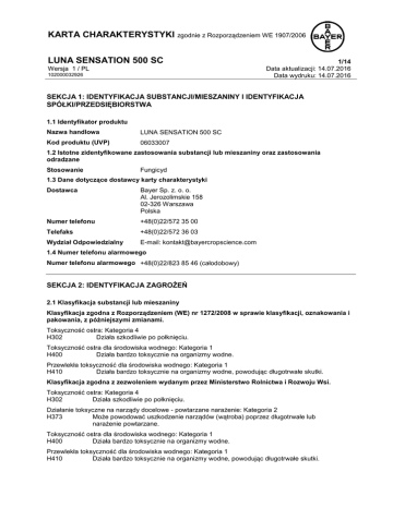 KARTA CHARAKTERYSTYKI zgodnie z Rozporządzeniem WE 1907/2006 LUNA SENSATION 500 SC Wersja 1 / PL 102000032926 1/14 Data aktualizacji: 14.07.2016 Data wydruku: 14.07.2016 SEKCJA 1: IDENTYFIKACJA SUBSTANCJI/MIESZANINY I IDENTYFIKACJA SPÓŁKI/PRZEDSIĘBIORSTWA 1.1 Identyfikator produktu Nazwa handlowa LUNA SENSATION 500 SC Kod produktu (UVP) 06033007 1.2 Istotne zidentyfikowane zastosowania substancji lub mieszaniny oraz zastosowania odradzane Stosowanie Fungicyd 1.3 Dane dotyczące dostawcy karty charakterystyki Dostawca Bayer Sp. z. o. o. Al. Jerozolimskie 158 02-326 Warszawa Polska Numer telefonu +48(0)22/572 35 00 Telefaks +48(0)22/572 36 03 Wydział Odpowiedzialny E-mail: [email protected] 1.4 Numer telefonu alarmowego Numer telefonu alarmowego +48(0)22/823 85 46 (całodobowy) SEKCJA 2: IDENTYFIKACJA ZAGROŻEŃ 2.1 Klasyfikacja substancji lub mieszaniny Klasyfikacja zgodna z Rozporządzeniem (WE) nr 1272/2008 w sprawie klasyfikacji, oznakowania i pakowania, z późniejszymi zmianami. Toksyczność ostra: Kategoria 4 H302 Działa szkodliwie po połknięciu. Toksyczność ostra dla środowiska wodnego: Kategoria 1 H400 Działa bardzo toksycznie na organizmy wodne. Przewlekła toksyczność dla środowiska wodnego: Kategoria 1 H410 Działa bardzo toksycznie na organizmy wodne, powodując długotrwałe skutki. Klasyfikacja zgodna z zezwoleniem wydanym przez Ministerstwo Rolnictwa i Rozwoju Wsi. Toksyczność ostra: Kategoria 4 H302 Działa szkodliwie po połknięciu. Działanie toksyczne na narządy docelowe - powtarzane narażenie: Kategoria 2 H373 Może powodować uszkodzenie narządów (wątroba) poprzez długotrwałe lub narażenie powtarzane. Toksyczność ostra dla środowiska wodnego: Kategoria 1 H400 Działa bardzo toksycznie na organizmy wodne. Przewlekła toksyczność dla środowiska wodnego: Kategoria 1 H410 Działa bardzo toksycznie na organizmy wodne, powodując długotrwałe skutki. KARTA CHARAKTERYSTYKI zgodnie z Rozporządzeniem WE 1907/2006 LUNA SENSATION 500 SC 2/14 Data aktualizacji: 14.07.2016 Data wydruku: 14.07.2016 Wersja 1 / PL 102000032926 2.2 Elementy oznakowania Oznakowanie zgodne z zezwoleniem wydanym przez Ministerstwo Rolnictwa i Rozwoju Wsi. Oznakowanie w zakresie dostawy/stosowania jest wymagane. Składniki stwarzające zagrożenie muszą być wymienione na etykiecie: Fluopyram Trifloksystrobina Hasło ostrzegawcze: Uwaga Zwroty wskazujące rodzaj zagrożenia H302 H373 H410 EUH401 EUH208 Działa szkodliwie po połknięciu. Może powodować uszkodzenie narządów (wątroba) poprzez długotrwałe lub narażenie powtarzane. Działa bardzo toksycznie na organizmy wodne, powodując długotrwałe skutki. W celu uniknięcia zagrożeń dla zdrowia ludzi i środowiska, należy postępować zgodnie z instrukcją użycia. Zawiera trifloksystrobinę, 1,2-benzoizotiazolin-3-on. Może powodować wystąpienie reakcji alergicznej. Zwroty wskazujące środki ostrożności P301 + P312 P314 P330 P391 W PRZYPADKU POŁKNIĘCIA: W przypadku złego samopoczucia skontaktować się z OŚRODKIEM ZATRUĆ lub z lekarzem. W przypadku złego samopoczucia zasięgnąć porady/ zgłosić się pod opiekę lekarza. Wypłukać usta. Zebrać wyciek. 2.3 Inne zagrożenia Inne zagrożenia nie są znane. SEKCJA 3: SKŁAD/INFORMACJA O SKŁADNIKACH 3.2 Mieszaniny Charakterystyka chemiczna Koncentrat w postaci stężonej zawiesiny (SC) Fluopyram 250 g/l, Trifloksystrobina 250 g/l Składniki stwarzające zagrożenie Zwroty wskazujące rodzaj zagrożenia zgodnie z Rozporządzeniem WE 1272/2008 Nazwa Nr CAS / Nr WE / Nr rejestracji REACH Fluopyram 658066-35-4 619-797-7 Klasyfikacja ROZPORZĄDZENIE (WE) NR 1272/2008 Aquatic Chronic 2, H411 Stężenie [%] 21,37 KARTA CHARAKTERYSTYKI zgodnie z Rozporządzeniem WE 1907/2006 LUNA SENSATION 500 SC 3/14 Data aktualizacji: 14.07.2016 Data wydruku: 14.07.2016 Wersja 1 / PL 102000032926 Trifloksystrobina 141517-21-7 1,2-Benzoizotiazol-3(2H)on 2634-33-5 220-120-9 Skin Sens. 1, H317 Aquatic Acute 1, H400 Aquatic Chronic 1, H410 Eye Dam. 1, H318 Aquatic Acute 1, H400 Acute Tox. 4, H302 Skin Sens. 1, H317 Skin Irrit. 2, H315 21,37 > 0,005 i < 0,05 Dalsze informacje Trifloksystrobina 141517-21-7 Współczynnik M: 100 (acute) Pełny tekst zwrotów H przytoczonych w tej Sekcji znajduje się w Sekcji 16. SEKCJA 4: ŚRODKI PIERWSZEJ POMOCY 4.1 Opis środków pierwszej pomocy Porady ogólne Usunąć z zagrożonej strefy. Natychmiast zdjąć całą zanieczyszczoną odzież i usunąć w bezpieczny sposób. Ułożyć i transportować poszkodowanego w stabilnej pozycji (bocznej ustalonej). W razie wypadku lub złego samopoczucia zasięgnąć natychmiast porady lekarza (w miarę możliwości pokazać etykietę). Wdychanie Przenieść na świeże powietrze. Zapewnić poszkodowanemu ciepło i spokój. Natychmiast wezwać lekarza lub powiadomić ośrodek toksykologiczny. Kontakt ze skórą Dokładnie zmyć dużą ilością wody z mydłem, jeżeli to możliwe z glikolem polietylenowym 400, a następnie spłukać wodą. Jeśli objawy utrzymują się, wezwać lekarza. Kontakt z oczami Natychmiast płukać dużą ilością wody, także pod powiekami przynajmniej przez 15 minut. Usunąć soczewki kontaktowe, jeżeli są obecne, po pierwszych 5 minutach, potem kontynuować płukanie oczu. Uzyskać pomoc medyczną w przypadku pojawienia się i utrzymywania podrażnienia. Połknięcie NIE prowokować wymiotów. Natychmiast wezwać lekarza lub powiadomić ośrodek toksykologiczny. Wypłukać usta. 4.2 Najważniejsze ostre i opóźnione objawy oraz skutki narażenia Objawy Do chwili obecnej nie są znane żadne objawy. 4.3 Wskazania dotyczące wszelkiej natychmiastowej pomocy lekarskiej i szczególnego postępowania z poszkodowanym Postępowanie Leczenie objawowe. Zazwyczaj nie jest wymagane płukanie żołądka. W przypadku połknięcia znacznych ilości (więcej niż łyk) podać węgiel aktywowany i siarczan sodu. Nie ma specyficznego antidotum. KARTA CHARAKTERYSTYKI zgodnie z Rozporz