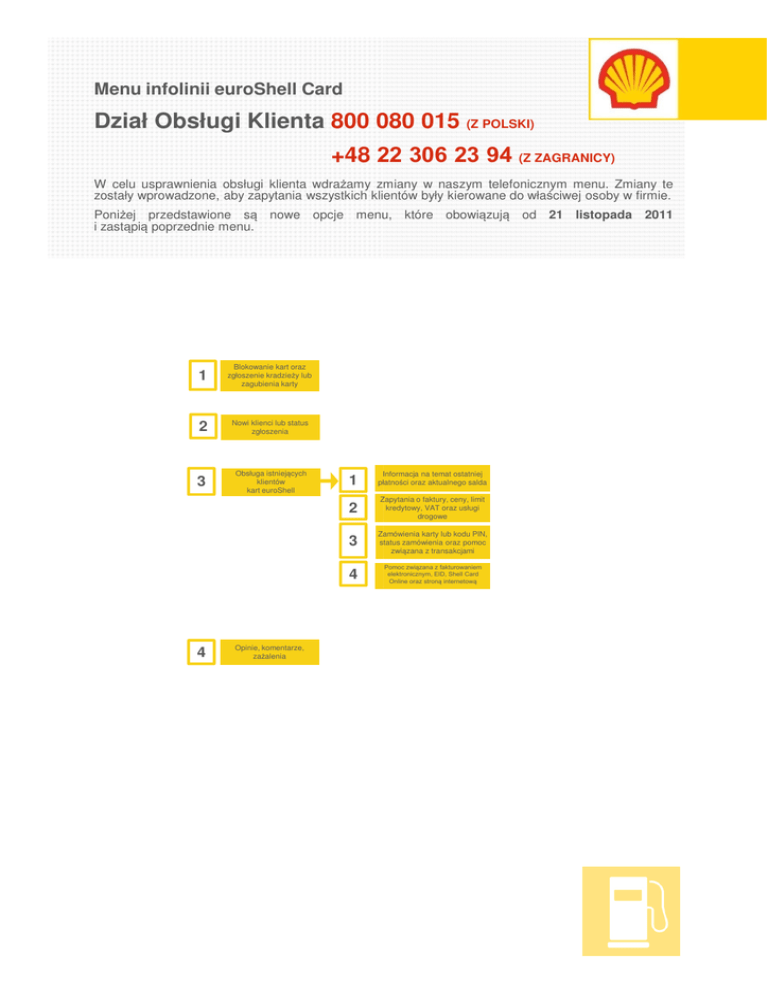 Menu infolinii euroShell Card Dział Obsługi Klienta 800 080 015 (Z POLSKI) +48 22 2 379 45 (Z ZAGRANICY) 306 75 23 94 W celu usprawnienia obsługi klienta wdrażamy zmiany w naszym telefonicznym menu. Zmiany te zostały wprowadzone, aby zapytania wszystkich klientów były kierowane do właściwej osoby w firmie. Poniżej przedstawione są nowe opcje menu, które obowiązują od 21 listopada 2011 i zastąpią poprzednie menu. 1 Blokowanie kart oraz zgłoszenie kradzieży lub zagubienia karty 2 Nowi klienci lub status zgłoszenia 3 Obsługa istniejących klientów kart euroShell 4 Opinie, komentarze, zażalenia 1 Informacja na temat ostatniej płatności oraz aktualnego salda płatno 2 Zapytania o faktury, ceny, limit kredytowy, VAT oraz usługi drogowe 3 Zamówienia karty lub kodu PIN, status zamówienia oraz pomoc związana z transakcjami 4 Pomoc związana z fakturowaniem elektronicznym, EID, Shell Card Online oraz stroną internetową