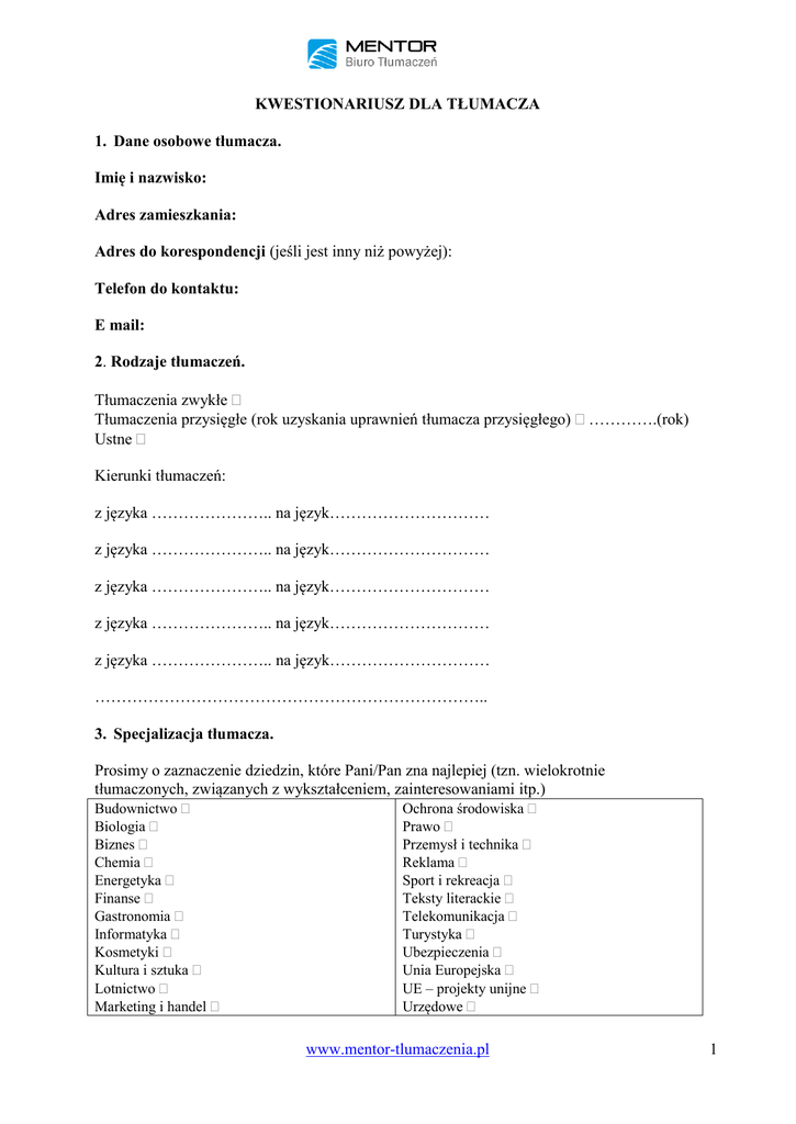 KWESTIONARIUSZ DLA TŁUMACZA 1. Dane osobowe tłumacza. Imię i nazwisko: Adres zamieszkania: Adres do korespondencji (jeśli jest inny niż powyżej): Telefon do kontaktu: E mail: 2. Rodzaje tłumaczeń. Tłumaczenia zwykłe Tłumaczenia przysięgłe (rok uzyskania uprawnień tłumacza przysięgłego) ………….(rok) Ustne Kierunki tłumaczeń: z języka ………………….. na język………………………… z języka ………………….. na język………………………… z języka ………………….. na język………………………… z języka ………………….. na język………………………… z języka ………………….. na język………………………… ……………………………………………………………….. 3. Specjalizacja tłumacza. Prosimy o zaznaczenie dziedzin, które Pani/Pan zna najlepiej (tzn. wielokrotnie tłumaczonych, związanych z wykształceniem, zainteresowaniami itp.) Budownictwo Biologia Biznes Chemia Energetyka Finanse Gastronomia Informatyka Kosmetyki Kultura i sztuka Lotnictwo Marketing i handel Ochrona środowiska Prawo Przemysł i technika Reklama Sport i rekreacja Teksty literackie Telekomunikacja Turystyka Ubezpieczenia Unia Europejska UE – projekty unijne Urzędowe www.mentor-tlumaczenia.pl 1 Medycyna Motoryzacja Nauki humanistyczne Normy i opisy patentowe …………………. Inne dziedziny (wymienić jakie): …………………………………………… dla jakiego przemysłu 4. Stawki za tłumaczenia. Forma rozliczenia: umowa o dzieło faktura VAT rachunek (bez VAT) Stawka za tłumaczenie pisemne zwykłe 1800zzs: z języka …………………. na język …………………….. stawka: …………………. z języka …………………. na język …………………….. stawka: …………………. Stawka za tłumaczenie pisemne przysięgłe 1125zzs: z języka …………………. na język …………………….. stawka: …………………. z języka …………………. na język …………………….. stawka: …………………. Stawka za uwierzytelnienie: z języka …………………. na język …………………….. stawka: …………………. z języka …………………. na język …………………….. stawka: …………………. Stawka za korektę tłumaczenia: z języka …………………. na język …………………….. stawka: …………………. z języka …………………. na język …………………….. stawka: …………………. Stawka za tłumaczenie ustne za godzinę: z języka …………………. na język …………………….. stawka: …………………. z języka …………………. na język …………………….. stawka: …………………. Ilość stron tłumaczonych dziennie: ……………………….. 5. Informacje o tłumaczu. Tłumaczenia wykonuje jako zajęcie: stałe dodatkowe Proszę podać miejsce stałej pracy: …………………………………………………………… Wykształcenie tłumacza (proszę podać nazwę uczelni, kierunek i specjalizację): wyższe: doktoranckie: średnie: Ukończone szkoły: Kolegium: ……………………………………………………………………………………. www.mentor-tlumaczenia.pl 2 Studia wyższe: 1. …………………………………………………………………………………………. 2. …………………………………………………………………………………………. Studia doktoranckie: …………………………………………………………………………… Inne: …………………………………………………………………………………………… Uprzejmie prosimy o przesłanie z wypełnionym kwestionariuszem: - CV (warunek konieczny) - referencji (jeśli tłumacz posiada) - podpisanej klauzuli o ochronie danych osobowych (zał nr 1) (warunek konieczny) - podpisanej klauzuli o zachowaniu poufności (zał nr 2) ((warunek konieczny) www.mentor-tlumaczenia.pl 3 Załącznik nr 1 KLAUZULA o ochronie danych osobowych Wyrażam zgodę na przetwarzanie moich danych osobowych zawartych w mojej ofercie pracy dla potrzeb niezbędnych do realizacji procesu rekrutacji i przechowywania moich danych dla celów współpracy z Mentor HRM S.C. zgodnie z ustawą z dnia 29.08.1997 roku o ochronie danych osobowych - Dz. U. nr 133 poz. 833. Podpis tłumacza www.mentor-tlumaczenia.pl 4 Załącznik nr 2 KLAUZULA o zachowaniu poufności Ja niżej podpisany/a ……………………………………….. zobowiązuje się do zachowania w tajemnicy wszystkich informacji przekazywanych przez MENTOR HRM S.C., niezależnie od formy przekazywania tych informacji i ich źródła. Zobowiązuje się do zachowania tajemnicy informacji zarówno dotyczących firmy MENTOR HRM S.C. jak również jej klientów i kontrahentów, oraz zobowiązuję się do nie ujawniania źródła tych informacji, osobom trzecim. Zobowiązuję się do zachowania w tajemnicy wszystkich informacji uzyskiwanych od MENTOR HRM S.C. bez potrzeby oznaczania tych informacji jako poufne. Oświadczam, że mam świadomość odpowiedzialności karnej oraz finansowej wynikającej z naruszenia niniejszego zobowiązania do zachowania w tajemnicy informacji poufnych. Podpis tłumacza www.mentor-tlumaczenia.pl 5
