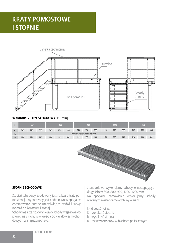 KRATY POMOSTOWE I STOPNIE Barierka techniczna Burtnice Pole pomostu Schody pomostu WYMIARY STOPNI SCHODOWYCH [mm] STOPNIE SCHODOWE Stopień schodowy zbudowany jest na bazie kraty pomostowej, wyposażony jest dodatkowo w specjalne obramowanie boczne umożliwiające szybki i łatwy montaż do konstrukcji nośnej. Schody mają zastosowanie jako schody wejściowe do piwnic, na strych, jako wejścia do kanałów samochodowych, w magazynach etc. ATT INOX DRAIN 82 Standardowo wykonujemy schody o następujących długościach: 600, 800, 900, 1000 i 1200 mm. Na specjalne zamówienie wykonujemy schody w różnych niestandardowych wymiarach. L - długość nośna B - szerokość stopnia h - wysokość stopnia n - rozstaw otworów w blachach policzkowych