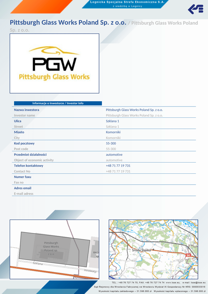 Pittsburgh Glass Works Poland Sp. z o.o. / Pittsburgh Glass Works Poland Sp. z o.o. Informacje o inwestorze / Investor info Nazwa inwestora Pittsburgh Glass Works Poland Sp. z o.o. Investor name Pittsburgh Glass Works Poland Sp. z o.o. Ulica Szklana 1 Street Szklana 1 Miasto Komorniki City Komorniki Kod pocztowy 55-300 Post code 55-300 Przedmiot działalności automotive Object of economic activity automotive Telefon kontaktowy +48 71 77 19 731 Contact No +48 71 77 19 731 Numer faxu Fax no Adres email E-mail adress