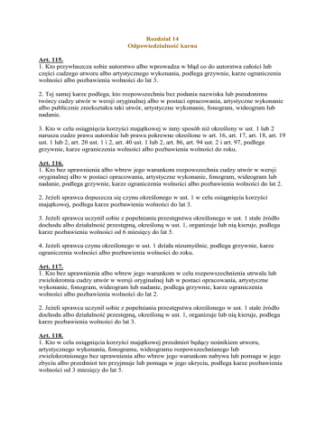 Rozdział 14 Odpowiedzialność karna Art. 115. 1. Kto przywłaszcza sobie autorstwo albo wprowadza w błąd co do autorstwa całości lub części cudzego utworu albo artystycznego wykonania, podlega grzywnie, karze ograniczenia wolności albo pozbawienia wolności do lat 3. 2. Tej samej karze podlega, kto rozpowszechnia bez podania nazwiska lub pseudonimu twórcy cudzy utwór w wersji oryginalnej albo w postaci opracowania, artystyczne wykonanie albo publicznie zniekształca taki utwór, artystyczne wykonanie, fonogram, wideogram lub nadanie. 3. Kto w celu osiągnięcia korzyści majątkowej w inny sposób niż określony w ust. 1 lub 2 narusza cudze prawa autorskie lub prawa pokrewne określone w art. 16, art. 17, art. 18, art. 19 ust. 1 lub 2, art. 20 ust. 1 i 2, art. 40 ust. 1 lub 2, art. 86, art. 94 ust. 2 i art. 97, podlega grzywnie, karze ograniczenia wolności albo pozbawienia wolności do roku. Art. 116. 1. Kto bez uprawnienia albo wbrew jego warunkom rozpowszechnia cudzy utwór w wersji oryginalnej albo w postaci opracowania, artystyczne wykonanie, fonogram, wideogram lub nadanie, podlega grzywnie, karze ograniczenia wolności albo pozbawienia wolności do lat 2. 2. Jeżeli sprawca dopuszcza się czynu określonego w ust. 1 w celu osiągnięcia korzyści majątkowej, podlega karze pozbawienia wolności do lat 3. 3. Jeżeli sprawca uczynił sobie z popełniania przestępstwa określonego w ust. 1 stałe źródło dochodu albo działalność przestępną, określoną w ust. 1, organizuje lub nią kieruje, podlega karze pozbawienia wolności od 6 miesięcy do lat 5. 4. Jeżeli sprawca czynu określonego w ust. 1 działa nieumyślnie, podlega grzywnie, karze ograniczenia wolności albo pozbawienia wolności do roku. Art. 117. 1. Kto bez uprawnienia albo wbrew jego warunkom w celu rozpowszechnienia utrwala lub zwielokrotnia cudzy utwór w wersji oryginalnej lub w postaci opracowania, artystyczne wykonanie, fonogram, wideogram lub nadanie, podlega grzywnie, karze ograniczenia wolności albo pozbawienia wolności do lat 2. 2. Jeżeli sprawca uczynił sobie z popełniania przestępstwa określonego w ust. 1 stałe źródło dochodu albo działalność przestępną, określoną w ust. 1, organizuje lub nią kieruje, podlega karze pozbawienia wolności do lat 3. Art. 118. 1. Kto w celu osiągnięcia korzyści majątkowej przedmiot będący nośnikiem utworu, artystycznego wykonania, fonogramu, wideogramu rozpowszechnianego lub zwielokrotnionego bez uprawnienia albo wbrew jego warunkom nabywa lub pomaga w jego zbyciu albo przedmiot ten przyjmuje lub pomaga w jego ukryciu, podlega karze pozbawienia wolności od 3 miesięcy do lat 5. 2. Jeżeli sprawca uczynił sobie z popełniania przestępstwa określonego w ust. 1 stałe źródło dochodu albo działalność przestępną, określoną w ust. 1, organizuje lub nią kieruje, podlega karze pozbawienia wolności od roku do lat 5. 3. Jeżeli na podstawie towarzyszących okoliczności sprawca przestępstwa określonego w ust. 1 lub 2 powinien i może przypuszczać, że przedmiot został uzyskany za pomocą czynu zabronionego, podlega grzywnie, karze ograniczenia wolności albo pozbawienia wolności do lat 2. Art. 118-1. 1. Kto wytwarza przedmioty przeznaczone do niedozwolonego usuwania lub obchodzenia technicznych zabezpieczeń przed odtwarzaniem, przegrywaniem lub zwielokrotnianiem utworu bądź też służące do nielegalnego odbioru nadawanych programów, przeznaczonych dla zamkniętego grona odbiorców, uzyskujących do nich dostęp po zapłaceniu wynagrodzenia usługodawcy, albo dokonuje obrotu takimi przedmiotami, podlega grzywnie, karze ograniczenia wolności albo pozbawienia wolności do lat 3. 2. Kto posiada, przechowuje lub wykorzystuje przedmioty, o których mowa w ust. 1, podlega grzywnie, karze ograniczenia wolności albo pozbawienia wolności do roku. Art. 119. Kto uniemożliwia lub utrudnia wykonywanie prawa do kontroli korzystania z utworu, artystycznego wykonania, fonogramu lub wideogramu albo odmawia udzielenia informacji przewidzianych w art. 47, podlega grzywnie, karze ograniczenia wolności albo pozbawienia wolności do roku. Art. 120. (skreślony). Art. 121. 1. W wypadku skazania za czyn określony w art. 115, 116, 117, 118 lub 118-1, sąd orzeka przepadek przedmiotów pochodzących z przestępstwa, chociażby nie były własnością sprawcy. 2. W wypadku skazania za czyn określony w art. 115, 116, 117 lub 118, sąd może orzec przepadek przedmiotów służących do popełnienia przestępstwa, chociażby nie były własnością sprawcy. Art. 122. Ściganie czynów określonych w art. 115, 116 ust. 1, 2 i 4, art. 117 ust. 1, art. 118 ust. 1, art. 118-1 oraz art. 119 następuje z oskarżenia prywatnego. Art. 122-1. W sprawach o przestępstwa określone w art. 115-119 pokrzywdzonym jest również właściwa organizacja zbiorowego zarządzania prawami autorskimi lub prawami pokrewnymi. Art. 123. Minister Sprawiedliwości, w drodze rozporządzenia, może wyznaczyć sądy rejonowe właściwe do rozpoznawania spraw o przestępstwa, o których mowa w art. 115-119 - na obszarze właściwości danego sądu okręgowego.