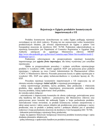 Rejestracja w Egipcie produktów kosmetycznych importowanych z UE Produkty kosmetyczne dystrybuowane na rynku Egiptu podlegają rejestracji zezwalającej na ich obrót rynkowy. Wymóg ten ma zastosowanie wobec kosmetyków produkowanych lokalnie, jak również importowanych do Egiptu z państw Unii Europejskiej stosownie do dyrektywy EEC 76/768. Podmiotem odpowiedzialnym za rejestrację kosmetyków jest Department of Cosmetics Registration w Egyptian Drug Authority należącym do egipskiego Ministerstwa Zdrowia /MOHP/ http://www.eda.mohealth.gov.eg/Services/Cosmetics.aspx?Main=Services&Serviceid=2 &Submain=serv11 . Podmiotem zobowiązanym do przeprowadzenia rejestracji kosmetyku importowanego jest egipska firma importująca, dla której wystawiany jest certyfikat rejestracyjny. Opłata za przeprowadzenie procedury i wydanie certyfikatu rejestracyjnego produktu w wysokości 2.000,- funtów egipskich /EGP/ jest ponoszona przez podmiot rejestrujący i wpłacana na rzecz Central Administration for Pharmaceutical Affairs /CAPA/ w Ministerstwie Zdrowia. Pozostałe ponoszone koszty to opłata rejestracyjna w wysokości 100,- EGP oraz opłaty techniczne/skarbowe w wysokości łączenj ok. 20,EGP. Procedura rejestracji kosmetyków importowanych z UE rozpoczyna się od złożenia wniosku wstępnego /initial soft file/ o rejestrację prezentującego: - rodzaj rejestrowanego produktu, nazwę produktu, dane producenta i właściciela produktu, dane egipskiej firmy importujacej, przeznaczenie produktu, stan/rodzaj fizyczny produktu, rodzaj opakowania i ilość produktu; do wniosku należy dołączyć: - zaświadczenie o dopuszczeniu kosmetyku do obrotu rynkowego, poświadczone przez izbę handlową lub izbę handlowo - przemysłową lub Ministerstwo Zdrowia oraz autoryzowane przez konsulat lub ambasadę Egiptu w kraju pochodzenia produktu. Zaświadczenie winno stwierdzać, że produkt kosmetyczny zostanie zarejestrowany o takiej samej nazwie i takim samym składzie jak produkowany przez podanego z nazwy producenta, oraz że produkt o podanej nazwie i podanym składzie jest w sprzedaży rynkowej w kraju pochodzenia stosownie do dyrektywy Unii Europejskiej EEC 76/768; - dokument potwierdzający rejestrację firmy producenta; - kopię /na papierze firmowym/ kompozycji ilościowej produktu kosmetycznego i opisu działania elementów składowych; - pełną informację o opakowaniu handlowym produktu kosmetycznego; 1 - kopię zaświadczenia o okresie ważności/przydatności do użycia produktu kosmetycznego potwierdzonego przez izbę handlową kraju pochodzenia; - potwierdzenie rejestru gospodarczego egipskiej firmy importowej oraz numer jej rejestru podatkowego; - dokument upoważniający egipską firmę importową do przeprowadzenia rejestracji produktu kosmetycznego, potwierdzony przez izbę handlową i autoryzowany przez ambasadę lub konsulat Egiptu w kraju pochodzenia produktu; - upoważnienie egipskiej firmy importującej dla jej jednego przedstawiciela do przeprowadzenia rejestracji produktu kosmetycznego w Egipcie. W celu uzyskania ostatecznego zezwolenia na rejestrację produktu kosmetycznego należy w toku procesu rejestracyjnego przedstawić dokumenty /final hard file/: - wniosek o rejestrację w 10 egzemplarzach wraz ze składem produktu i etykietą produktu; - oryginał zaświadczenia o wniesieniu opłaty za rejestrację w wysokości 2.000,- EGP; - oryginał zaświadczenia o rejestracji produktu; - oryginał zaświadczenia o składzie produktowym kosmetyku; - próbkę produktu kosmetycznego dla analizy przez komitet naukowy; - zaświadczenie na papierze firmowym o analizie składu kosmetyku i stosowanych metodach analizy /w 7 egzemplarzach/; - oryginał zaświadczenia o terminie przydatności produktu do użycia; - referencje naukowe nt. działania składu produktowego kosmetyku, a w przypadku zawierania przez kosmetyk naturalnych ziół lub ich ekstraktów – referencje naukowe o ich działaniu i korzystnym wpływie na skórę; - oryginały zaświadczeń o wpłaceniu opłaty rejestracyjnej 100,- EGP oraz opłat dodatkowych w wysokości ok. 20,- EGP. Wniosek o rejestrację przedstawiany jest komitetowi technicznemu w Department of Cosmetics Registration, a następnie naukowemu w National Organization for Drug Control and Research /NODCAR/ w Ministerstwie Zdrowia. Po wstępnym wydaniu decyzji rejestracyjnej kosmetyku przeprowadzana jest analiza zgodności rejestracji i kontroli próbek produktu przez NODCAR, wydającą ostateczną decyzję zezwalajacą na marketing produktu. Okres wymagany dla przeprowadzenia pełnej procedury rejestracji produktu kosmetycznego importowanego do Egiptu wynosi 80 dni i nie powinien przekraczać 4 miesięcy. Informacje o procedurze rejestracji kosmetyków w Egipcie publikuje Central Administration for Pharmaceutical Affairs na stronie internetowej www.eda.mohp.gov.eg Sporządził: Tomasz Przygoda I-szy Sekretarz WPHI Kair, luty 2013 r. 2