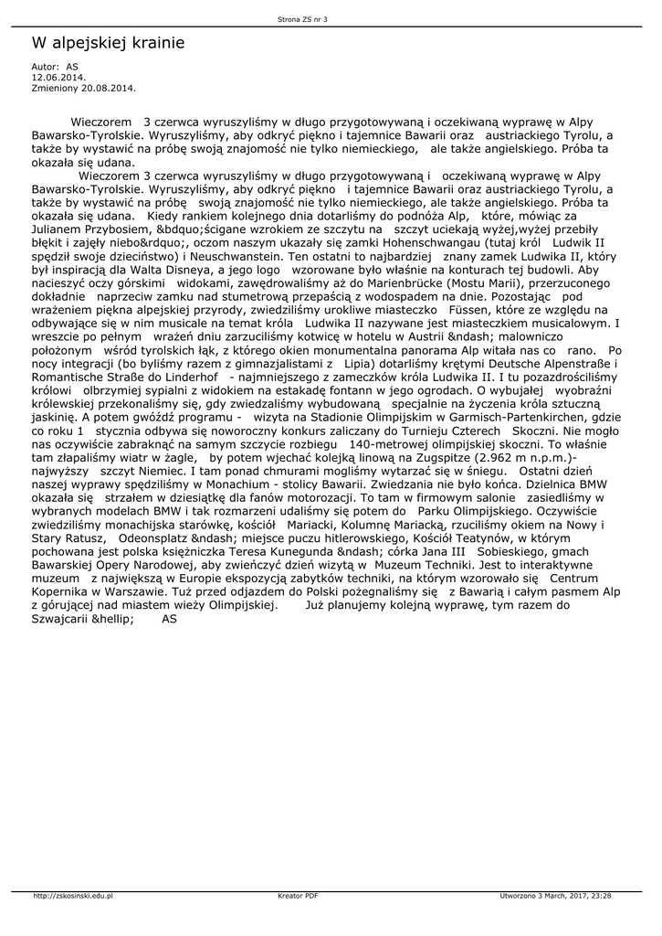 Strona ZS nr 3 W alpejskiej krainie Autor: AS 12.06.2014. Zmieniony 20.08.2014. Wieczorem 3 czerwca wyruszyliśmy w długo przygotowywaną i oczekiwaną wyprawę w Alpy Bawarsko-Tyrolskie. Wyruszyliśmy, aby odkryć piękno i tajemnice Bawarii oraz austriackiego Tyrolu, a także by wystawić na próbę swoją znajomość nie tylko niemieckiego, ale także angielskiego. Próba ta okazała się udana. Wieczorem 3 czerwca wyruszyliśmy w długo przygotowywaną i oczekiwaną wyprawę w Alpy Bawarsko-Tyrolskie. Wyruszyliśmy, aby odkryć piękno i tajemnice Bawarii oraz austriackiego Tyrolu, a także by wystawić na próbę swoją znajomość nie tylko niemieckiego, ale także angielskiego. Próba ta okazała się udana. Kiedy rankiem kolejnego dnia dotarliśmy do podnóża Alp, które, mówiąc za Julianem Przybosiem, „ścigane wzrokiem ze szczytu na szczyt uciekają wyżej,wyżej przebiły błękit i zajęły niebo”, oczom naszym ukazały się zamki Hohenschwangau (tutaj król Ludwik II spędził swoje dzieciństwo) i Neuschwanstein. Ten ostatni to najbardziej znany zamek Ludwika II, który był inspiracją dla Walta Disneya, a jego logo wzorowane było właśnie na konturach tej budowli. Aby nacieszyć oczy górskimi widokami, zawędrowaliśmy aż do Marienbrücke (Mostu Marii), przerzuconego dokładnie naprzeciw zamku nad stumetrową przepaścią z wodospadem na dnie. Pozostając pod wrażeniem piękna alpejskiej przyrody, zwiedziliśmy urokliwe miasteczko Füssen, które ze względu na odbywające się w nim musicale na temat króla Ludwika II nazywane jest miasteczkiem musicalowym. I wreszcie po pełnym wrażeń dniu zarzuciliśmy kotwicę w hotelu w Austrii – malowniczo położonym wśród tyrolskich łąk, z którego okien monumentalna panorama Alp witała nas co rano. Po nocy integracji (bo byliśmy razem z gimnazjalistami z Lipia) dotarliśmy krętymi Deutsche Alpenstraße i Romantische Straße do Linderhof - najmniejszego z zameczków króla Ludwika II. I tu pozazdrościliśmy królowi olbrzymiej sypialni z widokiem na estakadę fontann w jego ogrodach. O wybujałej wyobraźni królewskiej przekonaliśmy się, gdy zwiedzaliśmy wybudowaną specjalnie na życzenia króla sztuczną jaskinię. A potem gwóźdź programu - wizyta na Stadionie Olimpijskim w Garmisch-Partenkirchen, gdzie co roku 1 stycznia odbywa się noworoczny konkurs zaliczany do Turnieju Czterech Skoczni. Nie mogło nas oczywiście zabraknąć na samym szczycie rozbiegu 140-metrowej olimpijskiej skoczni. To właśnie tam złapaliśmy wiatr w żagle, by potem wjechać kolejką linową na Zugspitze (2.962 m n.p.m.)najwyższy szczyt Niemiec. I tam ponad chmurami mogliśmy wytarzać się w śniegu. Ostatni dzień naszej wyprawy spędziliśmy w Monachium - stolicy Bawarii. Zwiedzania nie było końca. Dzielnica BMW okazała się strzałem w dziesiątkę dla fanów motorozacji. To tam w firmowym salonie zasiedliśmy w wybranych modelach BMW i tak rozmarzeni udaliśmy się potem do Parku Olimpijskiego. Oczywiście zwiedziliśmy monachijska starówkę, kościół Mariacki, Kolumnę Mariacką, rzuciliśmy okiem na Nowy i Stary Ratusz, Odeonsplatz – miejsce puczu hitlerowskiego, Kościół Teatynów, w którym pochowana jest polska księżniczka Teresa Kunegunda – córka Jana III Sobieskiego, gmach Bawarskiej Opery Narodowej, aby zwieńczyć dzień wizytą w Muzeum Techniki. Jest to interaktywne muzeum z największą w Europie ekspozycją zabytków techniki, na którym wzorowało się Centrum Kopernika w Warszawie. Tuż przed odjazdem do Polski pożegnaliśmy się z Bawarią i całym pasmem Alp z górującej nad miastem wieży Olimpijskiej. Już planujemy kolejną wyprawę, tym razem do Szwajcarii … AS http://zskosinski.edu.pl Kreator PDF Utworzono 3 March, 2017, 23:28