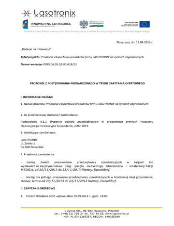 Piaseczno, dn. 19.09.2013 r. „Dotacje na innowacje” Tytuł projektu: Promocja eksportowa produktów firmy LASOTRONIX na rynkach zagranicznych Numer wniosku: POIG.06.05.02-00-018/13 PROTOKÓŁ Z POSTĘPOWANIA PROWADZONEGO W TRYBIE ZAPYTANIA OFERTOWEGO I. INFORMACJE OGÓLNE 1. Nazwa projektu: Promocja eksportowa produktów firmy LASOTRONIX na rynkach zagranicznych 2. Oś priorytetowa/ działanie/ poddziałanie: Poddziałanie 6.5.2 Wsparcie udziału przedsiębiorców w programach promocji Programu Operacyjnego Innowacyjna Gospodarka, 2007-2013. 3. Udzielający zamówienia: LASOTRONIX ul. Żytnia 1 05-500 Piaseczno 4. Przedmiot zamówienia: nocleg dwóch pracowników przedsiębiorcy uczestniczących w targach lub wystawach na międzynarodowe targi sprzętu medycznego laboratoriów i rehabilitacji Targi MEDICA, od 20/11/2013 do 23/11/2013 Niemcy, Dusseldorf. - nocleg dla jednego pracownika przedsiębiorcy uczestniczących w branżowej misji gospodarczej Niemcy, termin od 20/11/2013 do 23/11/2013 Niemcy, Dusseldorf. II. ZAPYTANIE OFERTOWE 1. Termin składania ofert upływał dnia 19.09.2013 r., godz. 14:00 1 Zytnia Str., 05-500 Piaseczno, POLAND tel.: (+48 22) 736 34 34, 737 34 35; www.lasotronix.pl NIP: PL 5341265357, REGON: 140055389 2. Zapytanie ofertowe zostało przesłane do wybranych oferentów, ponadto zostało zamieszczone na stronie internetowej www.lasotronix.pl oraz w siedzibie firmy : LASOTRONIX ul. Żytnia 1 05-500 Piaseczno 3. Odebrana odpowiedz od potencjalnego Zleceniobiorcy: WEBERS DAS Hotel im RUHTRURM Huttropstr.60 45138 Essen 4. Streszczenie metody oceny oferty: Otrzymano i wybrano ofertę WEBERS DAS Hotel im RUHTRURM. Oferta WEBERS DAS Hotel im RUHTRURM spełnia wszystkie formalne oraz merytoryczne wymagania zamawiającego i uzyskała maksymalną liczbę punktów według kryteriów wyboru. Wybrany oferent był najtańszy. 5. Postępowanie przeprowadziła: Agnieszka Jarek – specjalista ds. finansowo-księgowych i administracyjnych podpis osoby/ osób upoważnionych pieczątka firmowa 1 Zytnia Str., 05-500 Piaseczno, POLAND tel.: (+48 22) 736 34 34, 737 34 35; www.lasotronix.pl NIP: PL 5341265357, REGON: 140055389