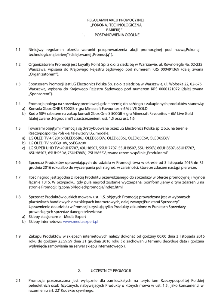 REGULAMIN AKCJI PROMOCYJNEJ „POKONAJ TECHNOLOGICZNĄ BARIERĘ ” 1. POSTANOWIENIA OGÓLNE 1.1. Niniejszy regulamin określa warunki przeprowadzenia akcji promocyjnej pod nazwą„Pokonaj technologiczną barierę” (dalej zwanej „Promocją” ). 1.2. Organizatorem Promocji jest Loyalty Point Sp. z o.o. z siedzibą w Warszawie, ul. Równoległa 4a, 02-235 Warszawa, wpisana do Krajowego Rejestru Sądowego pod numerem KRS 000491369 (dalej zwana „Organizatorem”). 1.3. Sponsorem Promocji jest LG Electronics Polska Sp. z o.o. z siedzibą w Warszawie, ul. Wołoska 22, 02-675 Warszawa, wpisana do Krajowego Rejestru Sądowego pod numerem KRS 0000121072 (dalej zwana „Sponsorem”). 1.4. Promocja polega na sprzedaży premiowej, gdzie premię do każdego z zakupionych produktów stanowią: a) Konsola Xbox ONE S 500GB + gra Minecraft Favourites + 6M LIVE GOLD b) Kod z 50% rabatem na zakup konsoli Xbox One S 500GB + gra Minecraft Favourites + 6M Live Gold (dalej zwane „Nagrodami”) z zastrzeżeniem, ust. 1.5 oraz ust. 1.6 1.5. Towarami objętymi Promocją są dystrybuowane przez LG Electronics Polska sp. z o.o. na terenie Rzeczypospolitej Polskiej telewizory LG, modele: a) LG OLED TV 4K 2016: OLED55B6J, OLED55C6V, OLED65B6J, OLED65C6V, OLED65E6V b) LG OLED TV: 55EG910V, 55EG920V c) LG SUPER UHD TV: 49UH7707, 49UH8507, 55UH7707, 55UH8507, 55UH950V, 60UH8507, 65UH7707, 65UH8507, 65UH950V, 75UH780V, 75UH855V, zwane razem wspólnie „Produktami” 1.6. Sprzedaż Produktów uprawniających do udziału w Promocji trwa w okresie od 3 listopada 2016 do 31 grudnia 2016 roku albo do wyczerpania puli nagród, w zależności, które ze zdarzeń nastąpi pierwsze. 1.7. Ilość nagród jest zgodna z ilością Produktu przewidzianego do sprzedaży w ofercie promocyjnej i wynosi łącznie 1315. W przypadku, gdy pula nagród zostanie wyczerpana, poinformujemy o tym zdarzeniu na stronie Promocji: lg.com/pl/lgoled/promocja/index.html 1.8. 1.9. Sprzedaż Produktów o jakich mowa w ust. 1.5. objętych Promocją prowadzona jest w wybranych placówkach handlowych oraz sklepach internetowych, dalej zwanych „Punktami Sprzedaży”. Uprawnienie do udziału w Promocji uzyskują tylko Produkty zakupione w Punktach Sprzedaży prowadzących sprzedaż danego telewizora: a) Sklepy stacjonarne: Media Expert b) Sklepy internetowe: www.mediaexpert.pl Zakupu Produktów w sklepach internetowych należy dokonać od godziny 00:00 dnia 3 listopada 2016 roku do godziny 23:59:59 dnia 31 grudnia 2016 roku ( o zachowaniu terminu decyduje data i godzina wpłynięcia zamówienia na serwer sklepu internetowego ). 2. 2.1. UCZESTNICY PROMOCJI Promocja przeznaczona jest wyłącznie dla zamieszkałych na terytorium Rzeczypospolitej Polskiej pełnoletnich osób zycznych, nabywających Produkty o których mowa w ust. 1.5., jako konsumenci w rozumieniu art. 221 Kodeksu cywilnego. 2.2. W Promocji nie mogą brać udziału pracownicy Organizatora oraz Sponsora. W Promocji nie mogą brać udziału również członkowie rodzin osób powyżej wymienionych. Przez członków rodziny, o których mowa powyżej, rozumie się: wstępnych, zstępnych, rodzeństwo, małżonków i osoby pozostające w stosunku przysposobienia. 3. 3.1. 3.2 3.3. WARUNKI UDZIAŁU W PROMOCJI W celu wzięcia udziału w Promocji jej uczestnik powinien kolejno spełnić następujące warunki: a) w okresie, o jakim mowa w ust. 1.6., nabyć w jednym z Punktów Sprzedaży przynajmniej jeden Produkt oraz zachować oryginał dowodu zakupu (paragon lub fakturę) określający model zakupionego Telewizora, oraz; b) w okresie od 3 listopada 2016 r. do 31 grudnia 2016 r. zarejestrować się poprzez formularz, zwany dalej „Stroną Formularza Promocji”, dostępny pod adresem strefalg.pl wskazany na stronie internetowej: lg.com/pl/lgoled/promocja/index.html , zwaną dalej „Stroną Promocji” ; c) po rejestracji o jakiej mowa w ust. 3.1. lit. b) nie później niż do 7 stycznia 2017 r. zarejestrować Produkt poprzez formularz wskazany na Stronie Promocji. Rejestrując się zgodnie z ust. 3.1 pkt b) uczestnik Promocji: a) podaje swoje następujące dane osobowe: imię, nazwisko, datę urodzenia, adres zamieszkania, adres poczty elektronicznej, numer telefonu komórkowego, aktywowany w sieci operatora telefonii komórkowej korzystającego z polskich zasobów numeracji; b) podaje i potwierdza proponowane hasło do logowania na Stronie Formularza Promocji; c) wyraża zgodę na przetwarzanie swoich danych osobowych w celu realizacji Promocji oraz w celach marketingowych Organizatora, d) może wyrazić zgodę na otrzymywanie informacji handlowych za pomocą środków komunikacji elektronicznej, w szczególności poczty elektronicznej. Uczestnik Promocji, który dokonał rejestracji zgodnie z ust. 3.2. na podany adres poczty elektronicznej otrzyma wiadomość e-mail z prośbą o potwierdzenie rejestracji. Rejestracja powinna zostać potwierdzona w ciągu 48 godzin od wysłania e-maila z prośbą o potwierdzenie, poprzez wejście na podany w tym e-mailu link do podstrony Strony Formularza Promocji. W wypadku bezskutecznego upływu tego terminu, rejestracja będzie uważana za niedokonaną. 3.4. Dokonanie prawidłowej rejestracji zgodnie z ustępami 3.2. oraz 3.3. umożliwia logowanie się na Stronie Formularza Promocji z użyciem hasła podanego przez uczestnika oraz adresu e-mail uczestnika Promocji w charakterze loginu. 3.5. W celu rejestracji Produktu o jakim mowa ust. 3.1. lit. c) uczestnik po zalogowaniu się na konto na Stronie Formularza Promocji, powinien wejść na podstronę „Dodaj Sprzęt”, a następnie wybrać z listy lub wpisać: a) model zakupionego Produktu, b) nazwę sieci sprzedaży, w której dokonano zakupu Produktu, c) datę zakupu w okresie, o jakim mowa w ust.1.6., d) cenę zakupionego Produktu, e) numer seryjny Produktu, f) numer paragonu lub faktury VAT zakupionego Produktu, g) zdjęcie lub skan paragonu albo faktury VAT potwierdzających zakup Produktu, h) zdj