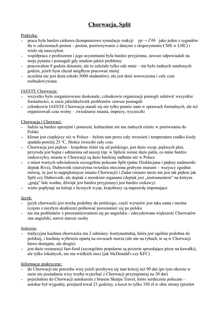 Chorwacja, Split Praktyka: – praca była bardzo ciekawa (komputerowe symulacje reakcji pp Z bb jako jeden z sygnałów tła w zderzeniach proton – proton, porównywanie z danymi z eksperymentu CMS w LHC) i wiele się nauczyłem – współpraca z profesorem i jego asystentami była bardzo przyjemna, zawsze odpowiadali na moje pytania i pomagali gdy miałem jakieś problemy – pracowałem 8 godzin dziennie, ale to zależało tylko ode mnie – nie było żadnych ustalonych godzin, jeżeli bym chciał mógłbym pracować mniej – uczelnia nie jest duża (około 5000 studentów), ale jest dość nowoczesna i cały czas rozbudowywana IAESTE Chorwacja: – wszystko było zorganizowane doskonale, członkowie organizacji pomogli załatwić wszystkie formalności, w razie jakichkolwiek problemów zawsze pomagali – członkowie IAESTE Chorwacja starali się nie tylko pomóc nam w sprawach formalnych, ale też organizowali czas wolny – zwiedzanie miasta, imprezy, wycieczki Chorwacja i Chorwaci: – ludzie są bardzo uprzejmi i pomocni, kulturalnie nie ma żadnych różnic w porównaniu do Polski – klimat jest cieplejszy niż w Polsce – bylem tam przez cały wrzesień i temperatura rzadko kiedy spadała poniżej 25 oC, Słońce świeciło cały czas – Chorwacja jest piękna – krajobraz różni się od polskiego, jest dużo wysp, pięknych plaż, przyroda jest bujna i odmienna od naszej (np. w Splicie rośnie dużo palm, co mnie bardzo zaskoczyło), miasta w Chorwacji są dużo bardziej zadbane niż w Polsce – z miast wartych odwiedzenia szczególnie polecam Split (pałac Dioklecjana i piękny nadmorski deptak Riva), Dubrovnik (starożytna twierdza otoczona grubymi murami – wszyscy zgodnie mówią, że jest to najpiękniejsze miasto Chorwacji) i Zadar (miasto może nie jest tak piękne jak Split czy Dubrovnik, ale deptak z morskimi organami (deptak jest „instrumentem” na którym „grają” fale wodne, dźwięk jest bardzo przyjemny) jest bardzo ciekawy) – warto popłynąć na którąś z licznych wysp, krajobrazy są naprawdę imponujące Język: – język chorwacki jest trochę podobny do polskiego, część wyrazów jest taka sama i można (często z niezłym skutkiem) próbować porozumieć się po polsku – nie ma problemów z porozumiewaniem się po angielsku - zdecydowana większość Chorwatów zna angielski, nawet starsze osoby Jedzenie: – tradycyjna kuchnia chorwacka ma 2 odmiany: kontynentalną, która jest ogólnie podobna do polskiej, i kuchnię wybrzeża opartą na owocach morza (ale nie na rybach, te są w Chorwacji łatwo dostępne, ale drogie) – jest dużo restauracji fast-food (szczególnie popularne są pizzerie sprzedające pizze na kawałki), ale tylko lokalnych, nie ma wielkich sieci (jak McDonald's czy KFC) Informacje praktyczne: – do Chorwacji nie potrzeba wizy jeżeli przebywa się tam krócej niż 90 dni (po tym okresie w razie nie posiadania wizy trzeba wyjechać z Chorwacji przynajmniej na 30 dni) – pojechałem do Chorwacji autokarem z biurem Skarpa Travel, które serdecznie polecam – autokar był wygodny, przejazd trwał 23 godziny, a koszt to tylko 350 zł w obie strony (przelot – – – – – samolotem jest dużo droższy i do Splitu nie dało się dolecieć bezpośrednio, nie wiem ile kosztuje przejazd pociągiem) aby przekroczyć granicę wystarczy dowód osobisty, ale podczas załatwiania formalności zawsze proszono o paszport w pierwszych dniach pobytu jest dużo formalności do załatwienia: pozwolenia na pracę, dokumenty z organizacji studenckiej dla osoby która nas zatrudnia, konto w banku (jest konieczne, inaczej nam nie zapłacą – takie jest prawo), itp.; mimo, iż osoby z IAESTE chodziły z nami wszędzie i dbały o załatwienie wszystkiego całość zajęła 3 dni ceny podobne do polskich, jednak są wyjątki np. jednorazowy bilet autobusowy kosztuje aż 10kn (około 5 zł), elektronika też jest droższa studenci w Chorwacji mają „X-kartica” - karty, dzięki którym mają bardzo duże zniżki na obiady na uczelni (dostają je wszyscy studenci), dzięki nim można zjeść całkiem dobry obiad za 5-6kn (około 3zł) – IAESTE nie może ich załatwiać studentom z wymiany, ale można ją od kogoś pożyczyć między miastami łatwo jest się przemieszczać autokarami – jeździ ich sporo, są wygodne, a ceny biletów znośne (trzeba tylko pamiętać, że jeżeli kupuje się bilet w dwie strony to po przyjeździe na miejsce trzeba pokazać bilet w kasie biletowej, powiedzieć kiedy chce się wrócić i wykupić miejscówkę za 4kn (około 2zł) – sprzedający bilety nie zawsze o tym mówią) Widok na jedną z plaż w Splicie Jeden z placów w Dubrovniku Widok z murów Dubrovnika Riva w Splicie Deptak w Trogirze Mury Dubrovnika