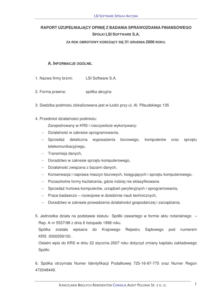 RAPORT UZUPEŁNIAJ CY OPINI Z BADANIA SPRAWOZDANIA FINANSOWEGO SPÓŁKI LSI SOFTWARE S.A. ZA ROK OBROTOWY KO CZ CY SI 31 GRUDNIA 2006 ROKU. A. INFORMACJE OGÓLNE. 1. Nazwa firmy brzmi: LSI Software S.A. 2. Forma prawna: spółka akcyjna 3. Siedziba podmiotu zlokalizowana jest w Łodzi przy ul. Al. Piłsudskiego 135 4. Przedmiot działalno ci podmiotu: Zarejestrowany w KRS i rzeczywi cie wykonywany: − Działalno w zakresie oprogramowania, − Sprzeda detaliczna wyposa enia biurowego, komputerów oraz sprz tu telekomunikacyjnego, − Transmisja danych, − Doradztwo w zakresie sprz tu komputerowego, − Działalno − Konserwacja i naprawa maszyn biurowych, ksi guj cych i sprz tu komputerowego, − Pozaszkolne formy kształcenia, gdzie indziej nie sklasyfikowane. − Sprzeda hurtowa komputerów, urz dze peryferyjnych i oprogramowania, − Prace badawczo – rozwojowe w dziedzinie nauk technicznych, − Doradztwo w zakresie prowadzenia działalno ci gospodarczej i zarz dzania. zwi zana z bazami danych, 5. Jednostka działa na podstawie statutu Spółki zawartego w formie aktu notarialnego – Rep. A nr 5537/98 z dnia 6 listopada 1998 roku. Spółka została wpisana do Krajowego Rejestru S dowego pod numerem KRS 0000059150 . Ostatni wpis do KRS w dniu 22 stycznia 2007 roku dotyczył zmiany kapitału zakładowego Spółki. 6. Spółka otrzymała Numer Identyfikacji Podatkowej 725-16-97-775 oraz Numer Regon 472048449. 1 7. Rok obrotowy Spółki rozpocz ł si 1 stycznia 2006 roku i zako czył 31 grudnia 2006 roku. 8. Kapitał własny Spółki na dzie 31.12.2006 roku wynosi 4 402 239,39 PLN. Kapitał podstawowy Spółki na dzie 31.12.2006 roku wynosi 2 067 036,00 PLN. Kapitał podstawowy dzieli si na akcje w ilo ci 2 067 036 po 1,00 PLN ka da. Struktura własno ciowa kapitału na dzie 31 grudnia 2005 roku : - Grzegorz Siewiera 47,36 % - Paweł Tarnowski 20,49 % - Regionalne Fundusze Inwestycyjne Sp. z o.o. 18,00 % - Paweł Podgórny 8,11 % - Ewa Tarnowska 2,77 % - Tomasz Wili ski 2,66 % - pozostali akcjonariusze 0,61 % Struktura własno ciowa kapitału na dzie 31 grudnia 2006 roku: - Grzegorz Siewiera 52,35 % - Paweł Tarnowski 14,64 % - Regionalne Fundusze Inwestycyjne Sp. z o.o. 12,75 % - Paweł Podgórny 5,07 % - Tomasz Wili ski 2,10 % - Ewa Tarnowska 0,51 % - pozostali akcjonariusze 12,58 % Struktura własno ciowa kapitału do dnia zako czenia badania nie uległa zmianie. 9. Skład Kierownictwa na dzie 31 grudnia 2005 roku oraz na dzie 31 grudnia 2006 roku: Siewiera Grzegorz - Prezes Zarz du Tarnowski Paweł - Wiceprezes Zarz du Podgórny Paweł - Członek Zarz du Do dnia zako czenia badania wyst piły zmiany w składzie Kierownictwa: Dnia 23 marca 2007 roku Nadzwyczajne Walne Zgromadzenie Spółki odwołało Pawła Podgórnego z funkcji Członka Zarz du. 2 10. Skład Rady Nadzorczej na 31 grudnia 2005 roku: • • • • • • Piotr Wilkowski Edward Siera ski Ewa Tarnowska Krzysztof Kalinowski Agata Sobieszek Krzywicka – Przewodnicz cy Rady Nadzorczej – Wiceprzewodnicz cy Rady Nadzorczej – Członek Rady Nadzorczej – Członek Rady Nadzorczej – Członek Rady Nadzorczej Skład Rady Nadzorczej na 31 grudnia 2006 roku: • • • • • Piotr Wilkowski Edward Siera ski Krzysztof Kalinowski Anna Pyrek Kazimierz Wieczorek – Przewodnicz cy Rady Nadzorczej – Wiceprzewodnicz cy Rady Nadzorczej – Członek Rady Nadzorczej – Członek Rady Nadzorczej – Członek Rady Nadzorczej Z dniem 23 marca 2007 roku tj. do dnia zako czenia badania, na mocy uchwały Nadzwyczajnego Walnego Zgromadzenia Akcjonariuszy ustanowiono nast puj cy skład Rady Nadzorczej: • • • • • Piotr Wilkowski Paweł Podgórny Krzysztof Kalinowski Anna Pyrek Andrzej Ziółkowski – Przewodnicz cy Rady Nadzorczej – Wiceprzewodnicz cy Rady Nadzorczej – Członek Rady Nadzorczej – Członek Rady Nadzorczej – Członek Rady Nadzorczej 11. Prokury nie udzielono. 12. Zwyczajne Walne Zgromadzenie Akcjonariuszy Spółki w dniu 29 czerwca 2006 roku zatwierdziło zbadane przez Kancelari Biegłych Rewidentów Consilia Audit Polonia Sp. z o.o. sprawozdanie finansowe na dzie 31.12.2005 roku. Jednostka otrzymała opini bez zastrze e . Zwyczajne Walne Zgromadzenie Akcjonariuszy Spółki postanowiło zysk netto za rok 2005 w kwocie 343 438,42 PLN przeznaczy na pokrycie strat z lat ubiegłych. 13. Sprawozdanie finansowe za rok ko cz cy si 31 grudnia 2005 roku zostało zło one w S dzie Rejestrowym w dniu 12 lipca 2006 roku. Spółka dopełniła obowi zku ogłoszenia sprawozdania finansowego za rok ko cz cy si 31 grudnia 2005 roku w Monitorze Polskim B. Zostało ono opublikowane dnia 21.03.2007 roku. 3 14. Działalno Jednostki za rok ko cz cy si 31 grudnia 2006 roku zamkn ła si zyskiem netto w wysoko ci: 629 591,10 PLN. 15. W roku obrotowym obj tym badaniem nast piła zmiana nazwy firmy, pod któr Spółka działa. Poprzednia firma brzmiała : Laser Systemy Informatyczne S.A. , po zmianie firma brzmi : LSI Software S.A. W dniu 19 wrze nia 2006 dokonano zmiany danych w Krajowym Rejestrze S dowym i wpisano now firm Spółki. B. ZLECENIE PRZEPROWADZENIA BADANIA I SPOSÓB REALIZACJI ZLECENIA. 1. Dnia 15 grudnia 2006 roku zostali my wybrani uchwał Rady Nadzorczej Spółki, na biegłego rewidenta w celu wydania opinii o sprawozdaniu finansowym za okres od 1 stycznia 2006 roku do 31 grudnia 2006 roku. 2. Badanie sprawozdania finansowego zostało przeprowadzone na podstawie umowy nr 34/B/2006/2007 z dnia 20 grudnia 2006 roku, zawartej pomi dzy LSI Software S.A., a Kancelari Biegłych Rewidentów Consilia Audit Polonia Sp. z o.o., wpisan na prowadzon przez Krajow Izb Biegłych Rewidentów list podmiotów uprawnionych do badania sprawozda finansowych pod numerem 548. 3. W celu wykonania tych decyzji Zarz d zlecił nam badanie sprawozdania finansowego sporz dzonego na 31 grudnia 2006 roku. Sprawozdanie finansowe Spółki zostało doł czone jako zał cznik do niniejszego raportu. Badane sprawozdanie finansowe zostało sporz