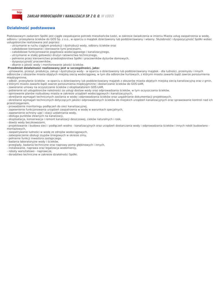 Działalność podstawowa Podstawowym zadaniem Spółki jest ciągłe zaspakajanie potrzeb mieszkańców Łodzi, w zakresie świadczenia w imieniu Miasta usług zaopatrzenia w wodę, odbioru i przesyłania ścieków do GOŚ Sp. z o.o., w oparciu o majątek dzierżawiony lub poddzierżawiany i własny. Służebność i dyspozycyjność Spółki wobec usługobiorców realizowana jest poprzez: - utrzymanie w ruchu ciągłym produkcji i dystrybucji wody, odbioru ścieków oraz - całodobowe kierowanie i sterowanie tymi procesami, - całodobowe funkcjonowanie pogotowia wodociągowego i kanalizacyjnego, - utrzymanie w stałej gotowości drużyn ratownictwa technicznego, - pełnienie przez kierownictwo przedsiębiorstwa Spółki i pracowników dyżurów domowych, - dyspozycyjność pracowników, - dbanie o jakość wody i monitorowanie jakości ścieków. Przedmiot działalności realizowany jest w szczególności, jako: - ujmowanie, przesył, produkcja, zakup i dystrybucja wody - w oparciu o dzierżawiony lub poddzierżawiany majątek - dla ludności, przemysłu i innych odbiorców z obszarów miasta objętych miejską siecią wodociągową, w tym dla odbiorców hurtowych, z którymi miasto zawarło bądź zawrze porozumienia międzygminne, - odbiór, przesyłanie ścieków - w oparciu o dzierżawiony lub poddzierżawiany majątek z obszarów miasta objętych miejską siecią kanalizacyjną oraz z gmin, z którymi miasto zawarło bądź zawrze porozumienia międzygminne i dostarczanie ścieków do GOŚ ŁAM, - zawieranie umowy na oczyszczanie ścieków z eksploatatorem GOŚ ŁAM, - pobieranie od usługobiorców należności za usługi dostaw wody oraz odprowadzania ścieków, w tym oczyszczania ścieków, - opiniowanie planów rozbudowy miasta w zakresie urządzeń wodociągowych i kanalizacyjnych, - określanie wymagań technicznych zasilania w wodę i odprowadzania ścieków oraz uzgadnianie dokumentacji projektowych, - określanie wymagań technicznych dotyczących jakości odprowadzanych ścieków do miejskich urządzeń kanalizacyjnych oraz sprawowanie kontroli nad ich przestrzeganiem, - prowadzenie monitoringu podłączeń do sieci kanalizacyjnej, - zapewnienie funkcjonowania urządzeń zaopatrzenia w wodę w warunkach specjalnych, - zapewnienie ochrony ujęć i stacji uzdatniania wody, - obsługa punktów zlewnych na kanalizacji, - eksploatacja, konserwacja i remont kanalizacji deszczowej, cieków naturalnych i rzek, - dowóz wody beczkowozami, - projektowanie i budowa sieci i podłączeń wodno - kanalizacyjnych oraz urządzeń dostarczania wody i odprowadzania ścieków i innych robót budowlano montażowych, - zaopatrywanie ludności w wodę ze zdrojów wodociągowych, - zabezpieczenie obsługi zsypów śniegowych w okresie zimy, - pełnienie funkcji inwestora zastępczego, - badania laboratoryjne wody i ścieków, - przeglądy, badania techniczne oraz naprawy pomp głębinowych i innych, - instalowanie, naprawa oraz legalizacja wodomierzy, - roboty warsztatowo - naprawcze, - doradztwo techniczne w zakresie działalności Spółki.