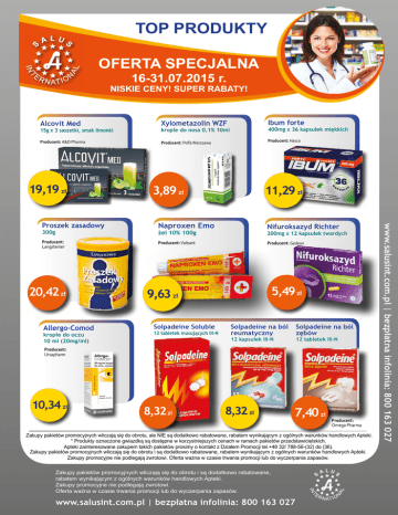 TOP PRODUKTY OFERTA SPECJALNA 16-31.07.2015 r. NISKIE CENY! SUPER RABATY! Alcovit Med Xylometazolin WZF Ibum forte Producent: A&D Pharma Producent: Polfa Warszawa Producent: Hasco 15g x 3 saszetki, smak limonki 19,19 zł 300g Producent: Langsteiner 20,42 zł Allergo-Comod krople do oczu 10 ml (20mg/ml) 11,29 zł 3,89 zł Naproxen Emo Nifuroksazyd Richter Producent: Valeant Producent: Gedeon żel 10% 100g 200mg x 12 kapsułek twardych 5,49 zł 9,63 zł Solpadeine Soluble 12 tabletek musujących III-N Solpadeine na ból reumatyczny Solpadeine na ból zębów 12 kapsułek III-N 12 tabletek III-N Producent: Ursapharm 10,34 zł 8,32 zł 8,32 zł 7,40 zł Producent: Omega Pharma Zakupy pakietów promocyjnych wliczają się do obrotu, ale NIE są dodatkowo rabatowane, rabatem wynikającym z ogólnych warunków handlowych Apteki. * Produkty oznaczone gwiazdką są dostępne w korzystniejszych cenach w ramach pakietów przedstawicielskich. Apteki zainteresowane zakupem takich pakietów prosimy o kontakt z Działem Promocji tel.+48 32/ 788-56-(32) do (36). Zakupy pakietów promocyjnych wliczają się do obrotu i są dodatkowo rabatowane, rabatem wynikającym z ogólnych warunków handlowych Apteki. Zakupy promocyjne nie podlegają zwrotowi. Oferta ważna w czasie trwania promocji lub do wyczerpania zapasów. Zakupy pakietów promocyjnych wliczają się do obrotu i są dodatkowo rabatowane, rabatem wynikającym z ogólnych warunków handlowych Apteki. Zakupy promocyjne nie podlegają zwrotowi. Oferta ważna w czasie trwania promocji lub do wyczerpania zapasów. www.salusint.com.pl | bezpłatna infolinia: 800 163 027 www.salusint.com.pl | bezpłatna infolinia: 800 163 027 Proszek zasadowy 400mg x 36 kapsułek miękkich krople do nosa 0,1% 10ml Produkty promocyjne firmy 3M Nazwa Gaza jałowa opatrunkowa 1/2 m2 (17nit) Gaza jałowa opatrunkowa 1m2 (17nit.) Kompr.jał. 5x5cm x3szt 8w17n Kompr.jał. 7,5x7,5cm x3szt 8w17n Opaska dziana podtrzym. 4m x 5cm Opaska dziana podtrzym. 4m x 10cm Opaska dziana podtrzym. 4m x 15cm Opaska elast.z zapinką 5m x 8cm /3M Opaska elast.z zapinką 5m x 10cm /3M Opaska elast.z zapinką 5m x 12cm /3M Opaska elast.z zapinką 5m x 15cm /3M Pl.Prestopor 1m x 6cm włóknin. Pl.Prestopor 1m x 8cm włóknin. Pl.Prestovis Plus 1m x 6cm Pl.Prestovis Plus 1m x 8cm Pl.VISCOPLAST Elastyczny 1mx6cm Pl.VISCOPLAST Kubuś i Przyjaciele 10szt Pl.VISCOPLAST Uniwersalny zestaw 24sz Pl.VISCOPLAST Wodoodporny Plus zest.10sz Pl.VISCOPLAST Wodoodporny zestaw 12szt. Pl.VISCOPLAST Zestaw turystyczny x 24szt Pl.n/odc.Poloderm x 6szt. Pl.n/pęch.VISCOPLAST żelowe duże x 4 Pl.n/pęch.VISCOPLAST żelowe małe x 6 Pl.n/pęch.VISCOPLAST żelowe średnie x 5 Pl.n/pęch.VISCOPLAST żelowy mix x 7 Producent 3M 3M 3M 3M 3M 3M 3M 3M 3M 3M 3M 3M 3M 3M 3M 3M 3M 3M 3M 3M 3M 3M 3M 3M 3M 3M Rabat Ilość min. 5% Produkty promocyjne firmy A&D Pharma Oferta specjalna 16-31.07.2015 r. Nazwa Alcovit Med prosz. 15g x 3sasz.sm.limon Alcovit Med prosz. 15g x 8sasz.sm.limon Alcovit Med prosz. 15g x 25sasz(DISPLAY) Blend-a-dent Fresh klej 47g Blend-a-dent Original klej 47g Blend-a-dent PlusDual Power klej 40g Blend-a-dent PlusDual Protect.klej 40g Dentibaby żel d/masażu dziąseł 25ml Duraphat płyn d/płuk.j.ustnej 400ml Elmex żel do fluoryzacji 25g Enterol 250mg x 10 sasz. Enterol 250mg x 10 kaps.(butel.) Enterol 250mg x 20 kaps.(4x5) Miniprost x 30kaps.miękkie Miniprost x 60kaps.miękkie Oral-B nici dent.SuperFloss 50m Oral-B nici dent.UltraFloss 25m StopAL prosz.antyalergiczny spray d/nosa Unimer Baby aspirator do nosa Unimer Baby NaCl 0,9% 5ml x 50amp. Unimer Pediatric hypertonic aer.100ml Unimer Pediatric isotoniczny aer.100ml AndroVit Plus x 30kaps. Producent A&D Pharma A&D Pharma A&D Pharma A&D Pharma A&D Pharma A&D Pharma A&D Pharma A&D Pharma A&D Pharma A&D Pharma A&D Pharma A&D Pharma A&D Pharma A&D Pharma A&D Pharma A&D Pharma A&D Pharma A&D Pharma A&D Pharma A&D Pharma A&D Pharma A&D Pharma A&D Pharma Rabat 40% 40% 40% 8% 8% 8% 8% 10% 5% 5% 9% 9% 9% 50% 50% 5% 5% 5% 10% 10% 10% 10% 12% Ilość min. PAKIET SZTYWNY Nazwa Bobik D wit.D3 x 40kaps.twist-off Bobik D wit.D3 x 40kaps.twist-off/pp/ Bobik DHA x 30 kaps.twist-off Bobik DHA x 30 kaps.twist-off/pp/ Satorin Zatoki Forte x 30 tabl.powl Satorin Zatoki Forte x 30 tabl.powl /pp/ Satorin Zatoki Forte x 60 tabl.powl Satorin Zatoki Forte x 60 tabl.powl /pp/ 2 Producent A&D Pharma A&D Pharma A&D Pharma A&D Pharma A&D Pharma A&D Pharma A&D Pharma A&D Pharma Rabat 99% 99% 99% 99% Zakupy pakietów promocyjnych wliczają się do obrotu i są dodatkowo rabatowane, rabatem wynikającym z ogólnych warunków handlowych Apteki. Zakupy promocyjne nie podlegają zwrotowi. Oferta ważna w czasie trwania promocji lub do wyczerpania zapasów. www.salusint.com.pl | bezpłatna infolinia: 800 163 027 Ilość min. 2 1 3 1 1 1 1 1 Produkty promocyjne firmy A&D Pharma c.d. Nazwa Efferalgan 80mg x 10czopków Efferalgan 150mg x 10czopków Efferalgan 300mg x 10czopków Efferalgan 500mg x 16 tabl.mus. Efferalgan C 500mg x 20 tabl.mus. Efferalgan Forte 1g x 8tabl.mus.(folia) Upsarin C x 10 tabl.mus. Upsarin C x 20 tabL.mus. Fervex D x 8 sasz. b/cukrowe Fervex o sm.cytrynowym x 8 saszetek Fervex o sm.malinowym x 8 saszetek Dafalgan Codeine x 16 tabl. III-N Efferalgan z Codeiną 16tab.mus. III-N Producent A&D Pharma A&D Pharma A&D Pharma A&D Pharma A&D Pharma A&D Pharma A&D Pharma A&D Pharma A&D Pharma A&D Pharma A&D Pharma A&D Pharma A&D Pharma Rabat Ilość min. 7% 3 5% 5 10% 10 Rabat Ilość min. 25% 2 Rabat 15% 20% 15% 20% 10% 15% 20% 18% 25% 10% 15% 22% 20% 22% 15% 14% 18% 20% 20% 15% 25% 15% 20% 20% 30% Ilość min. 5 10 6 12 4 8 12 8 15 5 4 8 4 8 5 5 10 3 4 4 8 5 10 5 10 20% 8 15% 25% 15% 20% 20% 5% 15% 10% 5% 15% 10% 15% 30% 10% 15% 4 8 5 5 5 3 5 3 5 5 6 15 30 2 5 Produkty promocyjne firmy Abbott Nazwa Lutamax Duo 10mg x 30 kaps. Lutamax Duo 20mg x 30 kaps. Producent Abbott Abbott Produkty promocyjne firmy Aflofarm Producent Aflofarm Aflofarm Aflofarm Aflofarm Aflofarm Aflof