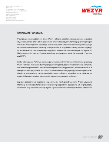 Wezyr Holiday Service Sp. z o.o. Adgar Plaza ul. Postępu 17 B, 02-676 Warszawa tel. 801 44 44 00; fax. +48 22 591 80 51 www.wezyrholidays.pl [email protected] KRS: 0000042618 NIP: 525-21-40-453 REGON: 016122937 Kapitał zakładowy: 20 000 000 PLN Szanowni Państwo, W związku z wprowadzeniem przez Wezyr Holidays bezbiletowej odprawy na wszystkie loty począwszy od 24.04.2013r. posiadanie biletów lotniczych w formie papierowej nie jest konieczne. Obowiązkowe pozostaje posiadanie pozostałych dokumentów podróży, czyli vouchera do hotelu oraz instrukcji postępowania w przypadku szkody, w razie nagłego zachorowania lub nieszczęśliwego wypadku, a także bonów zniżkowych na wycieczki fakultatywne (trip vouchery) otrzymanych za wczesną rezerwacją (w promocji ,,Premiera lata 2013’’). Osoba obsługująca Państwa rezerwację w biurze podróży (pracownik salonu sprzedaży Wezyr Holidays lub agent turystyczny) zobowiązana jest do wydrukowania kompletu dokumentów i przekazania ich Państwu lub przesłania drogą mailową pliku w formacie PDF (bilety lotnicze – opcjonalnie, vouchery do hotelu oraz instrukcje postępowania w przypadku szkody, w razie nagłego zachorowania lub nieszczęśliwego wypadku, bony zniżkowe na wycieczki fakultatywne) na minimum 24 h przed planowanym wylotem. Odprawa paszportowo-bagażowa rozpoczyna sie na 2h przed wylotem. W celu uzyskania informacji o numerze stanowiska do odprawy paszportowo-bagażowej lub w przypadku problemów przy odprawie prosimy zgłosić się do przedstawiciela Wezyr Holidays na lotnisku.