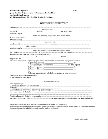 Komornik Sądowy przy Sądzie Rejonowym w Radzyniu Podlaskim Andrzej Sienkiewicz ul. Wyszyńskiego 3A ; 21-300 Radzyń Podlaski dnia .................................... WNIOSEK EGZEKUCYJNY Wierzyciel(ka) ........................................................................................................................................ (nazwisko i imię) Nr PESEL ................................ , Nr NIP ................................. , Nr Dow.Osob. ...................................... zamieszkały(a) ......................................................................................................................................... (adres: kod pocztowy, miejscowość, ulica, numer domu) Konto bankowe nr .................................................................................................................................... DłuŜnik(czka) .......................................................................................................................................... (nazwisko i imię) urodzony(a) ........................................................ syn(córka) ............................................................... (data i miejsce) zamieszkały(a) ......................................................................................................................................... (adres: kod pocztowy, miejscowość, ulica, numer domu) Nr PESEL ............................. , Nr NIP ..................................... , Nr Dow.Osob. ...................................... Przedkładam wyrok, protokół, postanowienie Sądu ................................................................................. .................................................. w .............................................. z dnia ................................................... sygnatura akt .......................................................................................................................................... i wnoszę o wszczęcie egzekucji przeciwko dłuŜnikowi(czce) w celu wyegzekwowania: 1. pretensji głównej _____________________________ zł z zasądzonymi odsetkami od ............................ do dnia zapłaty 2. kosztów procesu _____________________________ zł 3. kosztów klauzuli _____________________________ zł. 4. _____________________________________________ 5. kosztów egzekucyjnych, które powstaną w toku egzekucji Wnoszę o wszczęcie egzekucji z: 1. ruchomości dłuŜnika tj. ........................................................................................................................ .................................................................................................................................................................. (wymienić ruchomości) znajdujące się w ....................................................................................................................................... 2. rachunku bankowego dłuŜnika nr ........................................................................................................ w banku ...................................................................................... 3. świadczenia emerytalno-rentowego pobieranego w ............................................................................. 4. wierzytelności dłuŜnika w postaci ......................................................................................................... ............................................................................................................................................................... 5. nieruchomości dłuŜnika połoŜonej w .................................................................................................... nr księgi wieczystej KW ......................................... prowadzonej przez Sąd Rejonowy w Radzyniu Podl. Wnoszę o przeprowadzenie poszukiwania majątku dłuŜnika przez komornika. Jednocześnie oświadczam, Ŝe zobowiązuję się do niezwłocznego informowania Komornika w przypadku otrzymania bezpośrednio od dłuŜnika jakichkolwiek wpłat tytułem zadłuŜenia. .......................................................... (podpis wierzyciela)