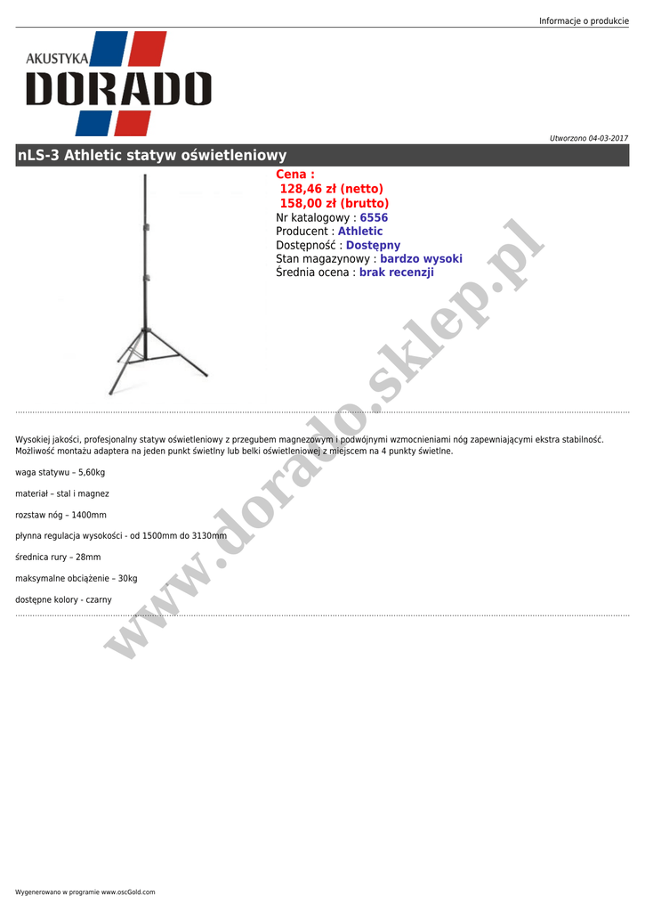 Informacje o produkcie Utworzono 04-03-2017 nLS-3 Athletic statyw oświetleniowy o. sk le p. p Nr katalogowy : 6556 Producent : Athletic Dostępność : Dostępny Stan magazynowy : bardzo wysoki Średnia ocena : brak recenzji l Cena : 128,46 zł (netto) 158,00 zł (brutto) .d or ad Wysokiej jakości, profesjonalny statyw oświetleniowy z przegubem magnezowym i podwójnymi wzmocnieniami nóg zapewniającymi ekstra stabilność. Możliwość montażu adaptera na jeden punkt świetlny lub belki oświetleniowej z miejscem na 4 punkty świetlne. waga statywu – 5,60kg materiał – stal i magnez rozstaw nóg – 1400mm płynna regulacja wysokości - od 1500mm do 3130mm w średnica rury – 28mm maksymalne obciążenie – 30kg w w dostępne kolory - czarny Wygenerowano w programie www.oscGold.com