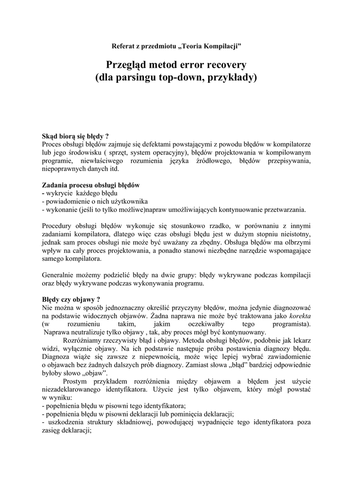 Referat z przedmiotu „Teoria Kompilacji” Przegląd metod error recovery (dla parsingu top-down, przykłady) Skąd biorą się błędy ? Proces obsługi błędów zajmuje się defektami powstającymi z powodu błędów w kompilatorze lub jego środowisku ( sprzęt, system operacyjny), błędów projektowania w kompilowanym programie, niewłaściwego rozumienia języka źródłowego, błędów przepisywania, niepoprawnych danych itd. Zadania procesu obsługi błędów - wykrycie każdego błędu - powiadomienie o nich użytkownika - wykonanie (jeśli to tylko możliwe)napraw umożliwiających kontynuowanie przetwarzania. Procedury obsługi błędów wykonuje się stosunkowo rzadko, w porównaniu z innymi zadaniami kompilatora, dlatego więc czas obsługi błędu jest w dużym stopniu nieistotny, jednak sam proces obsługi nie może być uważany za zbędny. Obsługa błędów ma olbrzymi wpływ na cały proces projektowania, a ponadto stanowi niezbędne narzędzie wspomagające samego kompilatora. Generalnie możemy podzielić błędy na dwie grupy: błędy wykrywane podczas kompilacji oraz błędy wykrywane podczas wykonywania programu. Błędy czy objawy ? Nie można w sposób jednoznaczny określić przyczyny błędów, można jedynie diagnozować na podstawie widocznych objawów. Żadna naprawa nie może być traktowana jako korekta (w rozumieniu takim, jakim oczekiwałby tego programista). Naprawa neutralizuje tylko objawy , tak, aby proces mógł być kontynuowany. Rozróżniamy rzeczywisty błąd i objawy. Metoda obsługi błędów, podobnie jak lekarz widzi, wyłącznie objawy. Na ich podstawie następuje próba postawienia diagnozy błędu. Diagnoza wiąże się zawsze z niepewnością, może więc lepiej wybrać zawiadomienie o objawach bez żadnych dalszych prób diagnozy. Zamiast słowa „błąd” bardziej odpowiednie byłoby słowo „objaw”. Prostym przykładem rozróżnienia między objawem a błędem jest użycie niezadeklarowanego identyfikatora. Użycie jest tylko objawem, który mógł powstać w wyniku: - popełnienia błędu w pisowni tego identyfikatora; - popełnienia błędu w pisowni deklaracji lub pominięcia deklaracji; - uszkodzenia struktury składniowej, powodującej wypadnięcie tego identyfikatora poza zasięg deklaracji; Większość kompilatorów zawiadamia po prostu o objawach, pozostawiając diagnozowanie użytkownikowi. Błąd jest wykrywany wtedy i tylko wtedy, gdy wynikiem jego jest ob. Jaw na ruszający definicję języka. Oznacza to w praktyce, że procedura obsługo błędów zależy od definicji języka, a nie zależy od analizowanego programu źródłowego. Implementując proces obsługi błędów należy starać się, aby zawiadomienie o każdym z nich podano zostało jak najwcześniej. Jeśli objaw może być zauważony podczas kompilacji, należy o nim poinformować. Warto jednak zachować pewną ostrożność i nie zawiadamiać o błędach prze wystąpieniem ich objawów. (Np. wyrażenie dzielenie przez zero jest zgodne zarówno ze składnią jak i z semantyką, natomiast objaw – dzielenie przez zero występuje tylko podczas wykonania programu czasie obliczenia wartości wyrażenia. Warto zatem aby kompilator nie zawiadamiał o błędzie w tym przypadku nawet gdyby go wykrył, w rzeczywistości bowiem to wyrażenie może być nigdy nie wyliczone i wówczas program będzie poprawny.) Reakcje na objawy Rozróżniamy trzy zasadnicze poziomy reakcji na objawy: - raport: Przekazanie użytkownikowi sygnału o wystąpieniu błędu. Określenie objawu, wskazanie dokładnego miejsca jego wystąpienia i próba postawienia diagnozy. - wydobywanie z błędów: Doprowadzenie procesu (kompilacji, wykonania) do logicznego stanu i kontynuacja w celu znalezienia dalszych błędów. - naprawa: Próba postawienia diagnozy błędu na podstawie zaobserwowanego objawu. Jeśli diagnoza wydaje się poprawna, dokonanie stosownej zmiany w programie lub danych i kontynuacja przetwarzania. Raport zawiera: - numer błędu - pozycję w tekście źródłowym - podana w formie opisu istota wydobycia się kompilatora z błędu Poziomy raportów - o anomaliach 1) Uwaga 2) Komentarz – krytyka stylu programowania 3) Ostrzeżenie – odnoszą się do możliwych błędów - o rzeczywistych błędach lub pogwałceniu ograniczeń 4) Błąd – mogą być naprawione 5) Błąd zgubny – wstrzymują tworzenie programu wykonywanego 6) Błąd śmiertelny – przerwanie kompilacji Def: Błąd (pozycja, powaga, kod ) Błędy wykryte w czasie kompilacji są wykrywane podczas analizy programu źródłowego. Def: Błędy zgubne Nieekonomiczne lub niemożliwe do naprawy. Kompilator po osiągnięciu miejsca wystąpienia błędu wyprodukować kod przerywający ten program. Def: Błędy śmiertelne Pewne błędy (lub ograniczenia) uniemożliwiające kompilatorowi kontynuowanie działań. Podstawowym wymaganiem, które muszą spełniać techniki wydobywania z błędów jest to, aby system nie przerywał działania w wyniku wystąpienia błędu, gdyż wówczas nie byłoby żadnego komunikatu o błędzie (a nawet informacji o dokładnym położeniu objawu ). Kompilator powinien wydobywać się z prawie wszystkich objawów, wykrywając tyle, ile tylko jest możliwe w pojedynczym wykonaniu. Istnieją jednak pewne błędy, które uniemożliwiają kompilatorowi wykonanie (tzw. błędy śmiertelne), w takiej sytuacji kompilator powinien poinformować o zaistniałej sytuacji i zakończyć działanie. Proces wydobywania wymaga by kompilator dokonywał pewnej zmiany swojego stanu w celu osiągnięcia zgodności. Zmiana ta może spowodować pojawienie się rzekomych błędów w dalszym tekście. Który w rzeczywistości jest poprawny. Takie rzekomy błędy tworzą lawinę, a jednym z głównych kryteriów dla schematu wydobywania jest minimalizacji lawin. Jeśli kompilator może diagnozować i naprawiać wszystkie błędy z dużym prawdopodobieństwem sukcesu, to program można bezpiecznie wyko