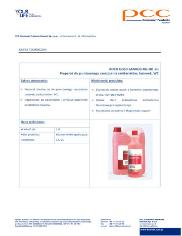 KARTA TECHNICZNA ROKO GOLD SANRUG RG-101 SG Preparat do gruntownego czyszczenia sanitariatów, łazienek, WC Zakres stosowania: Właściwości produktu: • Preparat kwaśny na do gruntownego czyszczenia • Skutecznie usuwa osady z kamienia wapiennego, łazienek, sanitariatów i WC. • Odpowiedni do powierzchni i armatur odpornych na działanie kwasów. uryny, rdzy oraz mydła • Usuwa stare zabrudzenia pochodzenia tłuszczowego i organicznego • Pozostawia przyjemny i długotrwały zapach Dane techniczne: Wartość pH 1,0 Kolor produktu Różowy lekko opalizujący Pojemność 1 L, 5L Zastosowanie i dozowanie Ostrzeżenia i postępowanie Ostrzeżenia: Produkt żrący. Powoduje oparzenia Do wszystkich powierzchni odpornych na działanie kwasów. Postępowanie: Przechowywać pod zamknięciem i chronić przed dziećmi. Unikać zanieczyszczenia oczu i skóry. Zanieczyszczone oczy natychmiast przemyć dużą ilością wody i zasięgnąć porady lekarza. Czyszczenie ręczne: 40-100 ml/10 L wody Zanieczyszczoną skórę przemyć natychmiast dużą ilością wody i zasięgnąć porady lekarza. Nosić odpowiednie rękawice ochronne. W razie połknięcia, 40-100 ml/10 L wody niezwłocznie zasięgnij porady lekarza – pokaż opakowanie lub etykietę. Produkt zawiera: kwas glikolowy. Czyszczenie maszynowe: 80 ml -1L/10 L wody Szczegółowe informacje znajdują się w karcie charakterystyki * dozowanie w zależności od stopnia zabrudzenia preparatu niebezpiecznego ROKO GOLD SANRUG RG-101 SG Przed stosowaniem preparatu nawierzchnię zwilżyć wodą. Zalecenia Preparat do zastosowań profesjonalnych. Zawsze używać zimnej wody. Nie stosować do kamieni wapiennych, aluminium, powierzchni lakierowanych i uszkodzonych powierzchni chromowanych. Nie mieszać ze środkami zawierającymi chlor. Po czyszczeniu nawierzchnię spłukać wodą. Informacje zawarte w niniejszej karcie technicznej podane są w dobrej wierze, w oparciu o aktualną wiedzę, doświadczenie wyniki badań. Zgodność parametrów dostarczonego wyrobu z niniejszą karta techniczną oraz przydatność wyrobu do zamierzonego zastosowania powinny być sprawdzone przed jego użyciem. Zastrzega się prawo wprowadzenie zmian do niniejszej karty technicznej będących skutkiem postępu.