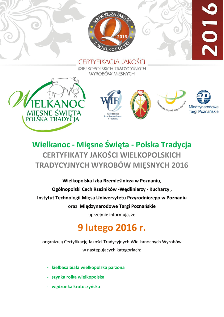Wielkanoc - Mięsne Święta - Polska Tradycja CERTYFIKATY JAKOŚCI WIELKOPOLSKICH TRADYCYJNYCH WYROBÓW MIĘSNYCH 2016 Wielkopolska Izba Rzemieślnicza w Poznaniu, Ogólnopolski Cech Rzeźników -Wędliniarzy - Kucharzy , Instytut Technologii Mięsa Uniwersytetu Przyrodniczego w Poznaniu oraz Międzynarodowe Targi Poznańskie uprzejmie informują, że 9 lutego 2016 r. organizują Certyfikację Jakości Tradycyjnych Wielkanocnych Wyrobów w następujących kategoriach: - kiełbasa biała wielkopolska parzona - szynka rolka wielkopolska - wędzonka krotoszyńska - kiełbasa polska wędzona - ogonówka wędzona - polędwica wędzona Celem Certyfikacji jest popularyzacja wyrobów mięsnych wyprodukowanych w oparciu o tradycyjne receptury i technologie. Uzyskane Certyfikaty mogą być wykorzystane do celów marketingowych dla zwiększenia sprzedaży wyrobów. Lista zamieszczona zostanie na stronie internetowej wraz z adresami sklepów, gdzie będzie można nabyć wyroby certyfikowane. Lista ta zostanie przekazana także mediom ogólnopolskim i wielkopolskim. Certyfikaty przyznawane są na okres 1 roku. Produkty oceniane będą przez kapitułę, złożoną z doświadczonych technologów, praktyków i ludzi nauki oraz kapitułę konsumencką. W skład kapituły nie będą wchodzili przedstawiciele firm, których wyroby poddawane będą ocenie. Oceniane będą: - wygląd i cechy zewnętrzne, - wygląd i cechy na przekroju, - ocena smakowa. INFORMACJE ORGANIZACYJNE Kapituła oceniać będzie wyroby 9 lutego 2016 (wtorek) w pawilonie nr 10 na terenie Międzynarodowych Targach Poznańskich, (wjazd od ul. Śniadeckich). Wyroby należy dostarczyć w godzinach 800 – 945 (hasło - „kiełbasa na konkurs”) Informacje dotyczące dostarczenia ilości wyrobów znajdują się w karcie zgłoszenia. Zgłoszenia udziału pisemne należy przesłać do dnia 29 stycznia 2016 r: - drogą pocztową na adres: Wielkopolska Izba Rzemieślnicza w Poznaniu, al. Niepodległości 2, 61-874 Poznań - fax: 61 852 13 16 - e-mailem: [email protected] Formularz zgłoszeń i regulaminu znajduje się na stronie internetowej: www.irpoznan.com.pl Istnieje również możliwość dosłania formularzy zainteresowanym producentom Koszt uczestnictwa w ocenie wynosi 300 zł + 23% VAT (369) od jednego wyrobu. Wpłatę należy dokonać na konto Wielkopolskiej Izby Rzemieślniczej w Poznaniu: Bank Zachodni WBK S.A. ul. Św. Marcin 8, 3 oddział w Poznaniu 75 1090 1359 0000 0000 3501 8443 do dnia 29 stycznia 2016 r. Szczegółowych informacji o Certyfikacji udzielają: - sprawy technologiczne - prof. dr hab. Włodzimierz Dolata, tel.: 605 591 286 e -mail: [email protected] - sprawy organizacyjne – Anna Jaszewska tel.: 61 859 35 33 e-mail: [email protected] - rzecznik prasowy - Marzena Rutkowska-Kalisz e-mail: [email protected] tel: 61 859 35 41 - Sekretariat WIR tel.: 61 859 35 34 e-mail: [email protected] Wręczenie przyznanych Certyfikatów odbędzie się 12 marca 2016 r. podczas VIII Ogólnopolskiego Spotkania Wielkanocnego Hodowców, Przetwórców i Handlowców Branży Mięsnej. Szczegółowe informacje otrzymają zainteresowani w terminie późniejszym. Certyfikacja Jakości Tradycyjnych Wielkopolskich Wędlin z roku na rok cieszy się coraz większym prestiżem nie tylko w branży, ale przede wszystkim wśród mediów. Dzięki temu przekazują one klientom wszechstronną informacje o tym jakie wyroby uzyskały potwierdzenia najwyższej jakości. A jak pokazują doświadczenia lat ubiegłych przybywa nam klientów świadomych tego, że warto kupować wyroby o potwierdzonej, najwyższej jakości! Warto zatem stanąć w szranki i zmierzyć się z innymi producentami by potwierdzić doskonałość własnych produktów. Patronat Honorowy obejmie: Minister Rolnictwa i Rozwoju Wsi - Krzysztof Jurgiel Wojewoda Wielkopolski - Zbigniew Hoffmann Marszałek Województwa Wielkopolskiego - Marek Woźniak Patronat Medialny: Polska Agencja Prasowa, Głos Wielkopolski, Radio Markury, WTK, Wielkopolski Rzemieślnik SERDECZNIE ZAPRASZAMY DO WZIĘCIA UDZIAŁU W CERTYFIKACJI JAKOŚCI 2016 !!! Przewodniczący Kapituły Dyrektor Izby prof. dr hab. Włodzimierz Dolata Tomasz Wika