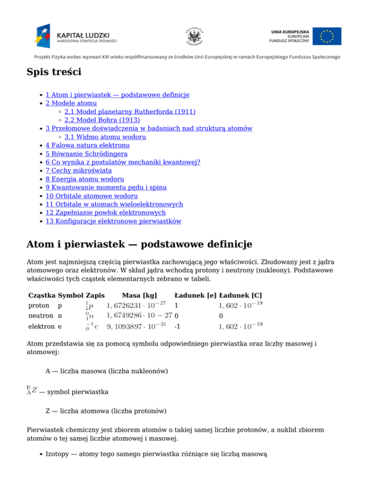 Spis treści 1 Atom i pierwiastek — podstawowe definicje 2 Modele atomu 2.1 Model planetarny Rutherforda (1911) 2.2 Model Bohra (1913) 3 Przełomowe doświadczenia w badaniach nad strukturą atomów 3.1 Widmo atomu wodoru 4 Falowa natura elektronu 5 Równanie Schrödingera 6 Co wynika z postulatów mechaniki kwantowej? 7 Cechy mikroświata 8 Energia atomu wodoru 9 Kwantowanie momentu pędu i spinu 10 Orbitale atomowe wodoru 11 Orbitale w atomach wieloelektronowych 12 Zapełnianie powłok elektronowych 13 Konfiguracje elektronowe pierwiastków Atom i pierwiastek — podstawowe definicje Atom jest najmniejszą częścią pierwiastka zachowującą jego właściwości. Zbudowany jest z jądra atomowego oraz elektronów. W skład jądra wchodzą protony i neutrony (nukleony). Podstawowe właściwości tych cząstek elementarnych zebrano w tabeli. Cząstka Symbol Zapis proton Masa [kg] Ładunek [e] Ładunek [C] p 1 neutron n 0 elektron e -1 0 Atom przedstawia się za pomocą symbolu odpowiedniego pierwiastka oraz liczby masowej i atomowej: A — liczba masowa (liczba nukleonów) — symbol pierwiastka Z — liczba atomowa (liczba protonów) Pierwiastek chemiczny jest zbiorem atomów o takiej samej liczbie protonów, a nuklid zbiorem atomów o tej samej liczbie atomowej i masowej. Izotopy — atomy tego samego pierwiastka różniące się liczbą masową Izobary — zbiory atomów o takiej samej liczbie masowej Izotony — zbiory atomów o takiej samej liczbie neutronów Odmiany alotropowe — odmiany tego samego pierwiastka różniące się liczbą atomów w cząsteczce (tlen i ozon) lub postacią krystaliczną (diament i grafit). Modele atomu Model atomu Rutherforda Model atomu Bohra Model atomu Schrödingera Modele zaproponowane przez Rutherforda i Bohra były oparte na prawach fizyki klasycznej Newtona. Mechanika klasyczna pozwala dokładnie określić położenie i pęd obiektów materialnych w każdym punkcie czasowym oraz przewiduje możliwość wzbudzenia ruchów translacyjnych, rotacyjnych i oscylacyjnych do dowolnych wartości energii pod wpływem przyłożenia siły. Model planetarny Rutherforda (1911) W centralnej części atomu znajduje się dodatnio naładowane jądro, dookoła którego krążą elektrony po torach kołowych lub eliptycznych. Model Bohra (1913) Elektron w atomie może przebywać w ściśle określonych stanach o określonej energii. Podczas przejścia elektronu ze stanu o wyższej energii (E2) do stanu o niższej energii (E1) następuje emisja energii, natomiast przejście ze stanu (E1) do stanu (E2) wymaga absorpcji energii E2 - E1 = hν Teoria Bohra wyjaśniała emisje fal świetlnych pozwalającą wytłumaczyć widmo emisyjne atomu wodoru oraz atomów wodoropodobnych (brak możliwości opisu pozostałych atomów). Przełomowe doświadczenia w badaniach nad strukturą atomów Elektryczne wyładowania w gazach Spektroskopia atomowa Efekt fotoelektryczny Widmo atomu wodoru Linie spektralne tworz grupy o zbliżonych długościach fal, zwane seriami (Lymana, Balmera, Paschena). Spektrum widzialne atomu wodoru (seria Balmera).Występowanie dyskretnych linii spektralnych wskazuje, że elektron w atomie może przyjmowad pewne określone energie. Efekt fotoelektryczny Wyładowania elektryczne w gazowym wodorze. Strumień elektronów rozszczepia cząsteczki wodoru i wzbudza powstające atomy do wyższych stanów energetycznych. Oddając nadmiar energii atomy emitują promieniowanie, które przechodząc przez pryzmat ulega załamaniu i na ekranie powstaje widmo liniowe gazu. Model prostego spektroskopu złożonego z kartonu ze szczeliną i pryzmatu. Falowa natura elektronu Louis de Broglie (1924) przypisał elektronom właściwości korpuskularne oraz falowe (dualizm korpuskularno-falowy) wyrażone wzorem gdzie m oznacza masę cząstki, v — prędkość , h — stałą Plancka. Doświadczalne potwierdzenie dualizmu elektronu nastąpiło w roku 1927, kiedy odkryto zjawisko dyfrakcji elektronów (C.J. Davisson, L.H. Germer). W przypadku cząstek elementarnych niemożliwe jest równoczesne dokładne określenie położenia i pędu (zasada nieoznaczoności Heisenberga). Zasada nieoznaczoności wyrażana jest w postaci gdzie jest miarą niedokładności oznaczenia współrzędnej określającej położenie cząstki, a miarą niedokładności oznaczenia pędu cząstki. Równanie Schrödingera Równanie Schrödingera opisuje ruch cząstek. Funkcja będąca jego rozwiązaniem, nazywana funkcją falową ( ), opisuje stan pojedynczej cząstki lub wielu cząstek. Kwadrat bezwzględnej wartości funkcji wokół jądra jest miarą gęstości elektronowej w różnych obszarach Dla atomu wodoru funkcje falowe można dokładnie wyznaczyć, jednak tylko niektóre z nich, tzw. funkcje porządne (ciągłe, jednoznaczne i przyjmujące wartości skończone), nadają się do wyrażenia prawdopodobieństwa napotkania elektronu. Co wynika z postulatów mechaniki kwantowej? Nie da się określić toru elektronu, lecz jedynie prawdopodobieństwo jego znalezienia w wybranym rejonie przestrzeni wokół jądrowej. Przyjmuje się, że elektron wytwarza chmurę ładunku ujemnego wokół jądra a kształt chmury zależy od stanu kwantowego. Ruch elektronu jest opisywany za pomocą równania Schrödingera, którego rozwiązaniem są funkcje falowe. Znajomość tych funkcji pozwala na obliczanie różnych wielkości związanych z ruchem elektronu. W zależności od wartości parametrów charakteryzujących stan elektronu wprowadzono umowną, trójstopniową klasyfikację stanów kwantowych: powłoki, podpowłoki, poziomy orbitalne. Cechy mikroświata Wielkości fizyczne związane z ruchem cząstki nie mogą przyjmować wartości dowolnych — są to wielkości skwantowane. W przypadku elektronu kwantowaniu podlega 5 parametrów ruchu: energia, orbitalny moment pędu, orientacja przestrzenna orbitalnego momentu pędu, spin, orientacja przestrzenna spinu. Stan elektronu określony za pomocą wartości po