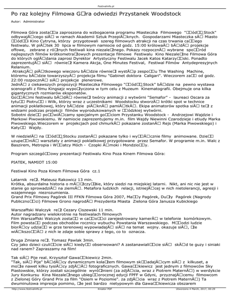 do których oglÄ…dania zaprosi Dyrektor Artystyczny Festiwalu Jacek Katos KatarzyÅ„ski. Ponadto