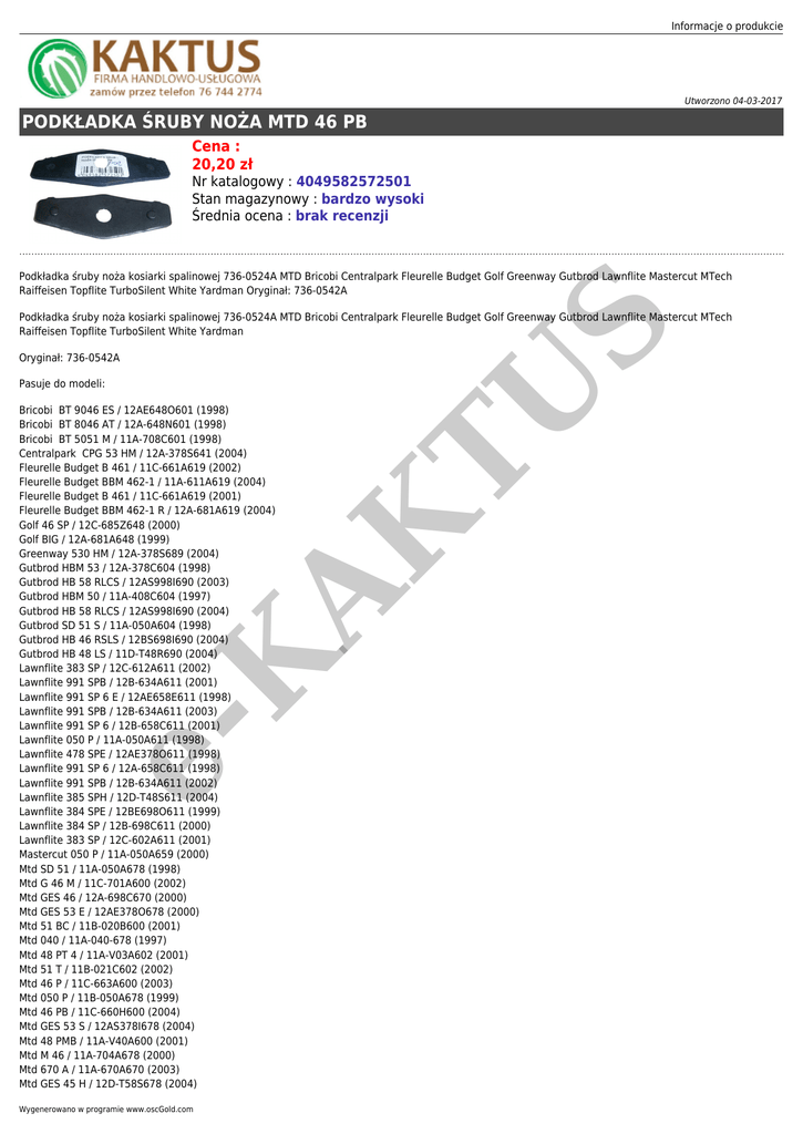 Informacje o produkcie Utworzono 04-03-2017 PODKŁADKA ŚRUBY NOŻA MTD 46 PB Cena : 20,20 zł Nr katalogowy : 4049582572501 Stan magazynowy : bardzo wysoki Średnia ocena : brak recenzji Podkładka śruby noża kosiarki spalinowej 736-0524A MTD Bricobi Centralpark Fleurelle Budget Golf Greenway Gutbrod Lawnflite Mastercut MTech Raiffeisen Topflite TurboSilent White Yardman Oryginał: 736-0542A S Podkładka śruby noża kosiarki spalinowej 736-0524A MTD Bricobi Centralpark Fleurelle Budget Golf Greenway Gutbrod Lawnflite Mastercut MTech Raiffeisen Topflite TurboSilent White Yardman Pasuje do modeli: AK TU Oryginał: 736-0542A eK Bricobi BT 9046 ES / 12AE648O601 (1998) Bricobi BT 8046 AT / 12A-648N601 (1998) Bricobi BT 5051 M / 11A-708C601 (1998) Centralpark CPG 53 HM / 12A-378S641 (2004) Fleurelle Budget B 461 / 11C-661A619 (2002) Fleurelle Budget BBM 462-1 / 11A-611A619 (2004) Fleurelle Budget B 461 / 11C-661A619 (2001) Fleurelle Budget BBM 462-1 R / 12A-681A619 (2004) Golf 46 SP / 12C-685Z648 (2000) Golf BIG / 12A-681A648 (1999) Greenway 530 HM / 12A-378S689 (2004) Gutbrod HBM 53 / 12A-378C604 (1998) Gutbrod HB 58 RLCS / 12AS998I690 (2003) Gutbrod HBM 50 / 11A-408C604 (1997) Gutbrod HB 58 RLCS / 12AS998I690 (2004) Gutbrod SD 51 S / 11A-050A604 (1998) Gutbrod HB 46 RSLS / 12BS698I690 (2004) Gutbrod HB 48 LS / 11D-T48R690 (2004) Lawnflite 383 SP / 12C-612A611 (2002) Lawnflite 991 SPB / 12B-634A611 (2001) Lawnflite 991 SP 6 E / 12AE658E611 (1998) Lawnflite 991 SPB / 12B-634A611 (2003) Lawnflite 991 SP 6 / 12B-658C611 (2001) Lawnflite 050 P / 11A-050A611 (1998) Lawnflite 478 SPE / 12AE378O611 (1998) Lawnflite 991 SP 6 / 12A-658C611 (1998) Lawnflite 991 SPB / 12B-634A611 (2002) Lawnflite 385 SPH / 12D-T48S611 (2004) Lawnflite 384 SPE / 12BE698O611 (1999) Lawnflite 384 SP / 12B-698C611 (2000) Lawnflite 383 SP / 12C-602A611 (2001) Mastercut 050 P / 11A-050A659 (2000) Mtd SD 51 / 11A-050A678 (1998) Mtd G 46 M / 11C-701A600 (2002) Mtd GES 46 / 12A-698C670 (2000) Mtd GES 53 E / 12AE378O678 (2000) Mtd 51 BC / 11B-020B600 (2001) Mtd 040 / 11A-040-678 (1997) Mtd 48 PT 4 / 11A-V03A602 (2001) Mtd 51 T / 11B-021C602 (2002) Mtd 46 P / 11C-663A600 (2003) Mtd 050 P / 11B-050A678 (1999) Mtd 46 PB / 11C-660H600 (2004) Mtd GES 53 S / 12AS378I678 (2004) Mtd 48 PMB / 11A-V40A600 (2001) Mtd M 46 / 11A-704A678 (2000) Mtd 670 A / 11A-670A670 (2003) Mtd GES 45 H / 12D-T58S678 (2004) Wygenerowano w programie www.oscGold.com eK S AK TU Mtd 48 PB / 11A-V10H600 (2004) Mtd 46 SP / 12C-685Z602 (2000) Mtd 51 TC / 11B-021C602 (2003) Mtd 51 B / 11B-020B602 (2001) Mtd 48 PM 4 / 11A-V44A600 (2001) Mtd SP 53 GHW / 12A-568R678 (2004) Mtd 698 C / 11A-698C670 (2003) Mtd FF 51 TSD / 11B-021C665 (2004) Mtd SD 51 / 11A-070A678 (1998) Mtd SP 46 GXL / 12B-X78C678 (2001) Mtd 48 SPT / 12A-V25V600 (2004) Mtd GE 48-5 / 11A-V08R602 (2003) Mtd 53 SPT / 12A-373N602 (2003) Mtd GES 53 E / 12AE378O678 (1999) Mtd 46 P / 11C-660A600 (2003) Mtd 46 SP / 12C-685Z600 (2001) Mtd 48 PB 4 / 11A-V04A600 (2001) Mtd GE 48-5 / 11A-V08R602 (2004) Mtd G 46 M / 11C-704A678 (2001) Mtd GES 45 Q / 12A-694E678 (1998) Mtd GE 45 / 11D-T14H678 (2004) Mtd GES 53 / 12A-378R678 (2003) Mtd 51 TC / 11B-021C600 (2005) Mtd M 46 / 11A-704A678 (1999) Mtd 46 SPT / 12C-685Z665 (2004) Mtd GES 53 S / 12AS378I678 (2003) Mtd 51 BC / 11B-020B600 (2002) MTech FF 51 TSD / 11A-051A605 (2002) MTech FF 51 BSD / 11A-050A605 (2002) Raiffeisen RB 46-4 / 11C-694H628 (2004) Raiffeisen RB 46-4 / 11C-694A628 (2002) Topflite 46 SP / 12A-681A649 (1999) TurboSilent 46 SP / 12C-685Z667 (2001) TurboSilent 51 TC / 11B-021C667 (2003) TurboSilent 46 PT / 11C-661A667 (2003) TurboSilent 46 SPB / 12A-680H667 (2004) White RD-21 / 12A-378C680 (2000) White RD-21 / 12A-378C679 (1999) Yardman YM 6521 SM / 12A-979L643 (2002) Yardman YM 6518 SXE / 12AE649E643 (1999) Yardman YM 5518 SX / 12A-X78N643 (2001) Yardman YM 6518 SXE / 12AE649M643 (2000) Yardman YM 6018 SPS / 12BS698I643 (2004) Yardman YM 5018 SX / 12A-648D643 (2000) Yardman YM 6021 SM / 12A-979C643 (1998) Yardman YM 6021 CS / 12AS999T643 (2002) Yardman YM 6021 CS / 12A-999T643 (2001) Yardman YM 6021 CS / 12AS998I643 (2005) Yardman YM 6021 M / 12A-959C643 (1998) Yardman YM 6521 SM / 12A-979L643 (2000) Yardman YM 4018 / 11A-674E643 (1998) Yardman YM 6018 R / 12AE659E643 (1999)