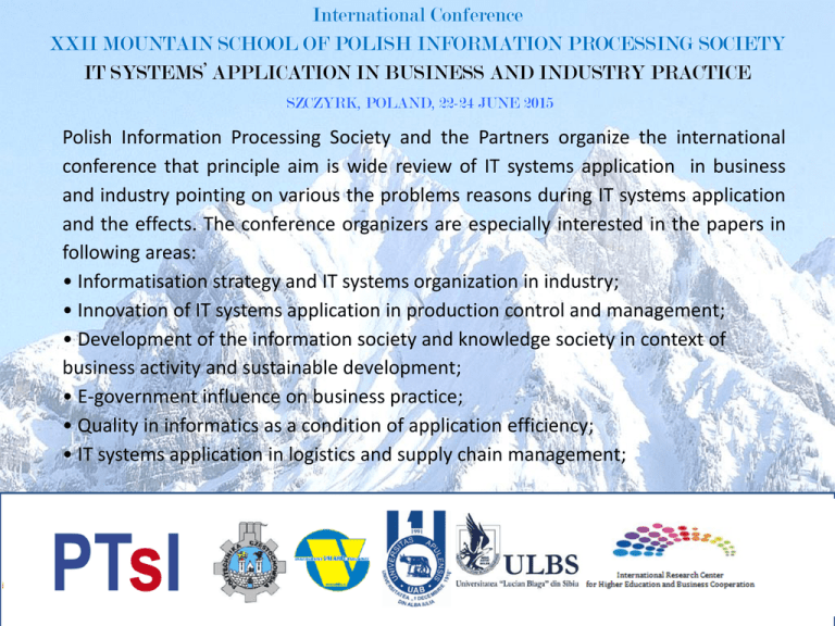 International Conference XXII MOUNTAIN SCHOOL OF POLISH INFORMATION PROCESSING SOCIETY IT SYSTEMS’ APPLICATION IN BUSINESS AND INDUSTRY PRACTICE SZCZYRK, POLAND, 22-24 JUNE 2015 Polish Information Processing Society and the Partners organize the international conference that principle aim is wide review of IT systems application in business and industry pointing on various the problems reasons during IT systems application and the effects. The conference organizers are especially interested in the papers in following areas: • Informatisation strategy and IT systems organization in industry; • Innovation of IT systems application in production control and management; • Development of the information society and knowledge society in context of business activity and sustainable development; • E-government influence on business practice; • Quality in informatics as a condition of application efficiency; • IT systems application in logistics and supply chain management; International Conference XXII MOUNTAIN SCHOOL OF POLISH INFORMATION PROCESSING SOCIETY SZCZYRK, POLAND, 22-24 JUNE 2015 SCIENTIFIC COMMITTEE: Achim Moise Ioan, Romania Bajdor Paula, Poland Bălan George, Romania Benabdelhafid Abdellatif, France Benmoussa Rachid, Morocco Brzezioski Stanisław, Poland Căbulea Lucia, Romania Cagápová Dagmar, Slovakia Chmielarz Witold, Poland Cimbala Roman, Slovakia Cioca Lucian, Romania Czarnacka-Chrobot Beata, Poland Dehombreux Pierre, Belgium Dima Ioan Constantin, Romania Dragolea Larisa, Romania Dragulănescu Nicolae, Romania Dudycz Helena, Poland Dziuba Dariusz, Poland Golioski Michał, Poland Gołuchowski Jerzy,, Poland Grabara Janusz, Poland Illés Béla, Hungary Jelonek Dorota, Poland Kadar Manuella, Romania Kiełtyka Leszek, Poland Kisielnicki Jerzy, Poland Kolcun Michal, Slovakia Korczak Jerzy, Poland Kot Sebastian, Poland Kubiak Bernard, Poland Kucęba Robert, Poland Lahcen El Hiki, Belgium Man Mariana, Romania Manole Alexandru, Romania Marinescu Emanuel, Romania Mihaescu Liviu, Romania Modrak Vladimir, Slovakia Moraru Roland, Romania Moreno-Gutiérrez Juan, Spain Noga Marian, Poland Novitzka Valerie, Slovakia Nowak Stefan, Poland Nowicka-Skowron Maria, Poland Olszak Celina, Poland Paștiu Carmen, Romania Pietrasieoski Paweł, USA Popa Maria, Romania Radu Sorin Mihai, Romania Sienkiewicz Piotr, Poland Sobczak Andrzej, Poland Stefko Robert, Slovakia Stegaroiu Ion, Romania Szpringer Włodzimierz, Poland Szyjewski Zdzislaw, Poland Ślusarczyk Beata, Poland Ulewicz Robert, Poland Vladutescu Stefan, Romania Wielki Janusz, Poland Ziemba Ewa, Poland International Conference XXII MOUNTAIN SCHOOL OF POLISH INFORMATION PROCESSING SOCIETY SZCZYRK, POLAND, 22-24 JUNE 2015 All papers will be submitted to the international scientific review process, after which they will be published in Journal of Applied Mechanics and Materials indexed in Scopus and WoS. The conditions for publishing in the journal are successful reviews. LOCAL ORGANIZING The leading topic is: „IT Systems’ Application in Business and Industry COMMITTEE: Practice” Janusz Grabara In details, Authors are invited to submit the papers of following areas: • Informatisation strategy, Sebastian Kot • IT in production control and management Bajdor Paula • Administration informatization Mariusz Sroka • Application integration and new trends in IT systems development, Joanna Tabor • Information society, Aleksandra Ptak • Informatics project management, Tomasz Lis • Methodology of IT systems application, Aneta Broniszewska • „Case study" in IT area Jacek Karcz • Knowledge management efficiency, • Informatics support in logistics processes and supply chain management Łukasz Pigoo International Conference XXII MOUNTAIN SCHOOL OF POLISH INFORMATION PROCESSING SOCIETY SZCZYRK, POLAND, 22-24 JUNE 2015 Publishing with participation: CONFERENCE CONTACTS: E-mail: [email protected] Tel.: 0048 – 34 3250 388 Fax: 0048 – 34 361 38 76 http://zim.pcz.pl/ms The conference fee includes the cost of organization and technical conference facilities, proceedings, conference materials, and refreshments during the meetings. Participants pay cost of accommodation and travel. The conference hotel will be specified, soon. Deadlines: Abstract submission and registration: 31 March, 2015 Full paper submission and payment: 20 May, 2015
