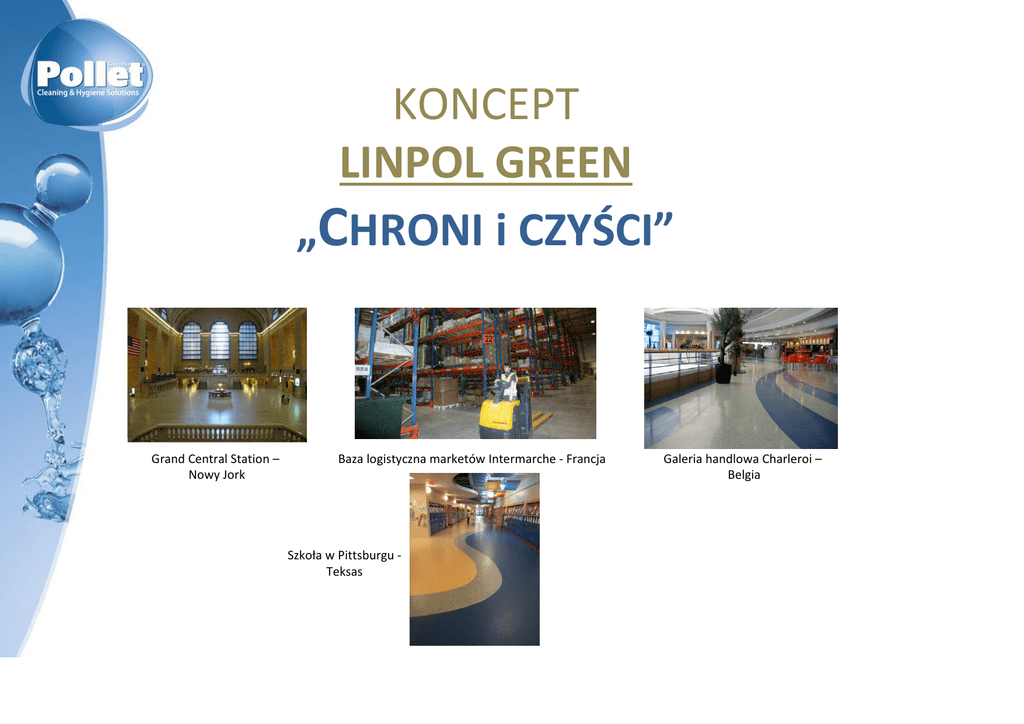 KONCEPT LINPOL GREEN „CHRONI i CZYŚCI” Grand Central Station – Nowy Jork Baza logistyczna marketów Intermarche - Francja Szkoła w Pittsburgu Teksas Galeria handlowa Charleroi – Belgia SEKTOR DZIAŁALNOŚCI KONCEPT LINPOL GREEN REFERENCJE DOZOWANIE ŚRODKA LINPOL GREEN Kilka referencji LINPOL GREEN DOZOWANIE ŚRODKA LINPOL GREEN SEKTOR DZIAŁALNOŚCI KONCEPT PODŁOŻA Twarde i miękkie podłoża: DYSTRYBUCJA DETALICZNA W HANDLU SPOŻYWCZYM GALERIE HANDLOWE I HOLE RECEPCYJNE MARKETY "ZRÓB TO SAM" MAGAZYNY, CENTRA LOGISTYCZNE ORAZ STREFY PRZEMYSŁOWE SEKTOR DZIAŁALNOŚCI Określenie sektora działalności systemu Linpol Green Silny, ale nieagresywny środek czyszczący, który tworzy naturalną powłokę ochronną dla podłoża Mydło roślinne obecne w środku Linpol Green zapewnia naturalną ochronę podłoża i zapobiega tym samym trwałemu przyczepianiu się brudu. Nadaje się do zabezpieczonych i niezabezpieczonych podłoży KONCEPT PODŁOŻA Cechy środka Linpol Green Definicja środka Linpol Green: co to właściwie jest? - - wyjątkowo skoncentrowane, w 100% naturalne mydło w płynie posiadające znak ekologiczny ECOLABEL Jest przeznaczony do ręcznego i mechanicznego czyszczenia podłoży TWARDE PODŁOŻA MIĘKKIE PODŁOŻA Pozwala na uniknięcie okresowego doczyszczania – czyści dogłębnie Pozwala na uniknięcie: - doczyszczania - nakładania wosków / polimerów Produkt tradycyjny SPRZĘT Linpol Green SPRZĘT ROBOCIZNA ROBOCIZNA 20 L o 18% mniej! LINPOL GREEN LINPOL GREEN to Linpol Green: jak to działa? => Tworzy powłokę, która jest łatwiejsza do czyszczenia i zapewnia czystość na dłużej. Rezultat: czyste podłoża, z większym połyskiem, wytwarzające mniej pyłu, przy jednoczesnym zachowaniu cech przeciwpoślizgowych nośnika. Proces ten jest: PROSTY ponieważ nie wymaga on ciężkich chemikaliów, Linpol jest wykorzystywany przy codziennym czyszczeniu maszyną myjącą (szorowarką) BEZPIECZNY dla użytkowników i dla środowiska, ponieważ środek Linpol Green posiada znak ekologiczny Ecolabel. LINPOL GREEN Linpol Green zapewnia ochronę i doprowadza do CZYSTOŚCI. Tydzień 1 Tydzień 2 Tydzień 3 Tydzień 4 Rezultat: Linpol Green naturalnie zatyka pory i jest usuwany i ponownie nakładany przy każdym czyszczeniu. Brud, jaki przyczepia się do błonki powstającej z mydła jest z łatwością usuwany z podłoża podczas codziennego czyszczenia za pomocą środka Linpol Green. Błyszcząca i czysta podłoga LINPOL GREEN Działanie Działanie mechaniczne: przejazd zmywarką do podłóg z czarnymi padami Działanie chemiczne: zastosowanie środka Linpol Green PRZED PO PRZED PO LINPOL GREEN Test na dwóch rodzajach twardego podłoża na powierzchniach dystrybucji detalicznej LINPOL GREEN Test namaczania Strefa namaczania LINPOL GREEN Test namaczania LINPOL GREEN Metoda namaczania LINPOL GREEN Rezultat: czyste i błyszczące podłoże Jak dozować? To proste: Badam twardość wody w chwili rozpoczęcia pracy i uzyskuję dokładną dozę środka Linpol Green… W jaki sposób sprawdzić dozowanie? To proste: Regularnie badam roztwór za pomocą paska pH. Jeżeli pH wynosi 9, to wszystko jest w porządku. DOZOWANIE ŚRODKA LINPOL GREEN Dozowanie produktów Oni stosują Linpol Green... Od miękkich podłoży czy parkietu... Kilka referencji … do twardych podłoży z ceramicznymi płytkami lub z betonu Uniwesytet Yale – Stany Zjednoczone Szkoła w Pittsburgu Teksas Galeria supermarketu Auchan - Francja Sklep Cora - Rumunia Sklep AlCampo - Hiszpania Produkt posiada certyfikat Ecolabel i jest stosowany w 40% hiper- i supermarketów we Francji. Kilka referencji Obecnie system Linpol jest uznawany na najlepszy sposób czyszczenia i konserwacji podłoży twardych. Firma ISS Aviation USA która stosuje produkt na 4 lotniskach nominowała Linpol do nagrody ISS Global Innovation Award. Detroit Airport – Floor Staf. Detroit Airport - Lobby. Kilka referencji Linpol Green zyskuje uznanie w wielu krajach, także w USA gdzie coraz powszechniej jest stosowany zamiast powłok polimerowych. Pozwala bowiem uzyskać stały efekt błyszczącej podłogi bez konieczności uciążliwego i kosztownego doczyszczania i woskowania. Nie wystarczy MYĆ, trzeba CZYŚCIĆ Dziękujemy Państwu za uwagę