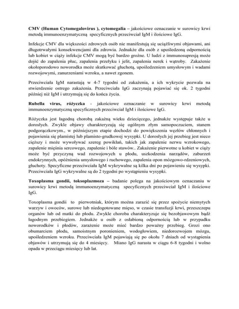 CMV (Human Cytomegalovirus ), cytomegalia – jakościowe oznaczanie w surowicy krwi metodą immunoenzymatyczną specyficznych przeciwciał IgM i ilościowe IgG. Infekcje CMV dla większości zdrowych osób nie manifestują się uciążliwymi objawami, ani długotrwałymi konsekwencjami dla zdrowia. Jednakże dla osób z upośledzoną odpornością lub kobiet w ciąży infekcje CMV mogą być bardzo groźne. U ludzi z immunosupresją może dojść do zapalenia płuc, zapalenia przełyku i jelit, zapalenia nerek i wątroby. Zakażenie okołoporodowo noworodka może skutkować głuchotą, upośledzeniem umysłowym i wadami rozwojowymi, zanurzeniami wzroku, a nawet zgonem. Przeciwciała IgM narastają w 4-7 tygodni od zakażenia, a ich wykrycie pozwala na stwierdzenie ostrego zakażenia. Przeciwciała IgG zaczynają pojawiać się ok. 2 tygodni później niż IgM i utrzymują się do końca życia. Rubella virus, różyczka - jakościowe oznaczanie w surowicy immunoenzymatyczną specyficznych przeciwciał IgM i ilościowe IgG. krwi metodą Różyczka jest łagodną chorobą zakaźną wieku dziecięcego, jednakże występuje także u dorosłych. Zwykle objawy charakteryzują się ogólnym złym samopoczuciem, stanem podgorączkowym., w późniejszym etapie dochodzi do powiększenia węzłów chłonnych i pojawienia się plamistej lub plamisto-grudkowej wysypki. U dorosłych jej przebieg jest nieco cięższy i może wywoływać szereg powikłań, takich jak zapalenie nerwu wzrokowego, zapalenie mięśnia sercowego, zapalenie i bóle stawów.. Zakażenie pierwotne u kobiet w ciąży może być przyczyną wad rozwojowych u płodu, uszkodzenia narządów, zaburzeń endokrynnych, opóźnienia umysłowego i ruchowego, zapalenia opon mózgowo-rdzeniowych, głuchoty. Specyficzne przeciwciała IgM wykrywalne są kilka dni po pojawieniu się wysypki. Przeciwciała IgG wykrywalne są do 2 tygodni po wystąpieniu wysypki. Toxoplasma gondii, toksoplazmoza – badanie polega na jakościowym oznaczaniu w surowicy krwi metodą immunoenzymatyczną specyficznych przeciwciał IgM i ilościowe IgG. Toxoplasma gondii to pierwotniak, którym można zarazić się przez spożycie niemytych warzyw i owoców, surowe lub niedogotowane mięso, w czasie transfuzji krwi, przeszczepu organów lub od matki do płodu. Zwykle choroba charakteryzuje się bezobjawowym bądź łagodnym przebiegiem. Jednakże u osób z osłabioną odpornością lub w przypadku noworodków i płodów, zarażenie może mieć bardzo poważny przebieg. Grozi ono obumarciem płodu, samoistnym poronieniem, wodogłowiem, niedorozwojem mózgu, upośledzeniem wzroku. Przeciwciała IgM pojawiają się po okołu 7 dniach od wystąpienia objawów i utrzymują się do 4 miesięcy. Miano IgG narasta w ciągu 6-8 tygodni i wolno opada w przeciągu miesięcy lub lat.