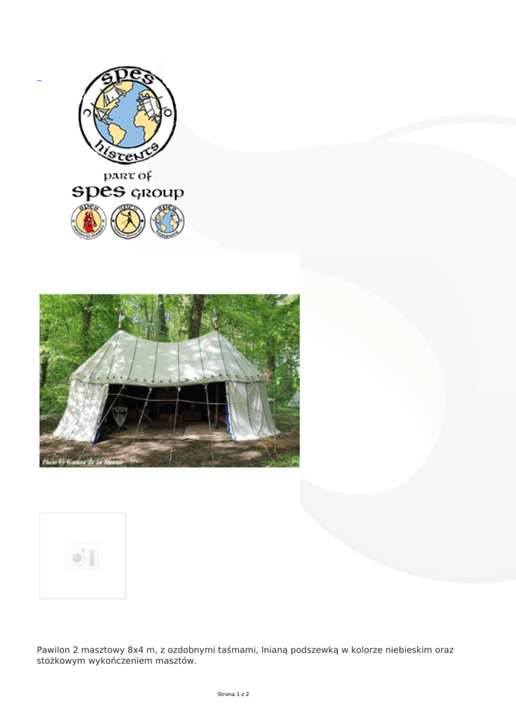 Pawilon 2 masztowy 8x4 m, z ozdobnymi taśmami, lnianą podszewką w kolorze niebieskim oraz stożkowym wykończeniem masztów. Strona 1 z 2 Na masztach można zawiesić chorągiewki, a środek namiotu podzielić zasłonami na pomieszczenia (zasłony za dopłatą). Konstrukcja oparta na odciągach. Zestaw zawiera: - pięcioczęściową płachtę namiotową (dach, 2xściany, 2xwejście) - 2 dwuczęściowe maszty o wysokości 350cm - 2 drewniane kulki na maszty - 2 drewniane promienie na chorągiewki - 56 szpil + 2 zapasowe - 2 worki na szpile - worek na namiot - komplet metalowych elementów służących do łączenia masztów - 52 drewniane kołki służące do mocowania ścian oraz lin odciągowych - 2 liny przeciwhuraganowe, każda o długości 15 m - 26 długich lin odciągowych, każda o długości 4 m - 26 krótkich lin odciągowych, każda o długości 1,5m (mocowanych do długich lin odciągowych) Strona 2 z 2