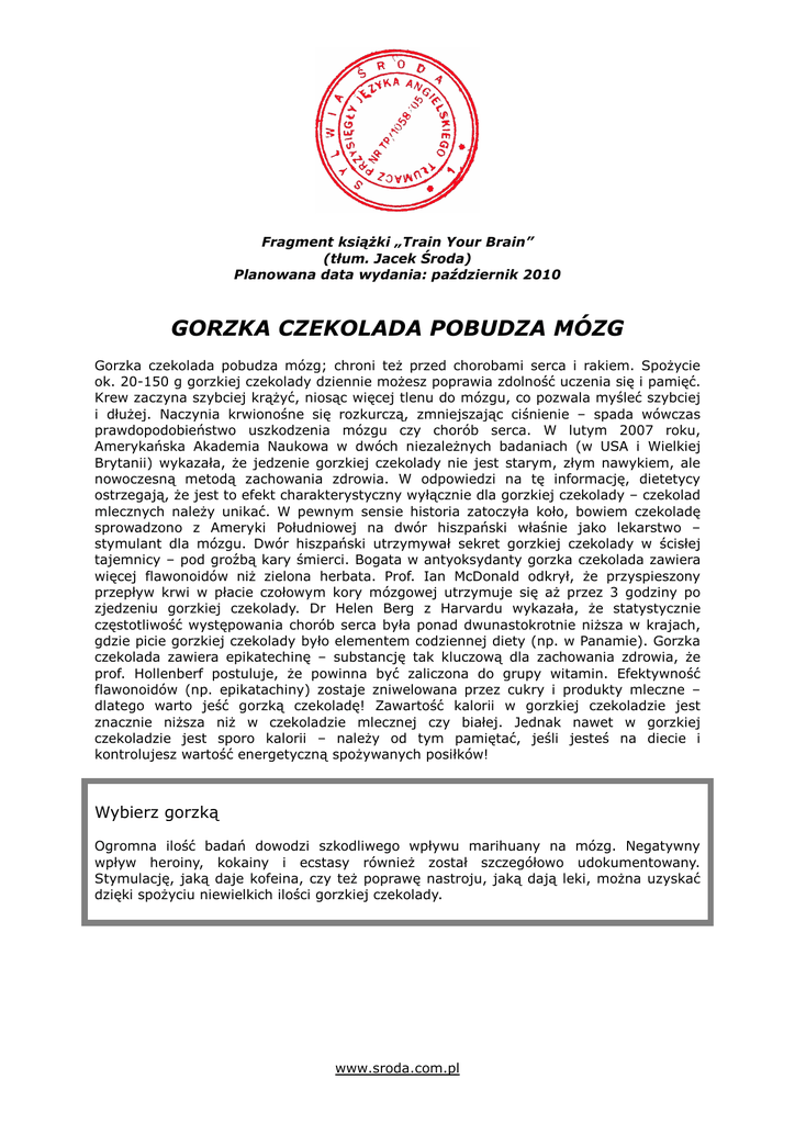 Fragment ksiąŜki „Train Your Brain” (tłum. Jacek Środa) Planowana data wydania: październik 2010 GORZKA CZEKOLADA POBUDZA MÓZG Gorzka czekolada pobudza mózg; chroni teŜ przed chorobami serca i rakiem. SpoŜycie ok. 20-150 g gorzkiej czekolady dziennie moŜesz poprawia zdolność uczenia się i pamięć. Krew zaczyna szybciej krąŜyć, niosąc więcej tlenu do mózgu, co pozwala myśleć szybciej i dłuŜej. Naczynia krwionośne się rozkurczą, zmniejszając ciśnienie – spada wówczas prawdopodobieństwo uszkodzenia mózgu czy chorób serca. W lutym 2007 roku, Amerykańska Akademia Naukowa w dwóch niezaleŜnych badaniach (w USA i Wielkiej Brytanii) wykazała, Ŝe jedzenie gorzkiej czekolady nie jest starym, złym nawykiem, ale nowoczesną metodą zachowania zdrowia. W odpowiedzi na tę informację, dietetycy ostrzegają, Ŝe jest to efekt charakterystyczny wyłącznie dla gorzkiej czekolady – czekolad mlecznych naleŜy unikać. W pewnym sensie historia zatoczyła koło, bowiem czekoladę sprowadzono z Ameryki Południowej na dwór hiszpański właśnie jako lekarstwo – stymulant dla mózgu. Dwór hiszpański utrzymywał sekret gorzkiej czekolady w ścisłej tajemnicy – pod groźbą kary śmierci. Bogata w antyoksydanty gorzka czekolada zawiera więcej flawonoidów niŜ zielona herbata. Prof. Ian McDonald odkrył, Ŝe przyspieszony przepływ krwi w płacie czołowym kory mózgowej utrzymuje się aŜ przez 3 godziny po zjedzeniu gorzkiej czekolady. Dr Helen Berg z Harvardu wykazała, Ŝe statystycznie częstotliwość występowania chorób serca była ponad dwunastokrotnie niŜsza w krajach, gdzie picie gorzkiej czekolady było elementem codziennej diety (np. w Panamie). Gorzka czekolada zawiera epikatechinę – substancję tak kluczową dla zachowania zdrowia, Ŝe prof. Hollenberf postuluje, Ŝe powinna być zaliczona do grupy witamin. Efektywność flawonoidów (np. epikatachiny) zostaje zniwelowana przez cukry i produkty mleczne – dlatego warto jeść gorzką czekoladę! Zawartość kalorii w gorzkiej czekoladzie jest znacznie niŜsza niŜ w czekoladzie mlecznej czy białej. Jednak nawet w gorzkiej czekoladzie jest sporo kalorii – naleŜy od tym pamiętać, jeśli jesteś na diecie i kontrolujesz wartość energetyczną spoŜywanych posiłków! Wybierz gorzką Ogromna ilość badań dowodzi szkodliwego wpływu marihuany na mózg. Negatywny wpływ heroiny, kokainy i ecstasy równieŜ został szczegółowo udokumentowany. Stymulację, jaką daje kofeina, czy teŜ poprawę nastroju, jaką dają leki, moŜna uzyskać dzięki spoŜyciu niewielkich ilości gorzkiej czekolady. www.sroda.com.pl Gorzka czekolada a nauka Błaganie serca Magnez zawarty w gorzkiej czekoladzie jest niezbędny do obniŜenia krzepliwości krwi. Dzięki temu serce będzie mogło dopompować więcej tlenu do mózgu. To z kolei nie tylko przyspieszy procesy myślowi i zapewni mózgowi energię, ale takŜe ochroni mózg przed uszkodzeniami spowodowanymi wysokim ciśnieniem. Jednym z najprostszych sposobów uzupełniania magnezu jest spoŜycie gorzkiej czekolady (Jensen). Gorzka czekolada przynosi ulgę w depresji Gorzka czekolada zawiera inhibitory monoaminooksydazy (MAOI). Dzięki nim w mózgu wysoki poziom serotoniny i dopaminy utrzymuje się dłuŜej, poprawiając jednocześnie nasz humor i zapewniając nam dobre samopoczucie. Gorzka czekolada: nowa witamina Wolne rodniki atakują i utleniają DNA w mózgu. Tworzą się wtedy miejsca, w których moŜe rozwijać się rak; przyczyniają się teŜ do przedwczesnego starzenia się. Według Cheng Lee z Cornell University, gorzka czekolada obfituje w antyoksydanty, zwane flawonoidami. Flawonoidy oczyszczają mózg z wolnych rodników. Gorzka czekolada zawiera dwa razy więcej antyoksydantów flawonoidowych niŜ czerwone wino i trzy razy więcej niŜ zielona herbata. Flawonoidy zawarte w gorzkiej czekoladzie przeciwdziałają równieŜ sklejaniu płytek krwi – w ten sposób chronią przed uszkodzeniem mózgu w wyniku wylewu. Badania Lee wykazały, Ŝe jedna filiŜanka gorzkiej czekolady zawiera aŜ 600 mg flawonoidowej epikatechiny. Gorzka czekolada lepsza niŜ brokuły Ministerstwo rolnictwa USA porównało wyniki ORAC (zdolności pochłaniania wolnych rodników tlenowych) takich pokarmów jak szpinak, czarne jagody, brokuły z wynikami gorzkiej czekolady: Brokuły Kiełki lucerny Śliwki Kiełki Maliny Szpinak Truskawki JarmuŜ i kapusta Czarne jagody Borówka amerykańska Gorzka czekolada 890 930 949 980 1 220 1 260 1 540 1 770 1 036 2 400 13 120 www.sroda.com.pl Gorzka czekolada: „kop” bezpieczniejszy niŜ kofeina SpoŜycie gorzkiej czekolady, która zawiera teobrominę, podwyŜsza prędkość myślenia. Gorzka czekolada praktycznie nie zawiera kofeiny (która moŜe dać mózgowi krótkotrwały zastrzyk energii, ale wywołuje teŜ efekt zmęczenia i charakteryzuje się długofalowymi skutkami ubocznymi). Gorzka czekolada zawiera ok. 21% teobrominy. Teobromina stymuluje mózg poprzez rozluźnienie mięśni, pozwalając na rozszerzenie Ŝył i tętnic. Wtedy krew łatwiej dociera do mózgu. Wpływ teobrominy jest łagodniejszy i trwalszy niŜ efekt działania kofeiny. Wpływ teobrominy utrzymuje się w organizmie cztery razy dłuŜej i jest znacznie łagodniejszy dla serca. Teobromina jest przepisywana pacjentom jako sposób obniŜenia ciśnienia, zaś kofeina zagraŜa zdrowiu pacjentów z problemami sercowymi – kofeina podnosi ciśnienie krwi, co moŜe potencjalnie doprowadzić do uszkodzeń mózgu. Weź się w garść Gorzka czekolada zawiera PEA (fenyloetyloaminę). PEA aktywuje neuroprzekaźniki w mózgu, które odpowiedzialne są za uwagę, koncentrację i czujność. Poziom PEA wzrasta w sposób naturalny – bez czekoladowego wsparcia – za kaŜdym razem, kiedy oglądasz wciągający film, czytasz pasjonującą ksiąŜkę, oglądasz waŜny mecz. PodwyŜszony poziom PEA sprawia, Ŝe tracisz poczucie czasu. Dlatego czas tak szybko p
