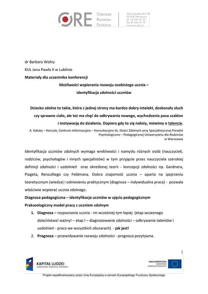 dr Barbara Wolny KUL Jana Pawła II w Lublinie Materiały dla uczestnika konferencji Możliwości wspierania rozwoju osobistego ucznia – identyfikacja zdolności uczniów Dziecko zdolne to takie, które z jednej strony ma bardzo dobry intelekt, doskonały słuch czy sprawne ciało, ale też ma chęć do odkrywania nowego, wychodzenia poza szablon i motywację do działania. Dopiero gdy to się nałoży, mówimy o talencie. A. Kałuby – Korczak, Centrum Informacyjno – Konsultacyjne ds. Dzieci Zdolnych przy Specjalistycznej Poradni Psychologiczno – Pedagogicznej Uniwersytetu dla Rodziców w Warszawie Identyfikacja uczniów zdolnych wymaga wnikliwości i namysłu różnych osób (nauczycieli, rodziców, psychologów i innych specjalistów) w tym przyjęcie przez nauczyciela szerokiej definicji zdolności i uzdolnień oraz określonej teorii - koncepcji zdolności np. Gardnera, Piageta, Renzulliego czy Feldmana. Dobra znajomość ucznia – oparta na spojrzeniu teoretycznym (wiedza) i odniesieniu praktycznym (diagnoza – indywidualna praca) - pozwala właściwie wspierać ucznia zdolnego. Diagnoza pedagogiczna – identyfikacja uczniów w ujęciu pedagogicznym Prakseologiczny model pracy z uczniem zdolnym 1. Diagnoza – rozpoznanie ucznia - im wcześniej tym lepiej (etap wczesnego dzieciństwa! ważny! – etap I – diagnozowanie zdolności – odkrywanie talentów i uzdolnień - praca we wszystkich obszarach) - jak jest! 2. Prognoza – przewidywanie rozwoju zdolności - prognoza pozytywna. 1 Projekt współfinansowany przez Unię Europejską w ramach Europejskiego Funduszu Społecznego 3. Programowanie – planowanie pracy - formy, metody, środki - ewaluacja– opracowanie „ciekawej” oferty dostosowanej do konkretnego ucznia lub grupy uczniów. 4. Realizacja – monitorowanie zdolności – „trzymanie ręki na pulsie”. 5. Ewaluacja – diagnoza końcowa – kontrolna - co się zmieniło! Przykłady dobrej praktyki Wsparcie ucznia zdolnego – diagnoza podstawą identyfikacji i rozwoju uzdolnień ucznia Scenariusz zajęć pozalekcyjnych dla uczniów klasy pierwszej wykorzystujący teorię inteligencji wielorakich Howarda Gardnera ukierunkowany na rozwijanie i wspieranie mocnych i słabych stron ucznia Temat zajęć: W świecie bajek – z wizytą u „Czerwonego Kapturka” Cel główny: rozwijanie zdolności i zainteresowań, w tym twórczego myślenia poprzez uczenie się zgodne z indywidualnym profilem inteligencji. Nauka przez zabawę. Cele operacyjne: Uczeń potrafi: wykorzystać swoje mocne i słabe strony w czasie wykonywania zadań, twórczo rozwiązywać zadanie w obszarze Ośrodka Zainteresowań, samodzielnie wykonać polecenie nauczyciela, aktywnie współdziałać w grupie. Metody nauczania: praca z tekstem, rozmowa, dyskusja, pokaz, zajęcia rytmizujące, gry i zabawy, elementy dramy, praca indywidualna, grupowa, obserwacja. Pomoce dydaktyczne: ilustracja lasu, papierowe opaski - maski, odtwarzacz płyt CD oraz pomoce edukacyjne w poszczególnych Ośrodkach Zainteresowań: książeczki Logico, korale matematyczne, materiały plastyczne, podkłady muzyczne, kartoniki z napisami do poszczególnych elementów zajęć. Przebieg zajęć: 2 Projekt współfinansowany przez Unię Europejską w ramach Europejskiego Funduszu Społecznego Rozpoczęcie zajęć. Powitanie przez maskotkę Myszkę: Witam Was 2x, jak się dzisiaj czujecie? Ja czuję się dobrze i zapraszam Was do wspólnej naukowej zabawy. A Ty, np. Aniu jak się dzisiaj czujesz? (pacynka zwraca się kolejno do dzieci). Pozytywne wzmacnianie samopoczucia uczniów. Wytworzenie sytuacji inspirującej uczniów do zajęć: Przygotowanie scenerii do zajęć np. kolorowa duża ilustracja lasu – w oddali domek babci, wykonana przez nauczyciela – wyeksponowana w centralnym miejscu sali. 1. Dzieci siedzą w kręgu. Maskotka przedstawia zagadkę: Kto to taki, czy poznacie? Przez zielony las do babci idzie drogą mała dziewczynka. Czerwoną ma czapeczkę, a w koszyczku smakołyki, czy już wiecie??? Czy zgadniecie … o uwaga wilk się skrada … tak już wiecie??? … ta dziewczynka to…. (Czerwony Kapturek). 2. Zaproszenie do zajęć – podanie tematu. Dzisiaj przeniesiemy się do bajkowej krainy. Nauczyciel pokazuje wyeksponowane opaski - maski bajkowych postaci: Czerwonego Kapturka, mamy, babci, wilka, leśniczego. Wzorcowe czytanie bajki przez nauczyciela. Chętne dzieci (w maskach) w czasie czytania bajki przedstawiają ruchem zachowanie np. Czerwonego Kapturka (improwizacja). (Tekst bajki znajduje się w książeczce Logico). 3. Rozmowa na temat bajki, omówienie treści, np. „Kto występuje w bajce”? Szukanie podpisów do poszczególnych postaci: Czerwony Kapturek, mama, babcia, wilk, leśniczy. Umieszczenie masek i podpisów na tablicy flanelowej (sprawdzanie rozumienia czytanego tekstu). 4. Praca w Ośrodkach Zainteresowań: I zespół (inteligencja językowa) – Uczniowie układają historyjkę obrazkową pt. „Droga Czerwonego Kapturka do domku babci”. Na stoliku znajdują się przygotowane ilustracje, zadaniem dzieci jest ułożenie ich w odpowiedniej kolejności. Jedna kartka jest pusta – dzieci wymyślają zakończenie np. Powrót Czerwonego Kapturka do domu – wspólnie wykonują rysunek. Dopasowanie tytułów do obrazków (uczniowie na przygotowanych paskach papieru piszą tytuły do ilustracji). Następnie numerują poszczególne ilustracje według kolejności 3 Projekt współfinansowany przez Unię Europejską w ramach Europejskiego Funduszu Społecznego zdarzeń (wzmacnianie inteligencji językowej, matematyczno – logicznej , plastycznej, intrapersonalnej i interpersonalnej). Uczniowie w grupie mają do dyspozycji książeczkę „Czytamy bajki - Czerwony Kapturek”(Logico Piccolo). II zespół (inteligencja matematyczno – logiczna) –Układanie z figur geometrycznych kwiatów, które Czerwony Kapturek zerwał dla babci. Następnie uczniowie wykonują zadania w dwóch grup