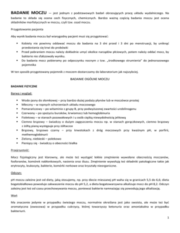 BADANIE MOCZU — jest jednym z podstawowych badao obrazujących pracę układu wydalniczego. Na badanie to składa się ocena cech fizycznych, chemicznych. Bardzo ważną częścią badania moczu jest ocena składników morfotycznych w moczu, czyli tzw. osad moczu. Przygotowanie pacjenta Aby wynik badania moczu był wiarygodny pacjent musi się przygotowad: Kobiety nie powinny oddawad moczu do badania na 3 dni przed i 3 dni po menstruacji, by uniknąd przedostania się krwi do probówki Przed pobraniem moczu należy dokładnie umyd okolice narządów płciowych, potem należy oddad mocz, by bakterie nie sfałszowały wyniku. Do badania mocz pobieramy po odpoczynku nocnym z tzw. „środkowego strumienia” do jednorazowego pojemnika W ten sposób przygotowany pojemnik z moczem dostarczamy do laboratorium jak najszybciej. BADANIE OGÓLNE MOCZU BADANIE FIZYCZNE Barwa i wygląd: Wodo-jasny do słomkowej – przy bardzo dużej podaży płynów lub w moczówce prostej Mleczny – w ropnych schorzeniach układu moczowego Pomaraoczowy – po witaminie z grupy B, przy podwyższonej zwartości urobilinogenu Czerwony – po spożyciu buraków, krwiomocz lub hemoglobinuria Fioletowy – w stanach pozawałowych i u osób ciężką niewydolnością jelitową Ciemno brązowy – świadczy o dużym zagęszczeniu moczu np. w stanach gorączkowych, ciemno brązowy z żółtą pianą występuje przy żółtaczce Brązowy, brązowo czarny – przy krwotokach z dróg moczowych przy kwaśnym pH, w porfirii, methemoglobinurii Zielony, niebieski – polekowo Pieniący się - świadczy o obecności białka Przejrzystośd: Mocz fizjologiczny jest klarowny, ale może też wystąpid lekkie zmętnienie wywołane obecnością moczanów, fosforanów, komórek nabłonkowych, nasienia oraz śluzu. Zmętnienie wywołują też składniki patologiczne takie jak erytrocyty, leukocyty, bakterie, komórki nerkowe oraz kryształy nieorganiczne. Odczyn: pH moczu zależne jest od diety, jaką stosujemy, np. przy diecie mieszanej pH waha się w granicach 5,5 do 6,6; dieta bogatobiałkowa powoduje zakwaszenie moczu do pH 5,2, a dieta bogatowarzywna alkalizuje mocz do pH 8,2. Odczyn zależny jest też od czasu przechowywania moczu, ponieważ bakterie namnażając się powodują jego alkalizację. Woo Ma znaczenie jedynie w przypadku świeżego moczu, normalnie określana jest jako swoista, ale może też byd aromatyczna (owocowa) w przypadku cukrzycy, której towarzyszy ketonuria oraz amoniakalna w przypadku bakteriurii. 1 Ciężar właściwy: Zależny jest od składników wydalanych z moczem oraz od ilości spożywanych płynów.Skład normalnego moczu BADANIE CHEMICZNE 1. Białko jest składnikiem, które ulega przesączaniu kłębuszkowemu w nerkach w bardzo niewielkim stopniu (150 mg/dobę).Jeśli się pojawia w moczu należy szybko znaleźd przyczynę. Wyróżniamy kilka przyczyn białkomoczu (proteinurii): białkomocz fizjologiczny: Przegrzanie lub gwałtowne ochłodzenie organizmu Trzeci trymestr ciąży Duży wysiłek białkomocz patologiczny: choroby układu moczowego: kamica nerkowa, odmiedniczkowe zapalenie nerek, zapalenie kłębuszków nerkowych niewydolnośd układu krążenia nadciśnienie tętnicze zatrucie związkami nefrotoksycznymi choroby przebiegające z gorączką 2. Glukoza jest całkowicie resorbowana przez kanaliki nerkowe jeśli jej stężenie w surowicy nie przekracza 180 mg/dl. W przypadku gdy stężenie jej jest wyższe mamy do czynienia z glukozurią pozanerkową. Inną przyczyną pojawienia się glukozy w moczu może byd uszkodzenie kanalików nerkowych. 3. Ciała ketonowe pochodzą z przemian metabolicznych. Są to kwas hydroksymasłowy, aceton oraz kwas acetooctowy. Ciała ketonowe w moczu mogą pojawid się w następujących przyczyn: Kwasicy cukrzycowej Głodówce lub drastycznych kuracjach odchudzających Diecie ubogowęglowodanowej Diecie bogato-tłuszczowej Uporczywych wymiotach Gorączce Zatruciu ciążowym Biegunkach BADANIE OSADU MOCZU Badanie osadu moczu przeprowadza się na specjalnie przygotowanym moczu. Mocz odwirowuje się przy 2000 obrotów na minutę (RPM) przez 10 minut. Mocz znad osadu (supernatant) zlewa się pozostawiając 0,5 ml moczu, następnie należy dokładnie wymieszad i wykonad preparat mikroskopowy. Osad moczu oglądamy przeglądowo pod powiększeniem 10x10, a następnie 10x40, gdzie ocenia się jakościowo , półilościowo i ilościowo wszystkie składniki morfotyczne osadu. Zaliczamy do nich: nabłonki płaskie, leukocyty, erytrocyty, wałeczki oraz składniki mineralne, których obecnośd jest uwarunkowana odczynem moczu, a także bakterie i śluz. Mogą też się pojawiad składniki normalnie nie występujące w moczu, ale będące zanieczyszczeniem jak np. plemniki, dlatego tak ważne jest przygotowanie się do badania. http://pl.wikipedia.org/wiki/Badanie_moczu 2